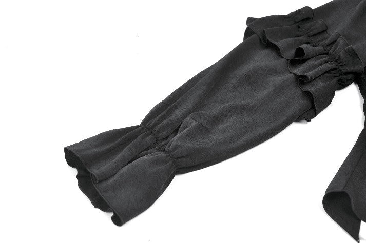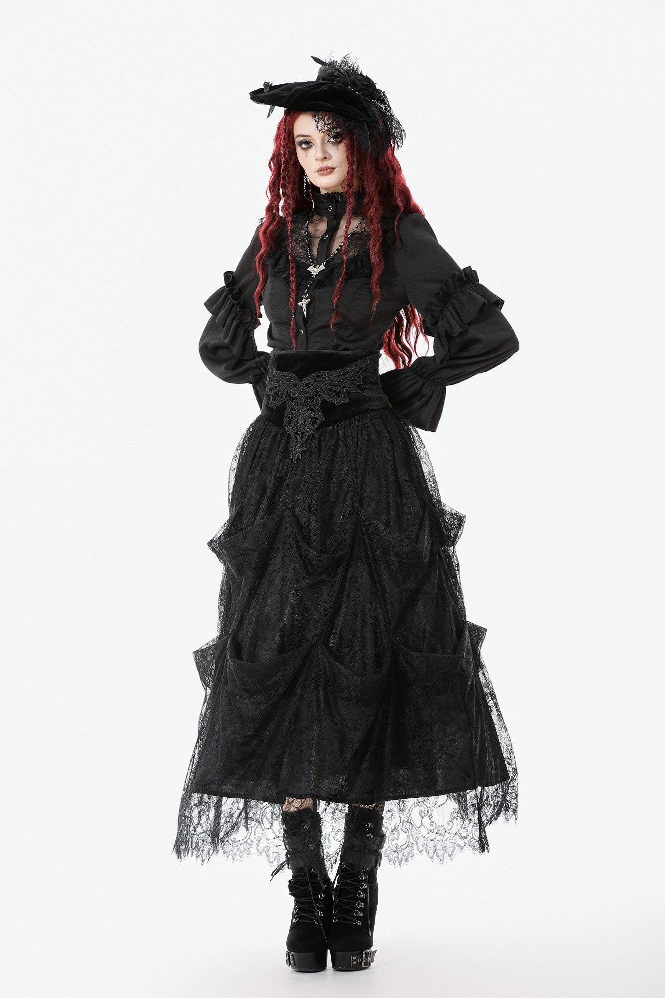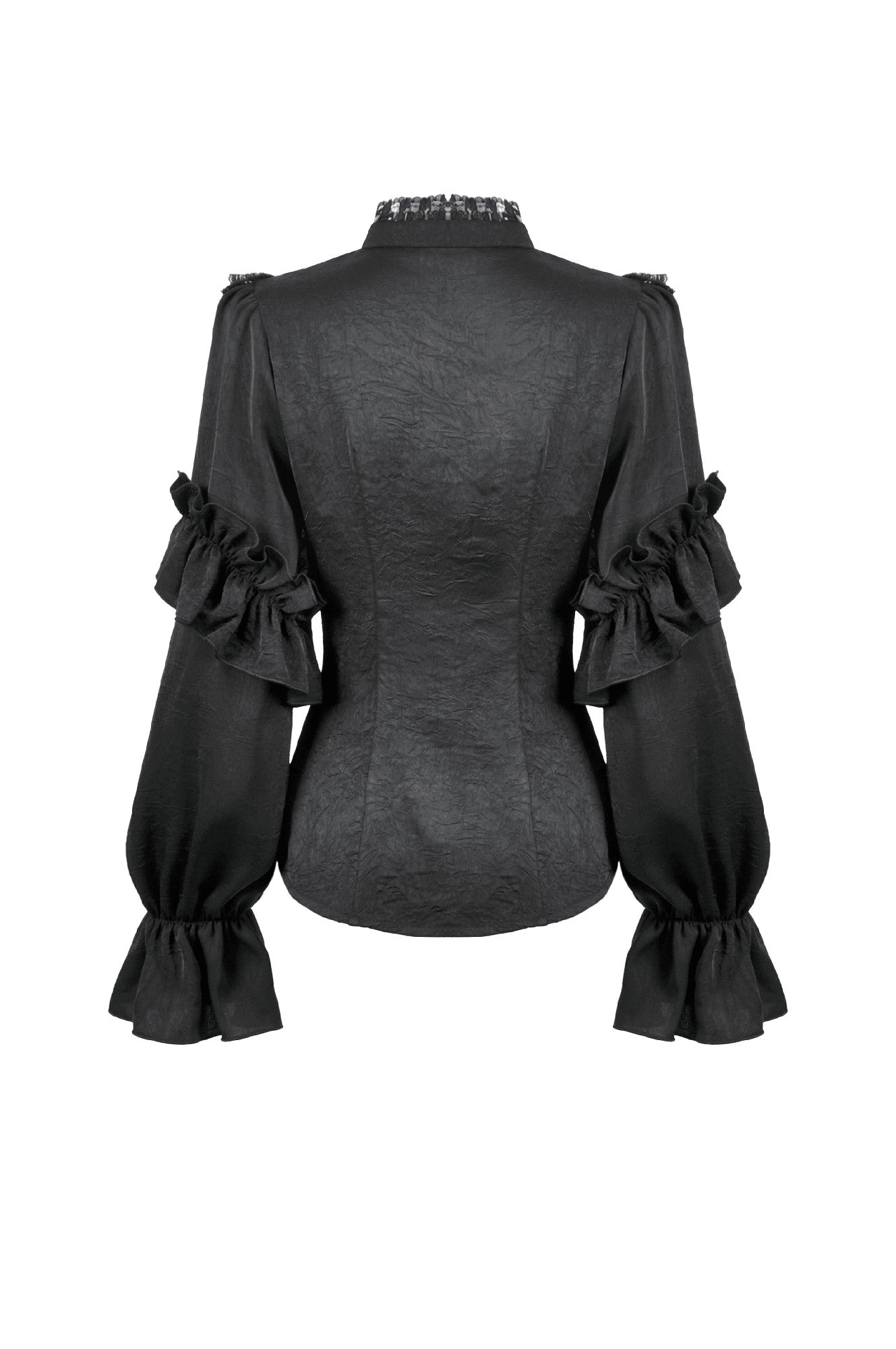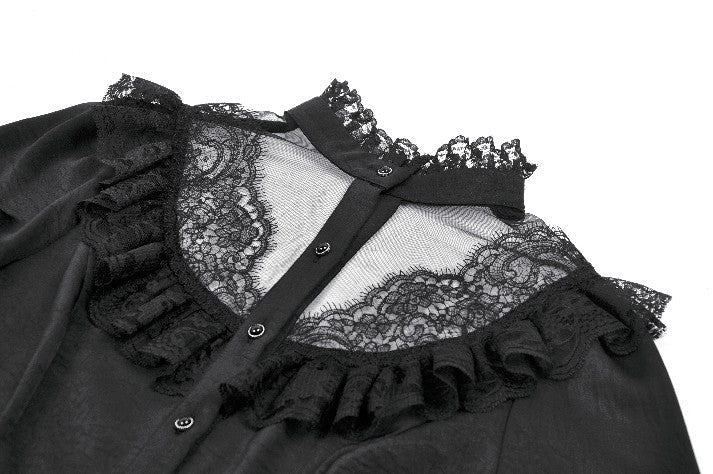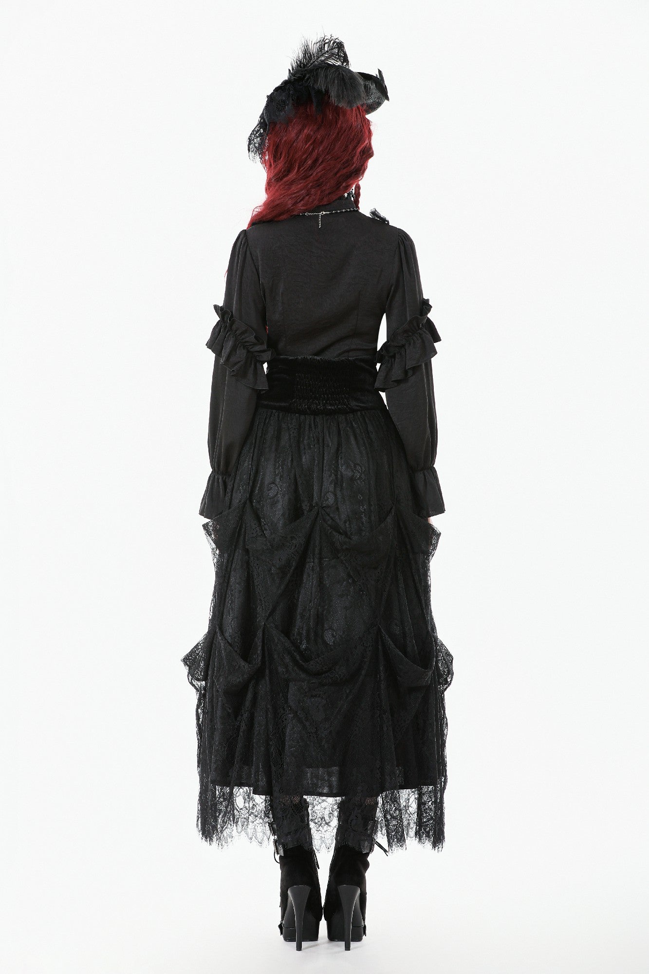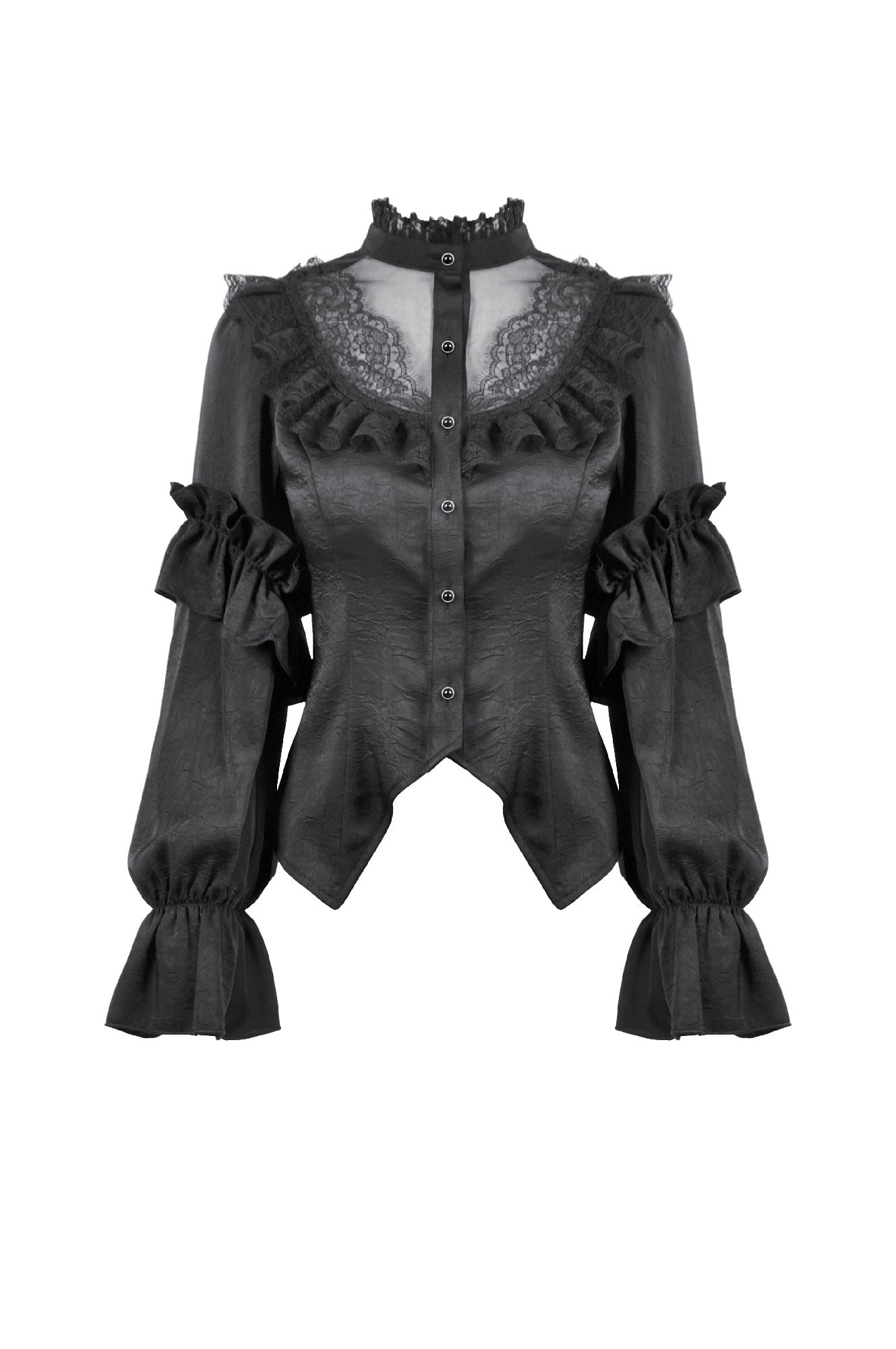 Like a raven gliding through morning mist, this blouse weaves gothic allure with courtly grace. The dramatic U-shaped lace trim frames the chest with a romantic silhouette, layered over translucent mesh embroidered with secrets. Billowing lantern sleeves feature tiered ruffles at mid-arm, adding movement and mystique. With a cinched waist and sculpted hem, it’s perfect for banquets, celebrations—or daily rituals wrapped in shadow.