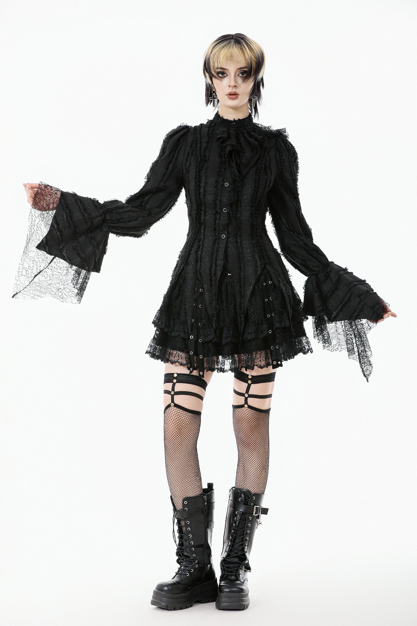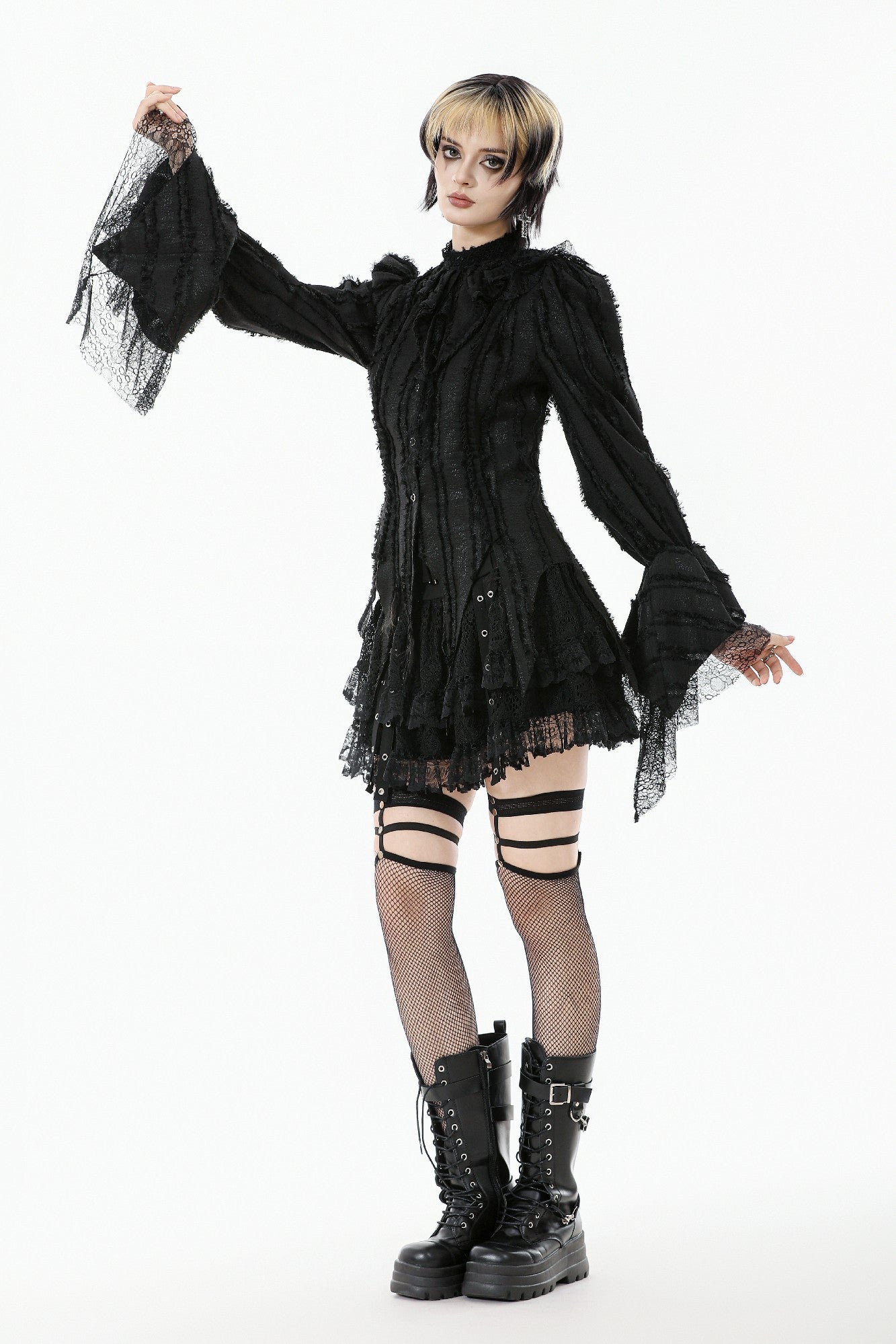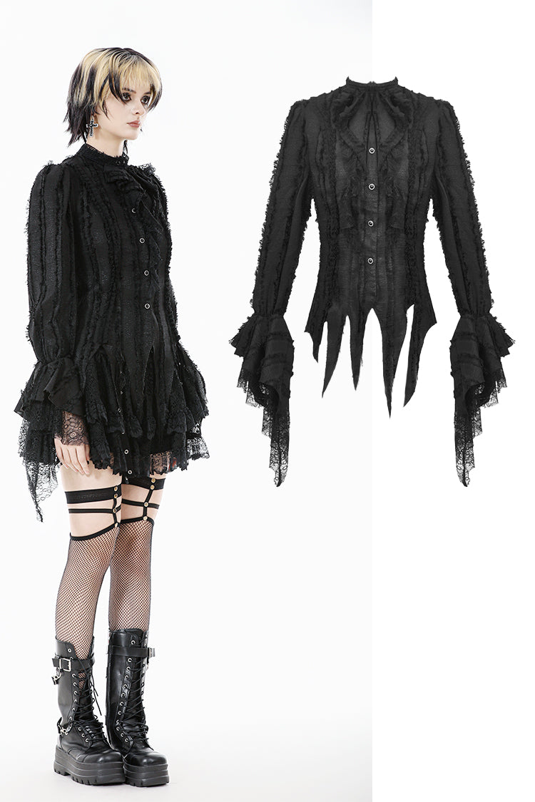 Crafted from ghostly striped burnout fabric, this shirt whispers of forgotten rituals and cursed elegance. The fitted body mimics stitched shadows, while the jagged hem and cuffs evoke a garment torn by time—or by something more sinister. Layered lace cascades from the sleeves in spectral waves, echoing phantom limbs dancing in moonlight. A detachable lace neck ornament adds regal drama or can be removed for a raw, untamed look. Perfect for styling under corsets, or worn alone as a standalone statement, this piece embodies the fragile beauty of decay—equal parts haunted and majestic.