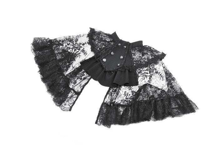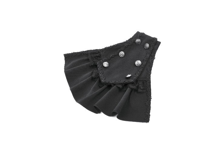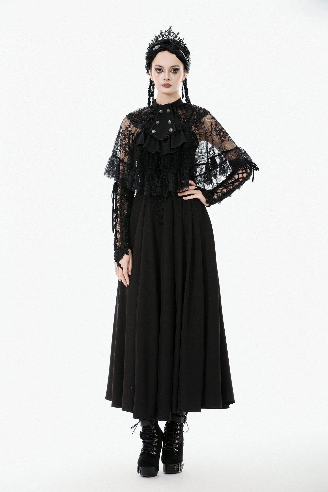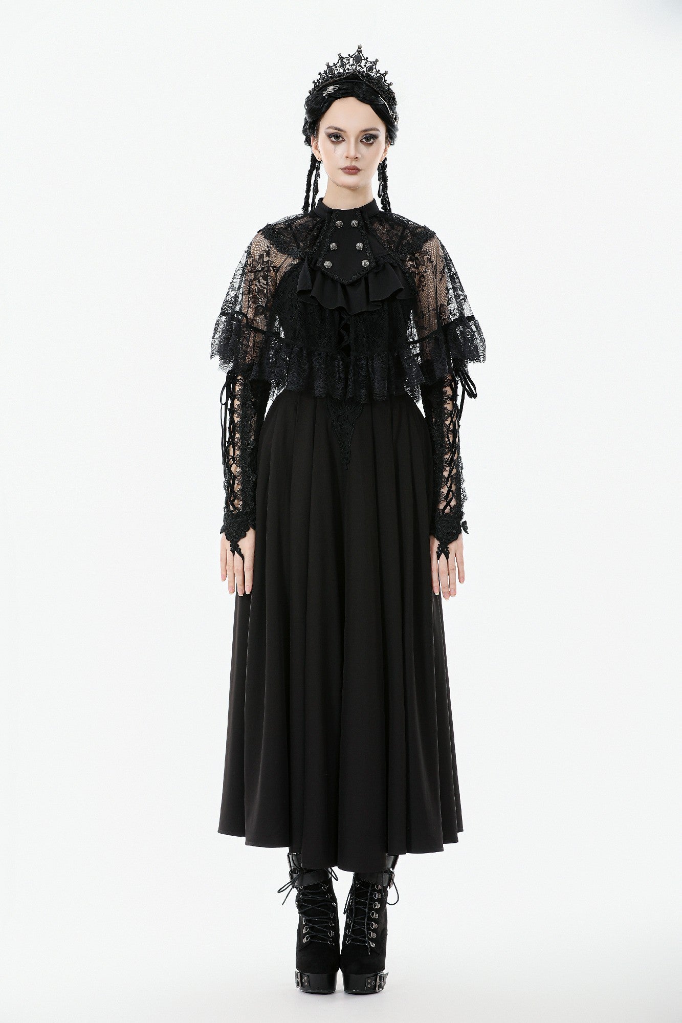 This cropped Gothic cape fuses structured woven fabric with delicate lace to create a hauntingly elegant silhouette. Ornate floral lace edges add visual richness, while the short length drapes just over the shoulders, perfect for layering or as a statement accessory. The double-button collar is both a fastening method and a decorative highlight, evoking the ceremonial flair of a nocturnal gathering in a forgotten manor.