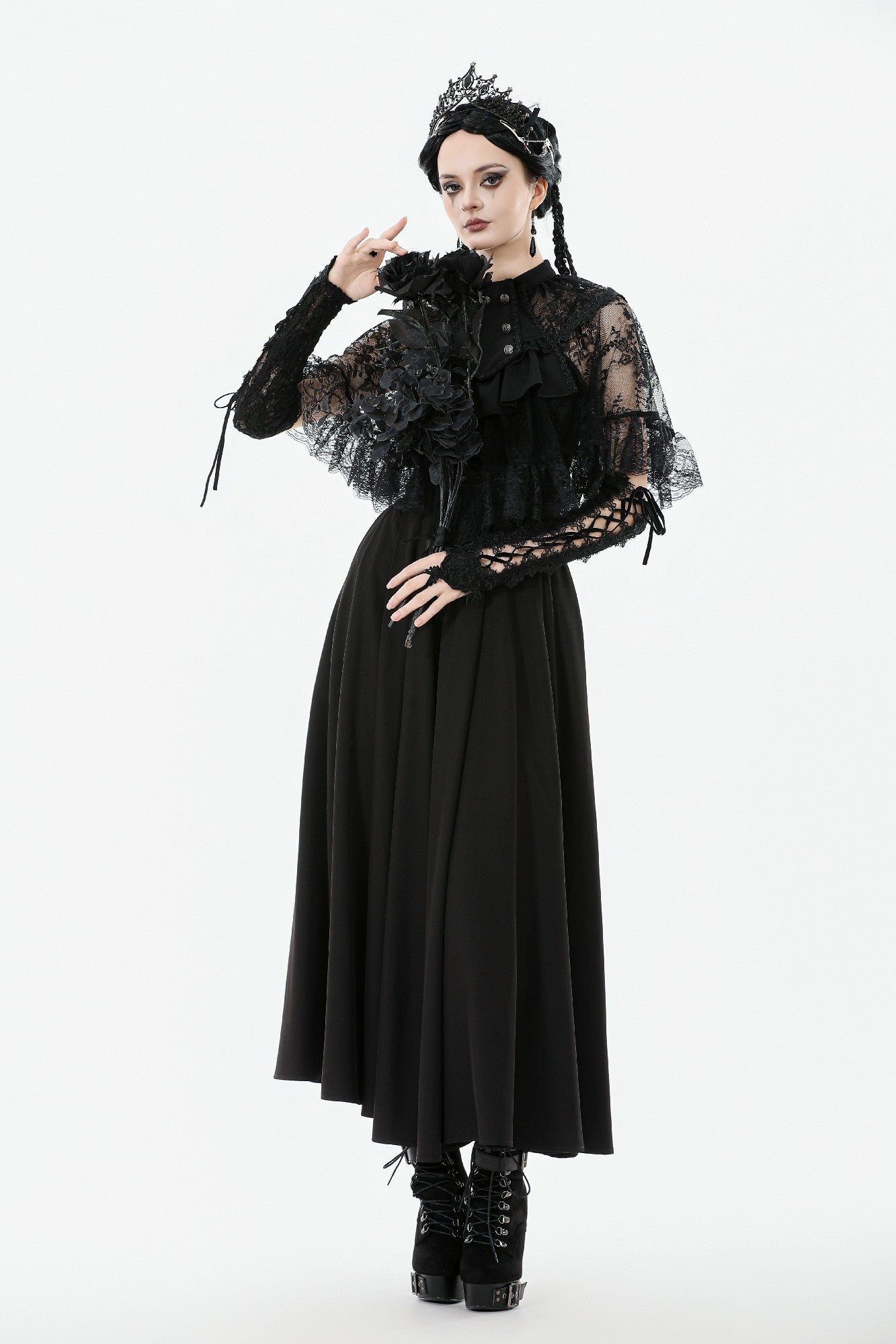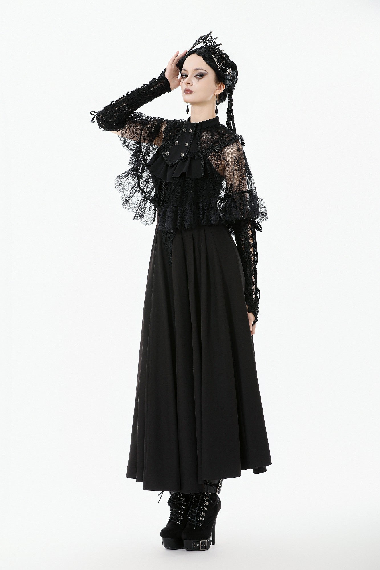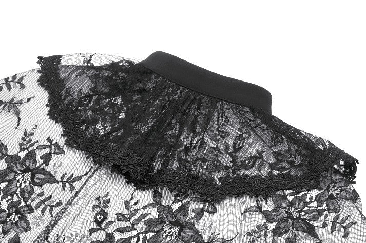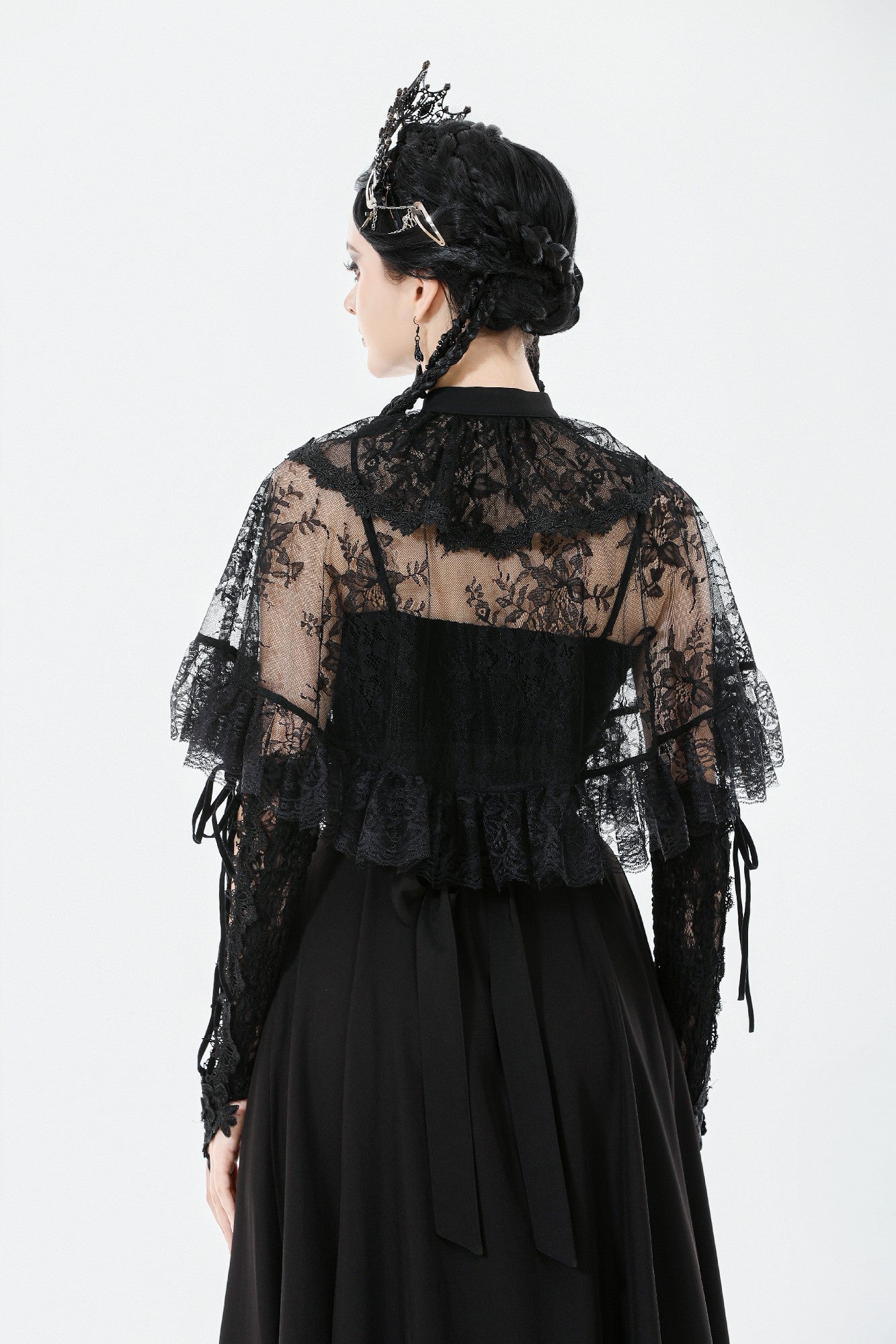 This cropped Gothic cape fuses structured woven fabric with delicate lace to create a hauntingly elegant silhouette. Ornate floral lace edges add visual richness, while the short length drapes just over the shoulders, perfect for layering or as a statement accessory. The double-button collar is both a fastening method and a decorative highlight, evoking the ceremonial flair of a nocturnal gathering in a forgotten manor.