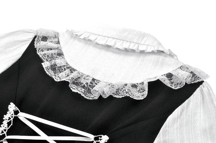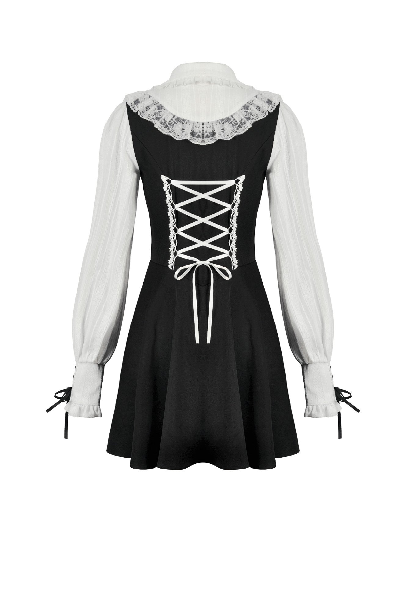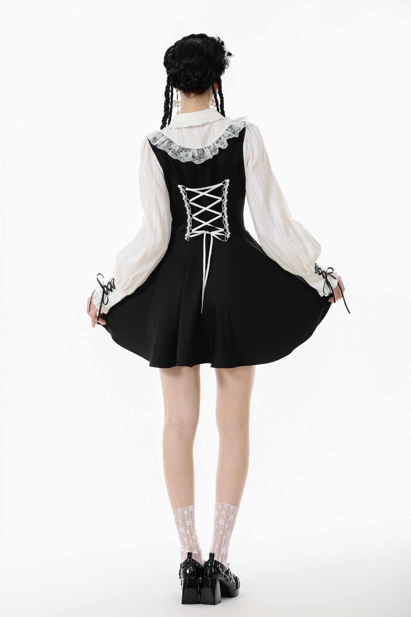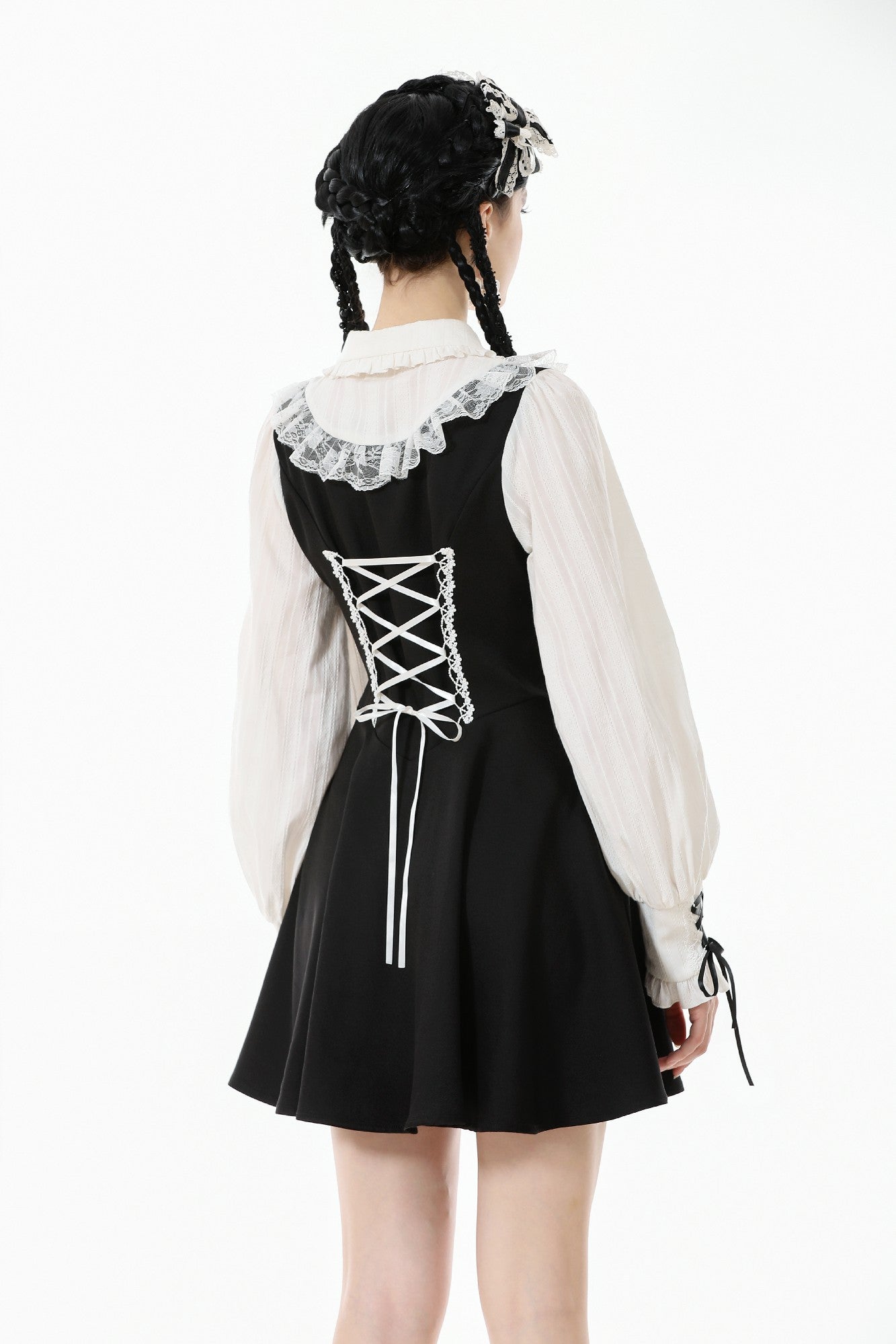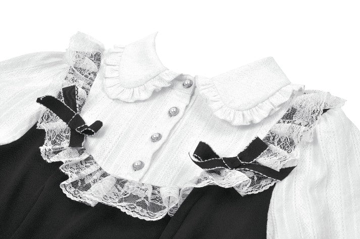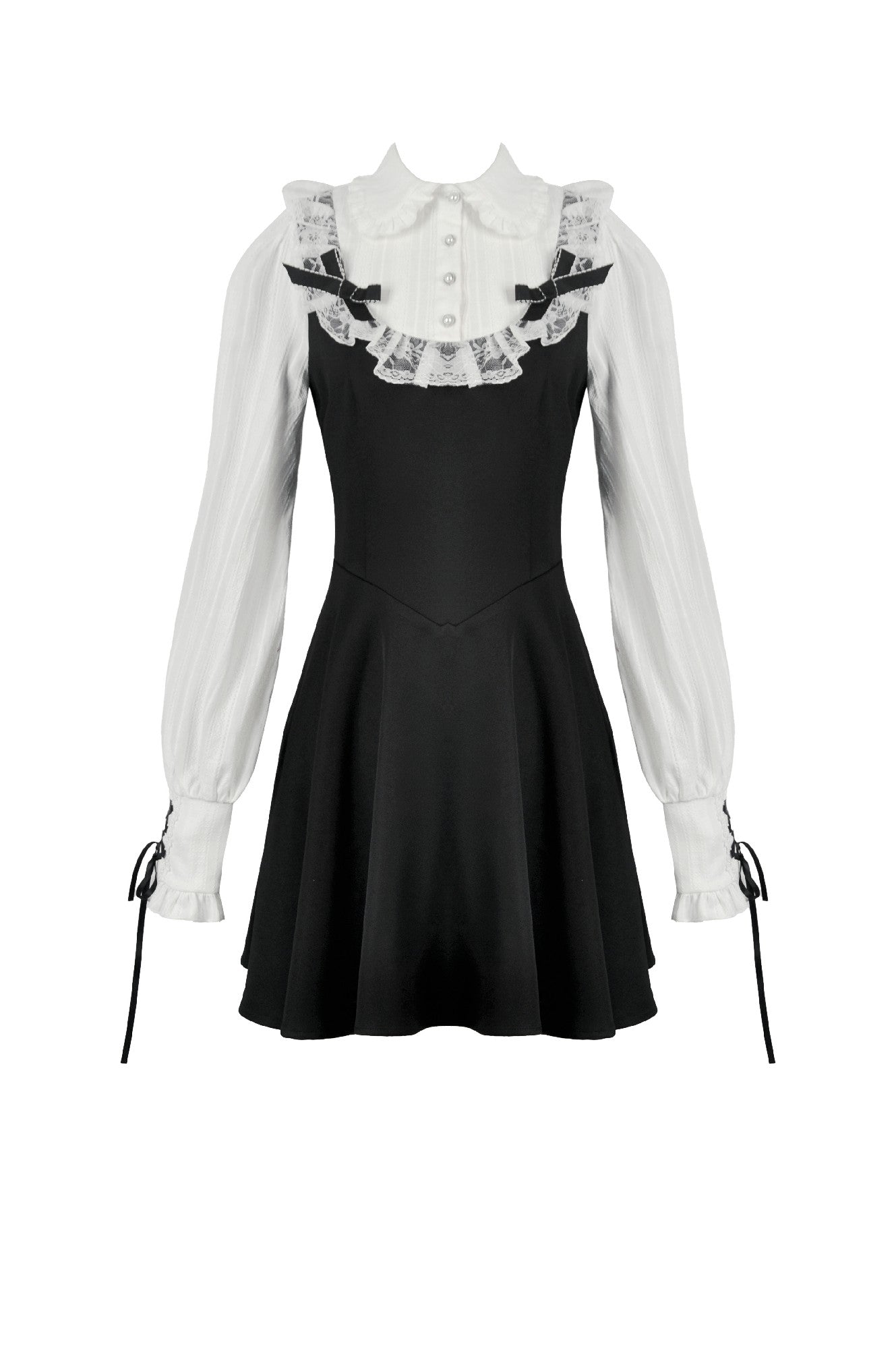 Delicately sweet with a refined edge, this Lolita dress features a charming faux two-piece design crafted from off-white textured fabric and contrasting black twill. The vintage-inspired Peter Pan collar is trimmed with lace and bow accents, while the real front placket adds both style and function. Lace-up ribbon cuffs on the sleeves and adjustable corset-style lacing on the back allow for a perfect fit and extra flair. Whether you're strolling with friends or adding elegance to your everyday look, this dress brings soft monochrome charm to any occasion.
