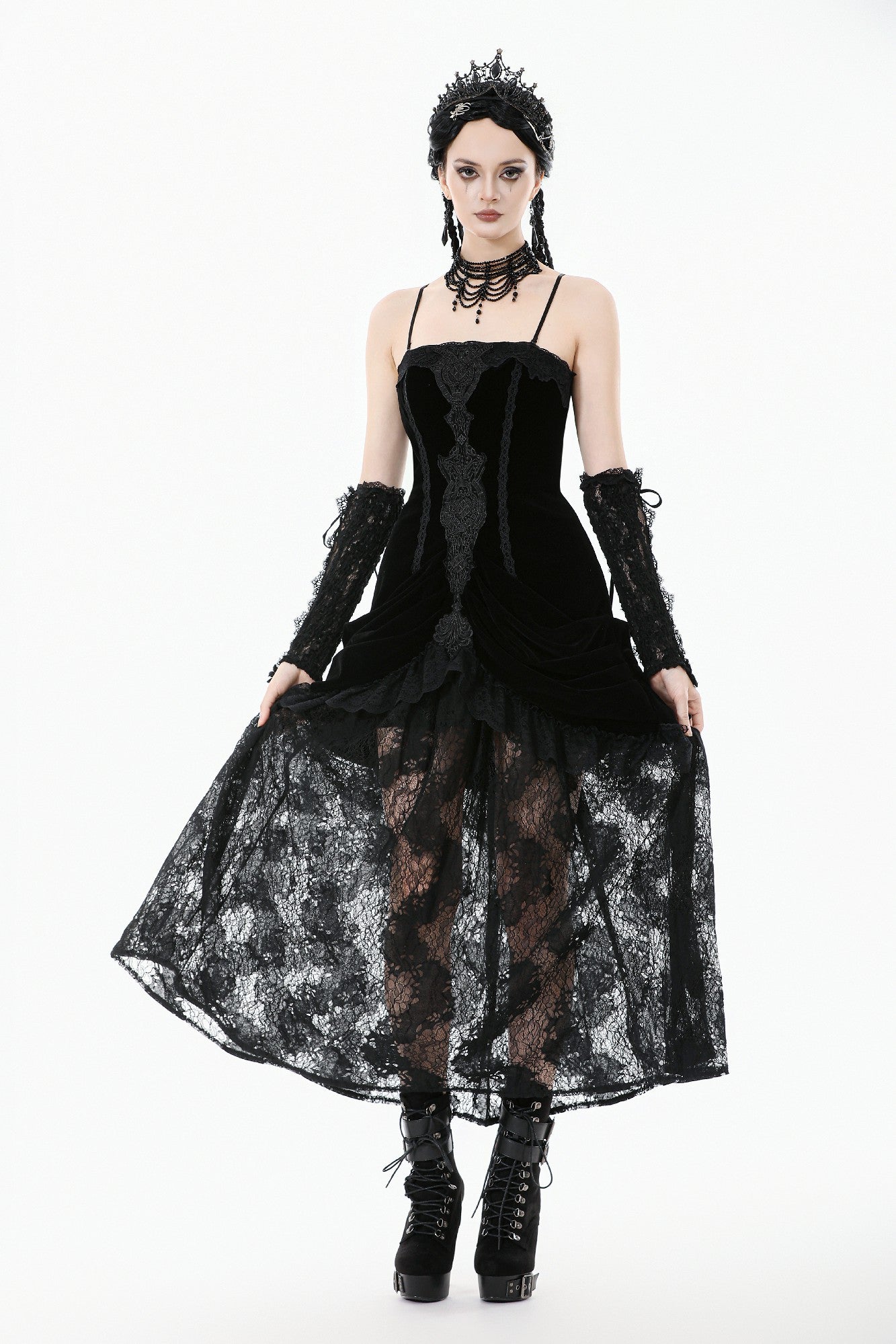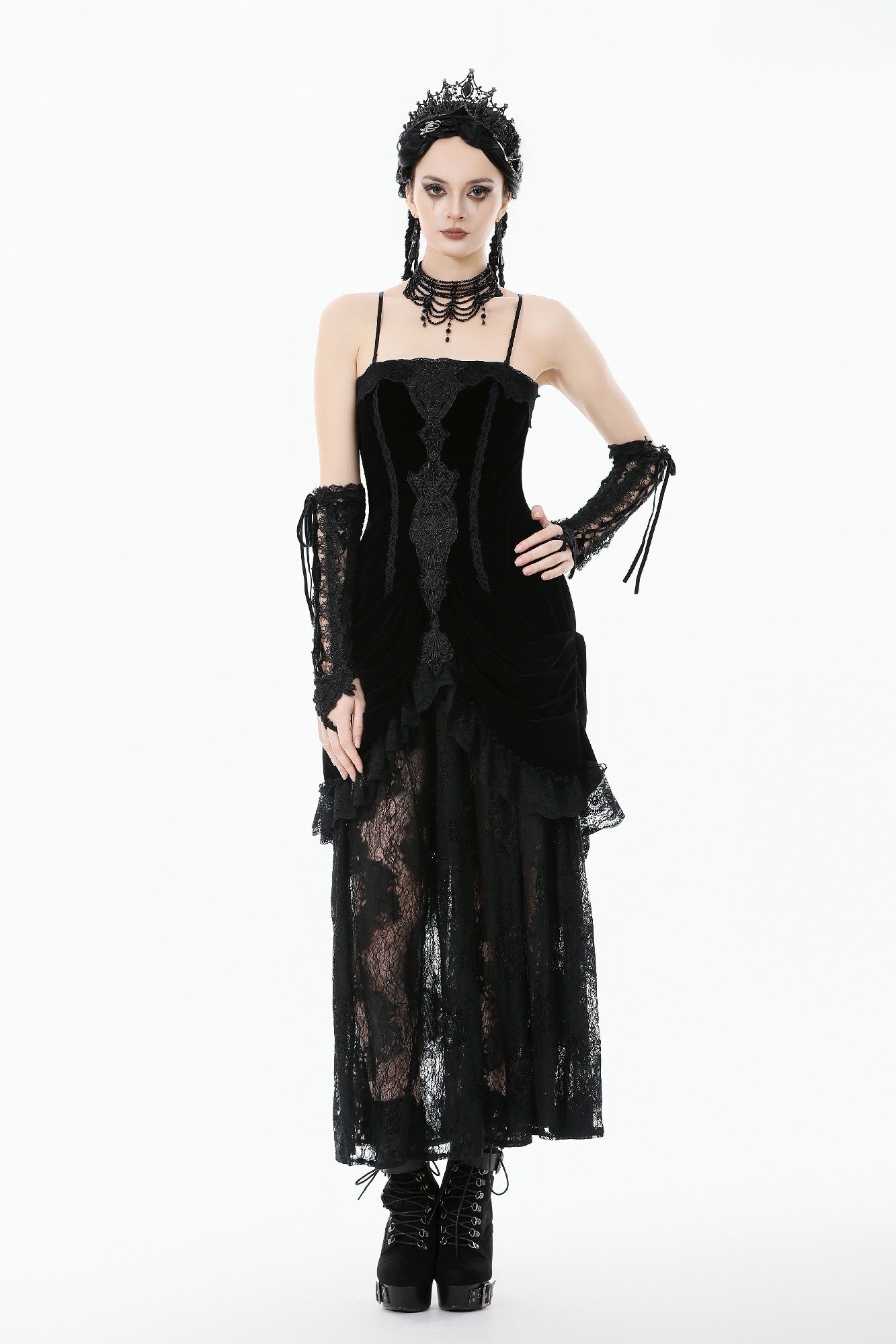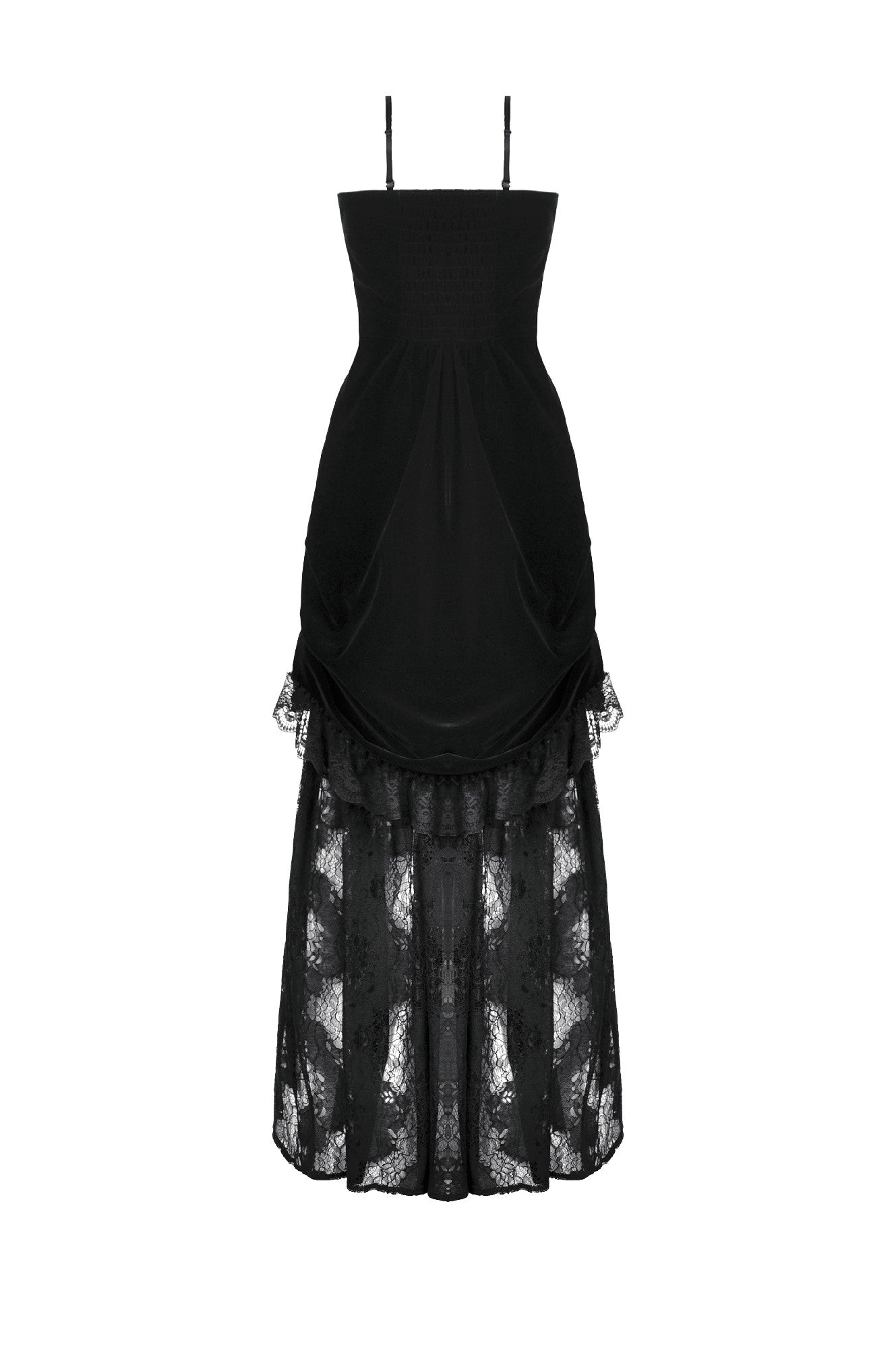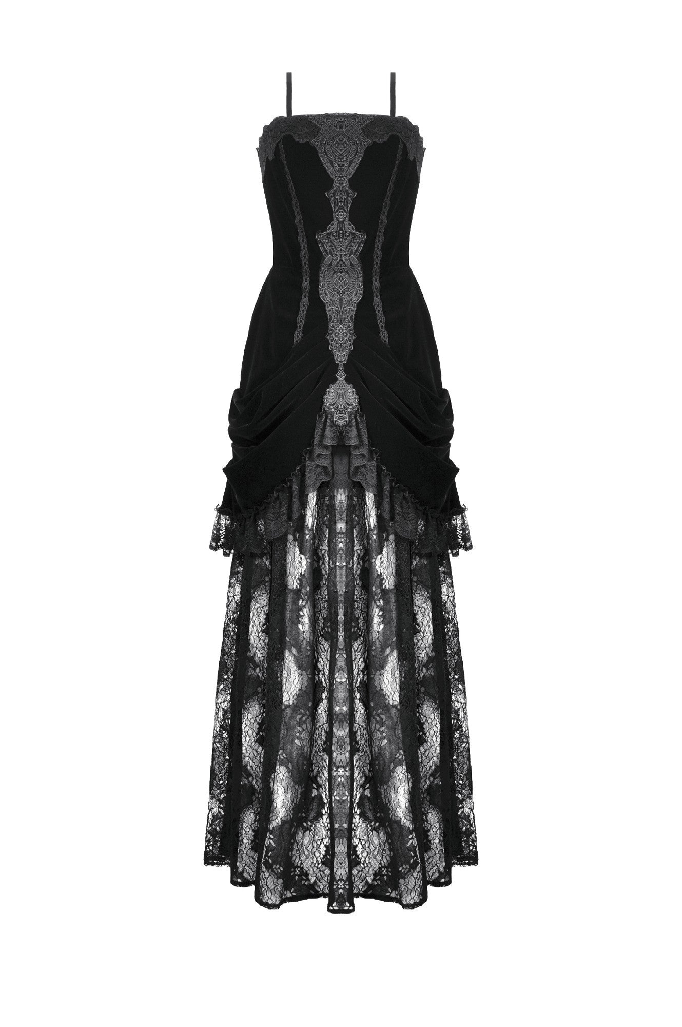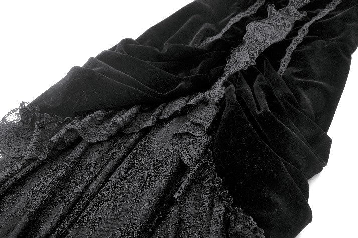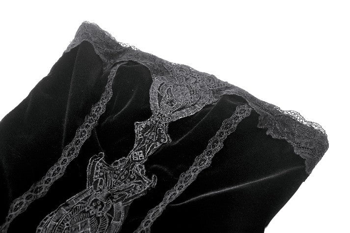 A sensual fusion of velvet and lace, this strapless gothic dress features intricate long embroidery and lace trimming at the bust. The soft velvet bodice contours the body, with pleated sides at the hips creating a graceful hourglass effect. Finished with a delicate lace hemline, this piece embodies both opulence and edge — ideal for gothic parties, fantasy shoots, or elegant alternative evenings.