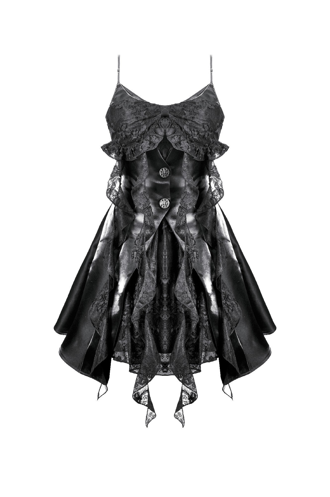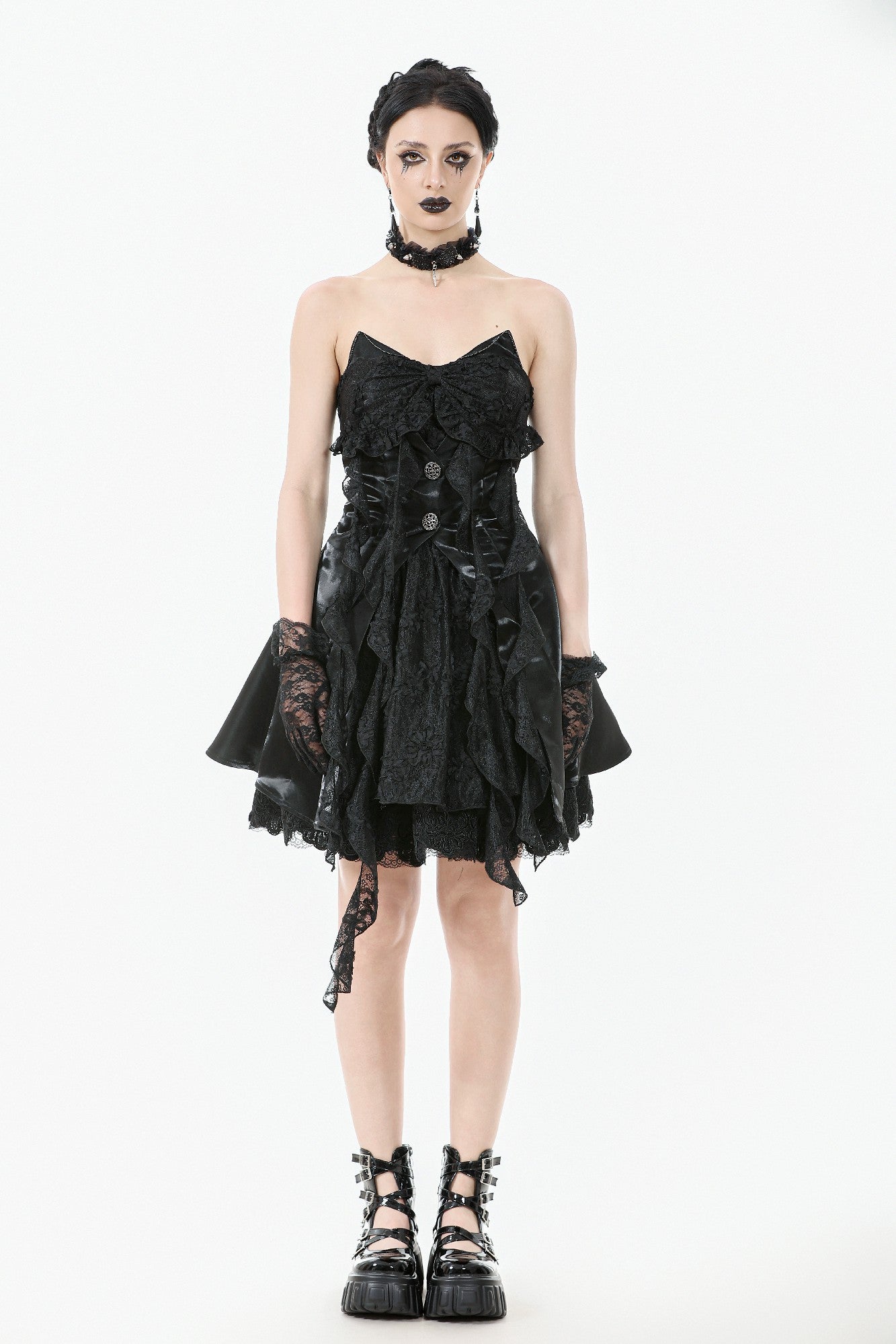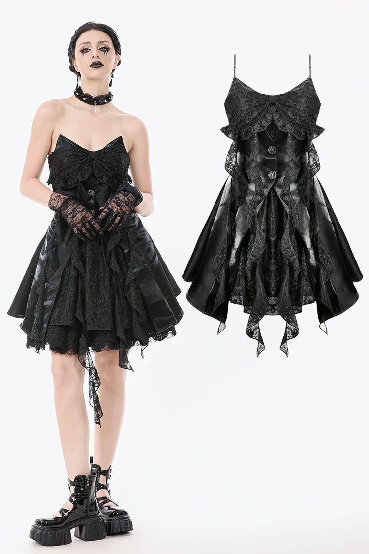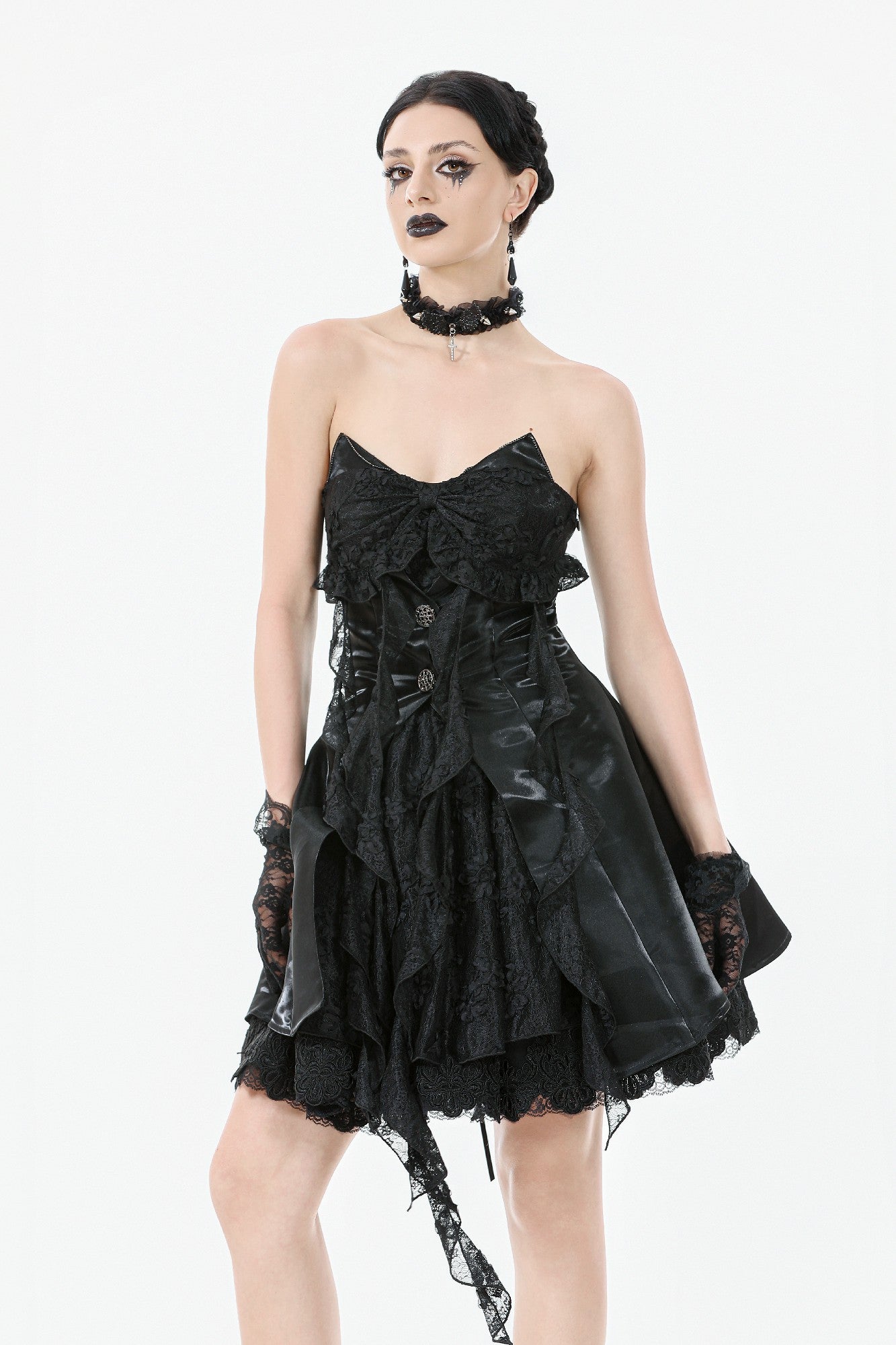 Where sweetness meets the shadows. This captivating strapless dress features playful 3D cat ears with rhinestone chains atop the bodice, blending Gothic mystery with kawaii rebellion. Faux jacket panels in shiny satin fabric add a structured twist, while the embroidered lace bow and irregular layered hem evoke a dreamy silhouette. The floating chiffon strands fall like dandelions in the night, completing this stunning piece. Perfect for stage performances, cosplay events, gothic parties, or fashion shoots.