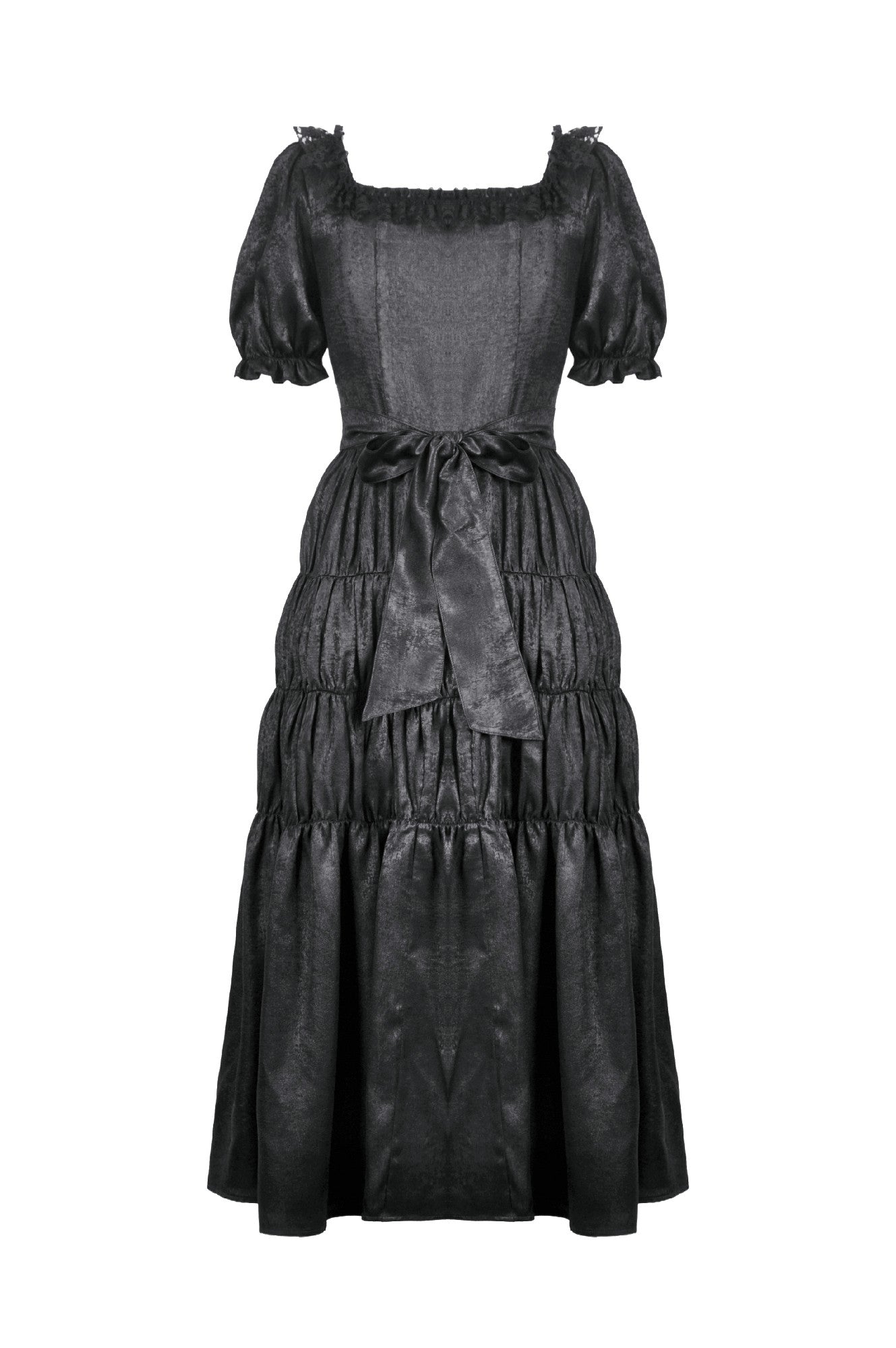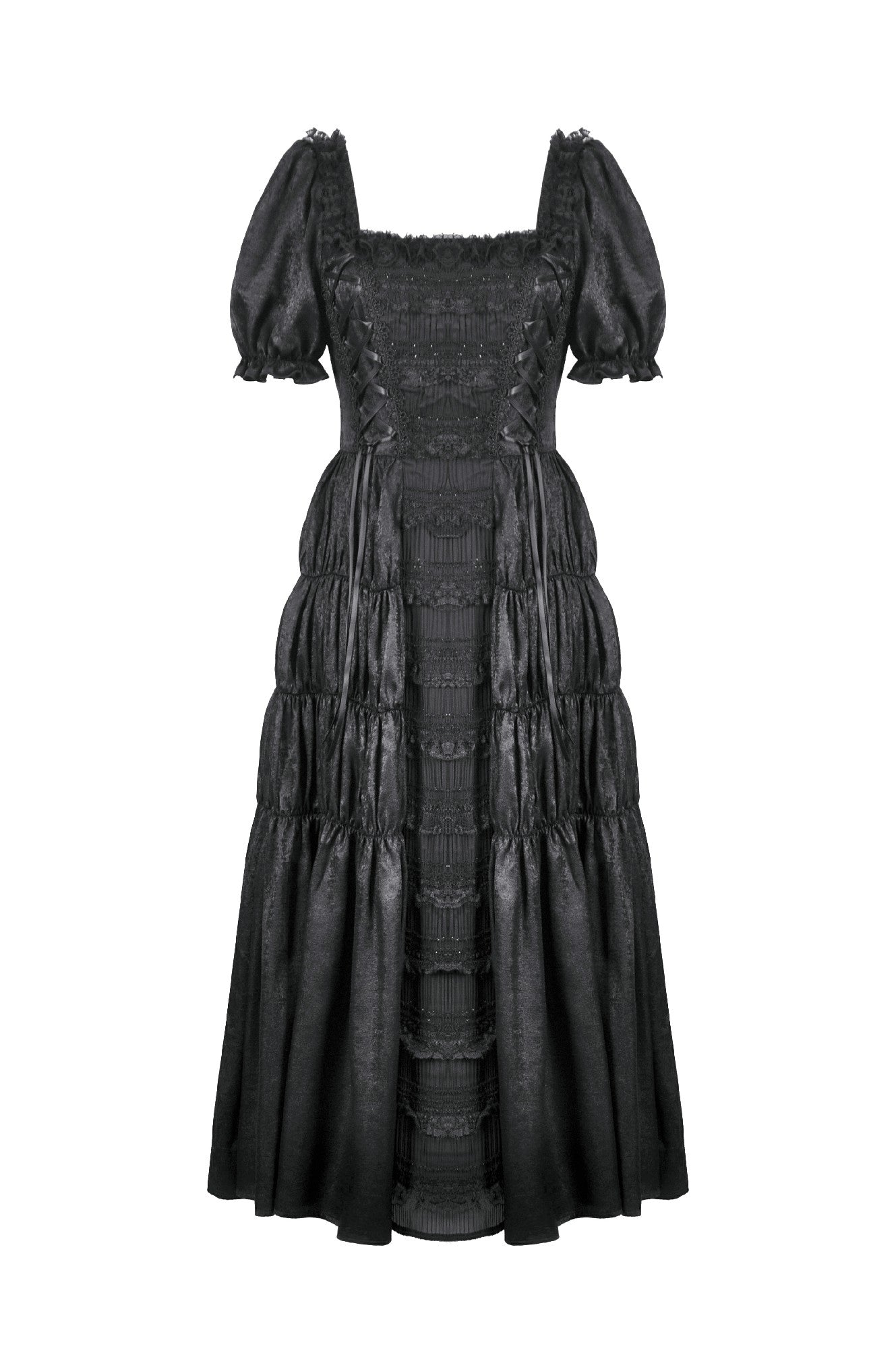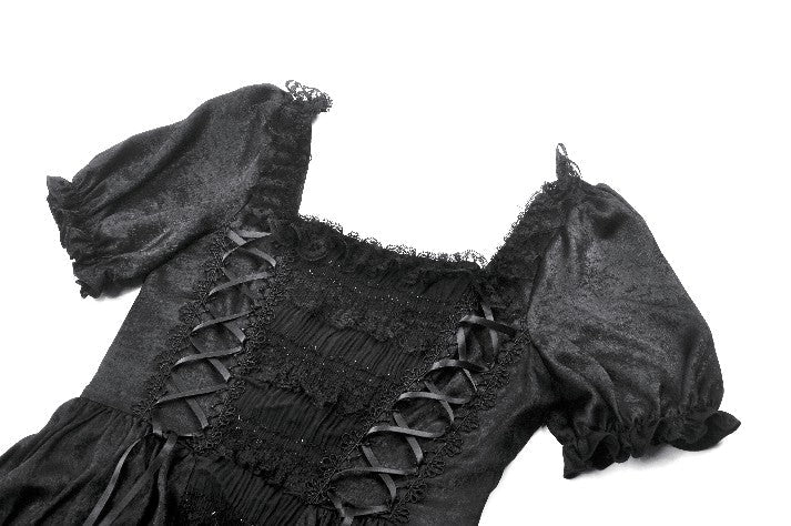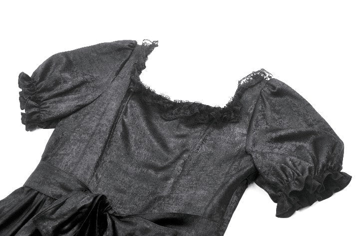 Step into a lace-lined dream, where every ruffle is a whisper of vintage charm. The front center features layered frills delicately ruched over lace, cascading like secret petals in bloom. Elastic gathers on both sides sculpt the silhouette with a soft volume, reminiscent of a storybook maiden.