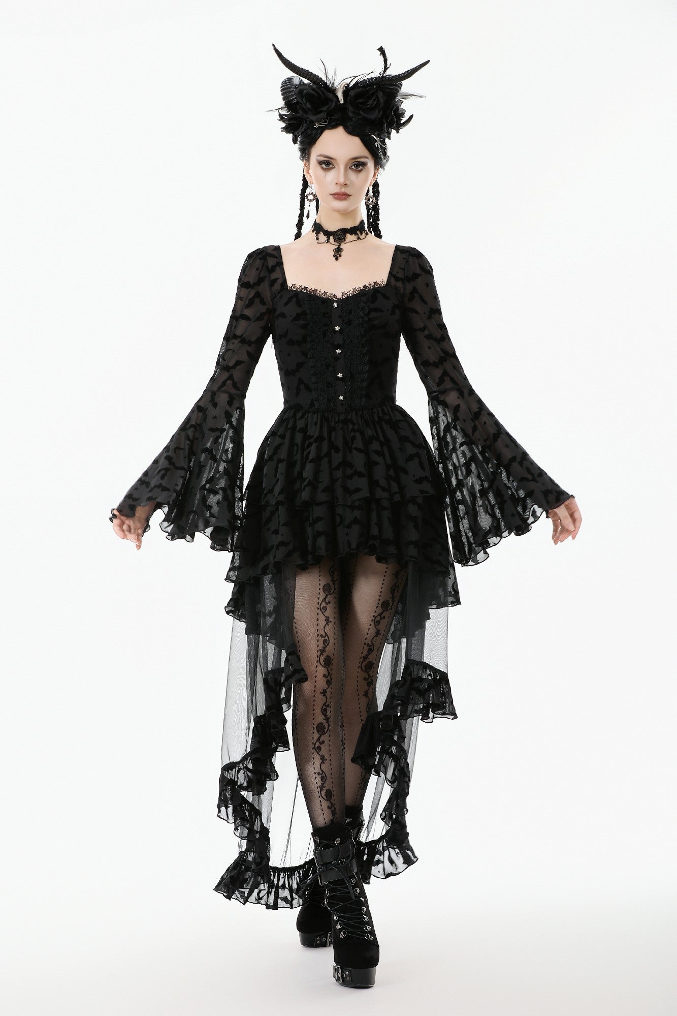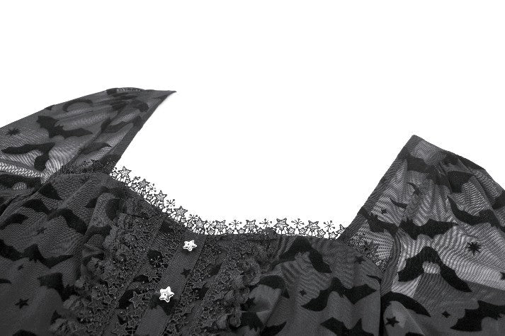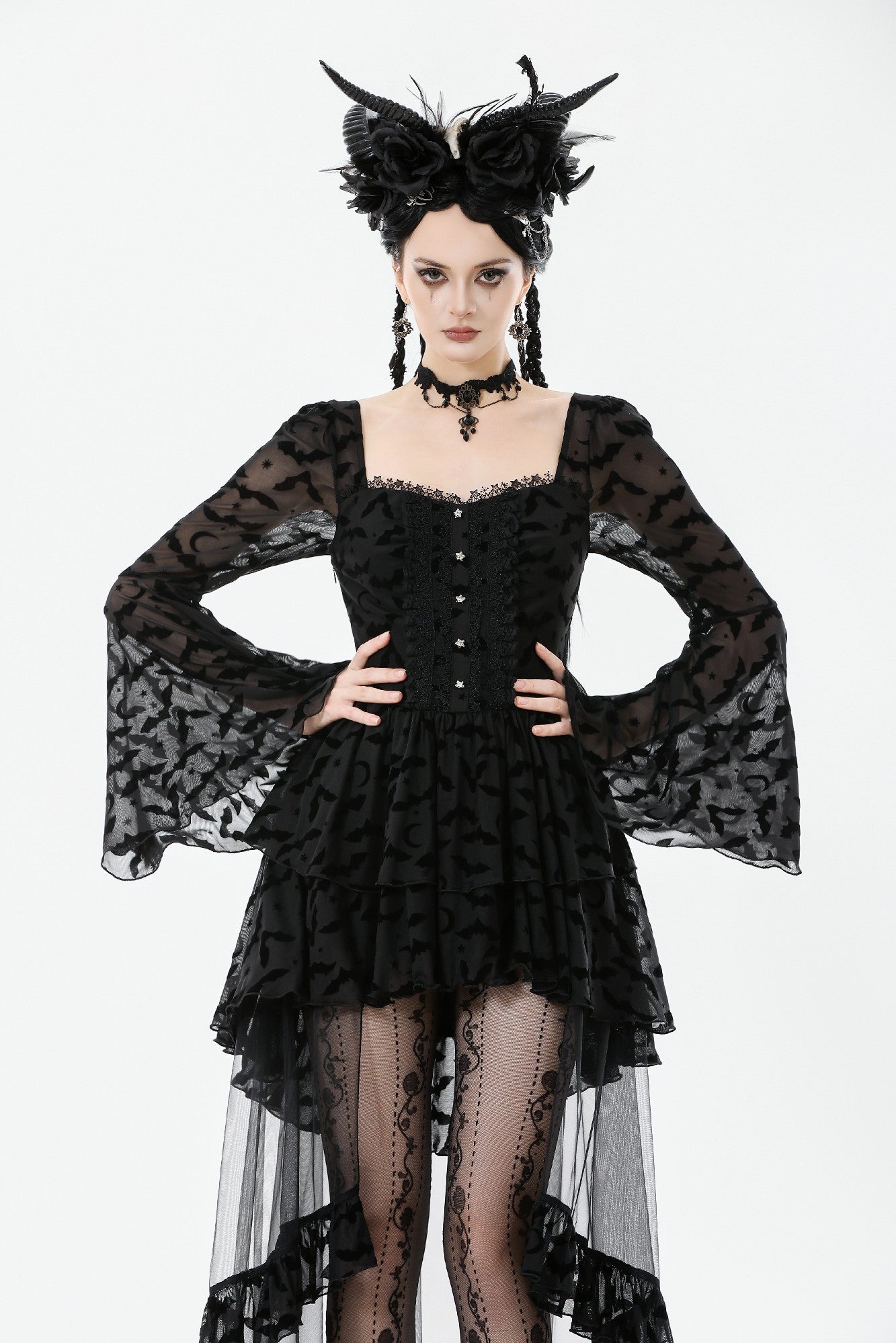 Delicately flared bell sleeves attach from mini shoulders, ending in rippled cuffs that flow gracefully. The double-layered front hem blends velvet mesh and sheer fabrics for a romantic Gothic touch, while the back features a fluid combination of mesh and velvet panels to simulate a starry night sky in motion.