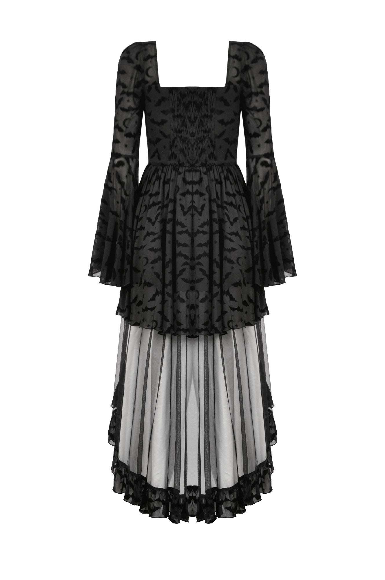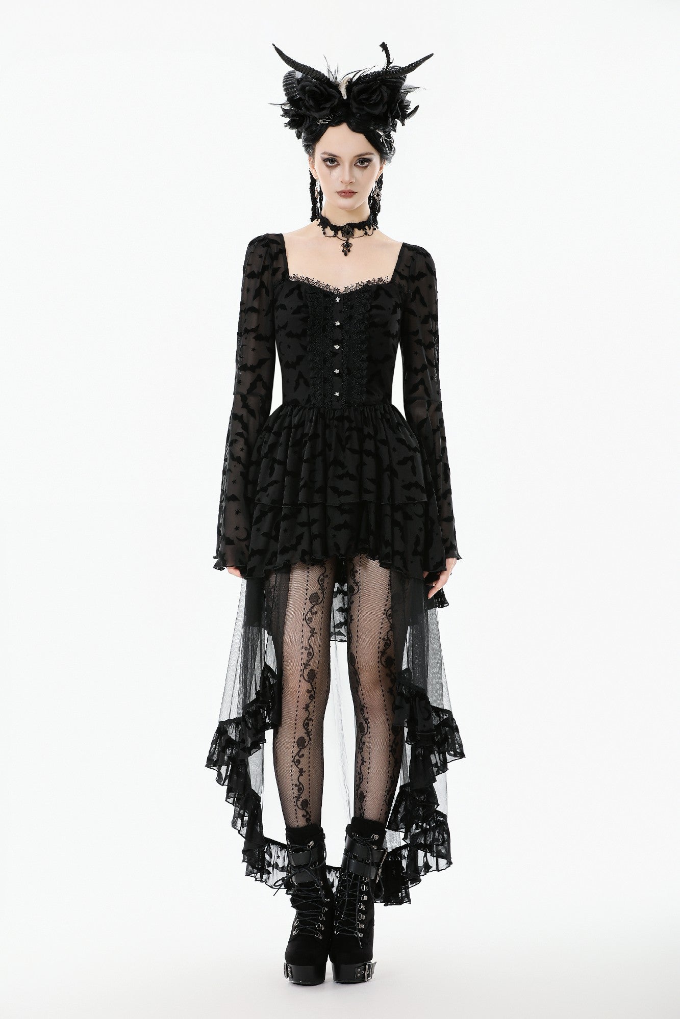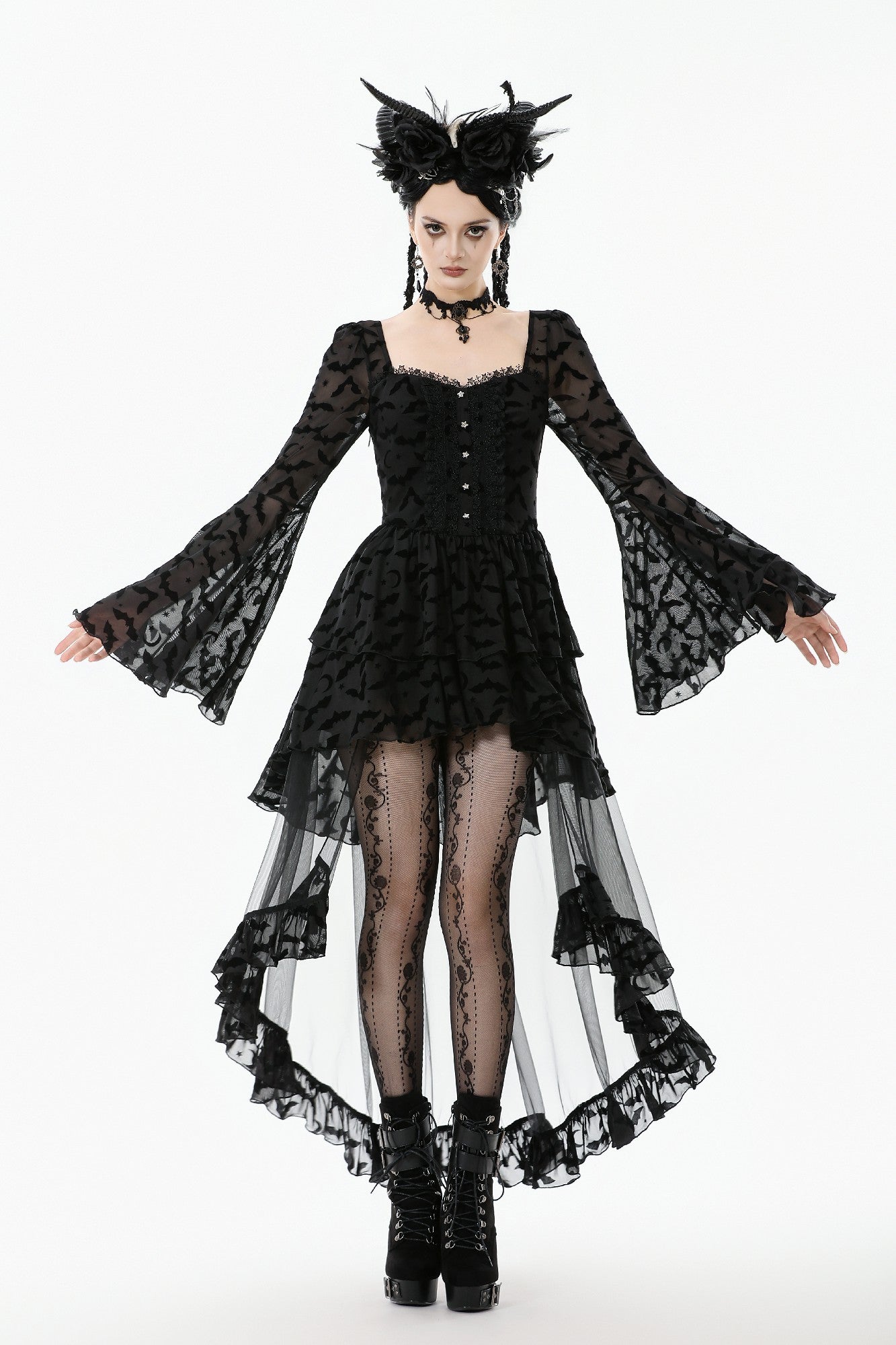 Delicately flared bell sleeves attach from mini shoulders, ending in rippled cuffs that flow gracefully. The double-layered front hem blends velvet mesh and sheer fabrics for a romantic Gothic touch, while the back features a fluid combination of mesh and velvet panels to simulate a starry night sky in motion.