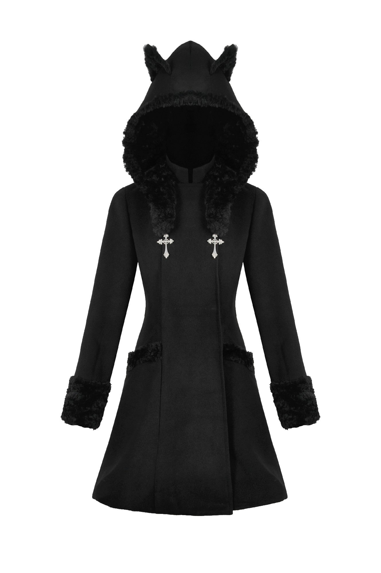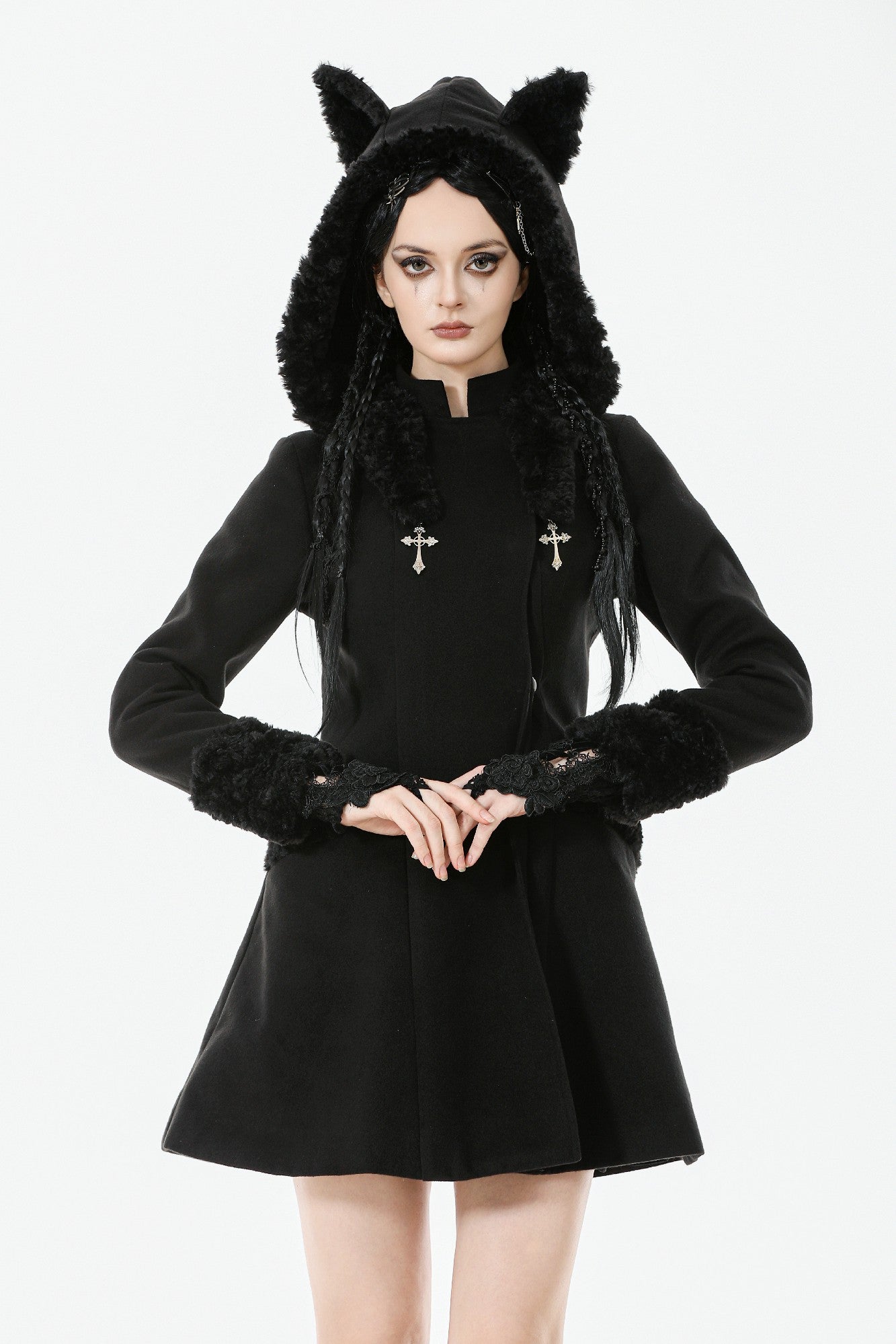This adorable cat ear hoodie features playful 3D ears on the hood, lined with soft faux fur for extra warmth and charm. A small cross detail adorns the front hood edge, adding a unique touch. The waist pockets are both practical and stylish, with hidden snap buttons for easy closure. Fur trims embellish the cuffs and pockets, creating a cozy yet cute look. Perfect for casual outings or photo shoots.