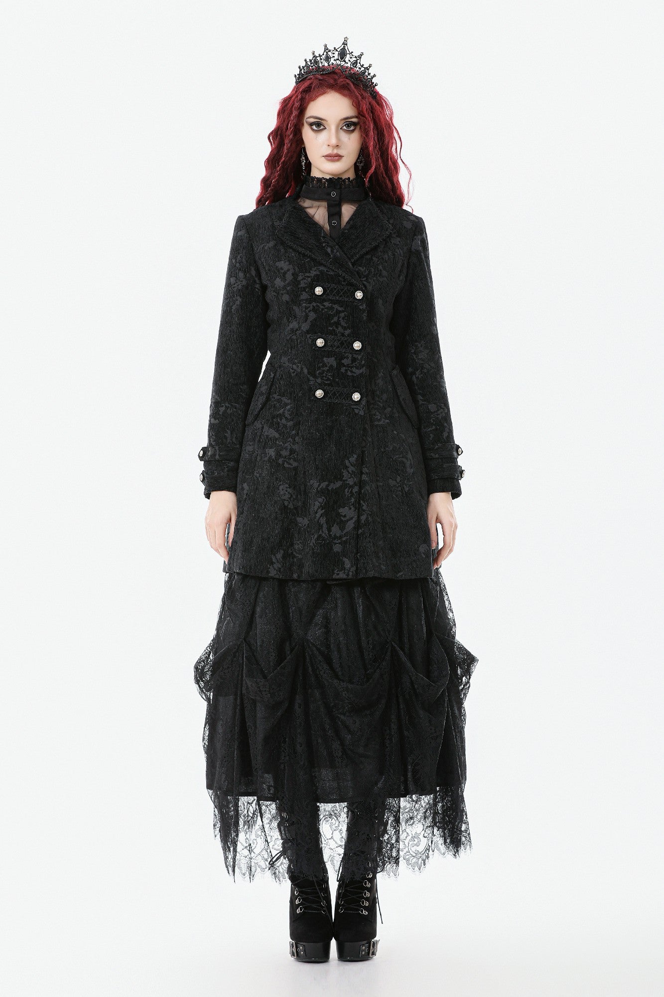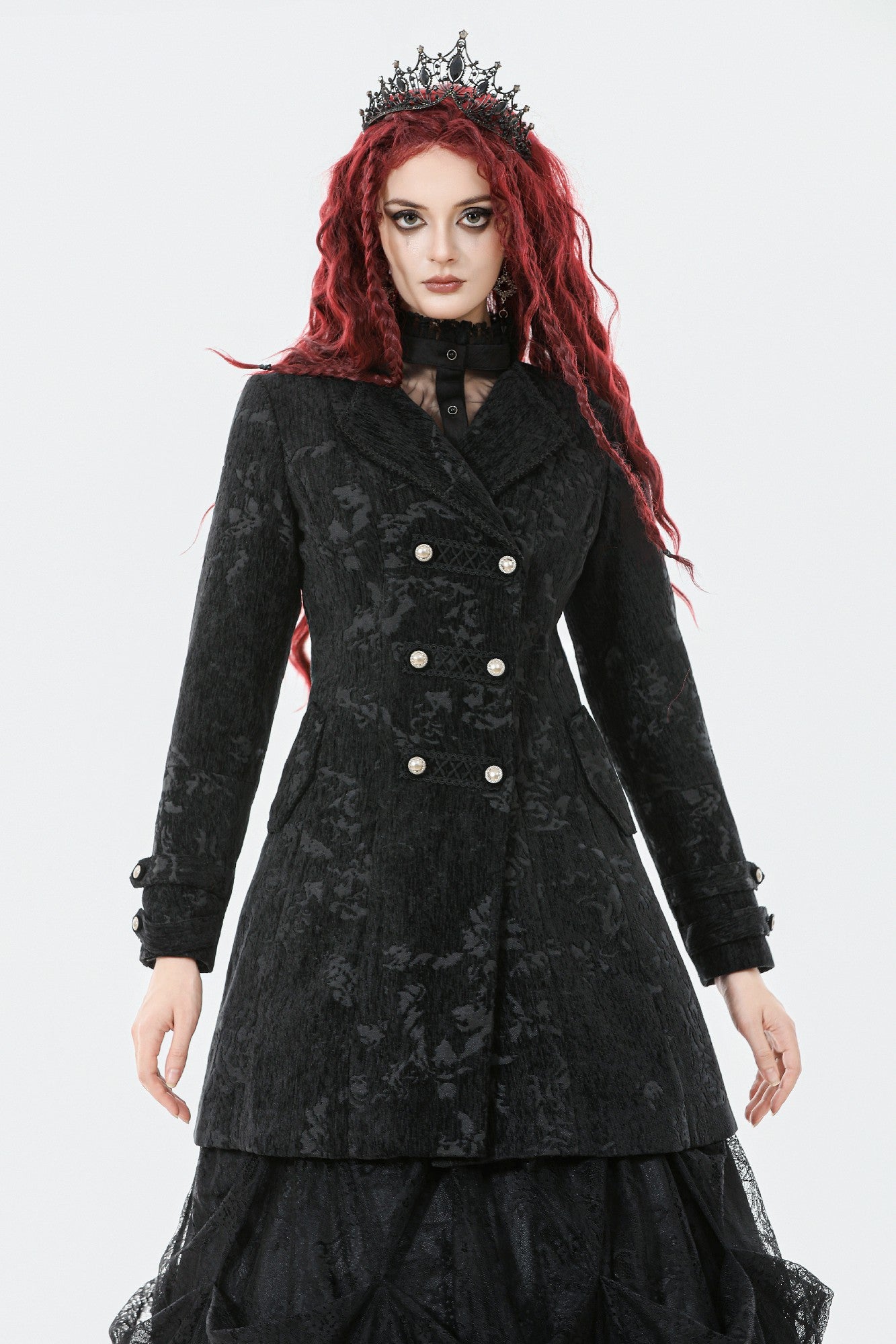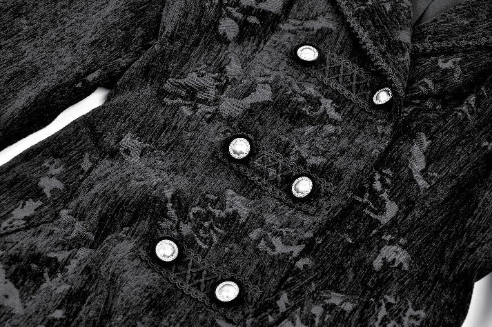 This Gothic velvet coat features a structured silhouette with decorative seams and buttons along the front for a refined look. The cuffs are accented with strap details, enhancing its Gothic elegance. Designed in a straight-cut overcoat style with side slits and a modified suit collar, it combines formality with a unique edge. Made from warm velvet, it is both versatile and practical, perfect for everyday wear or pairing with Gothic-inspired outfits.