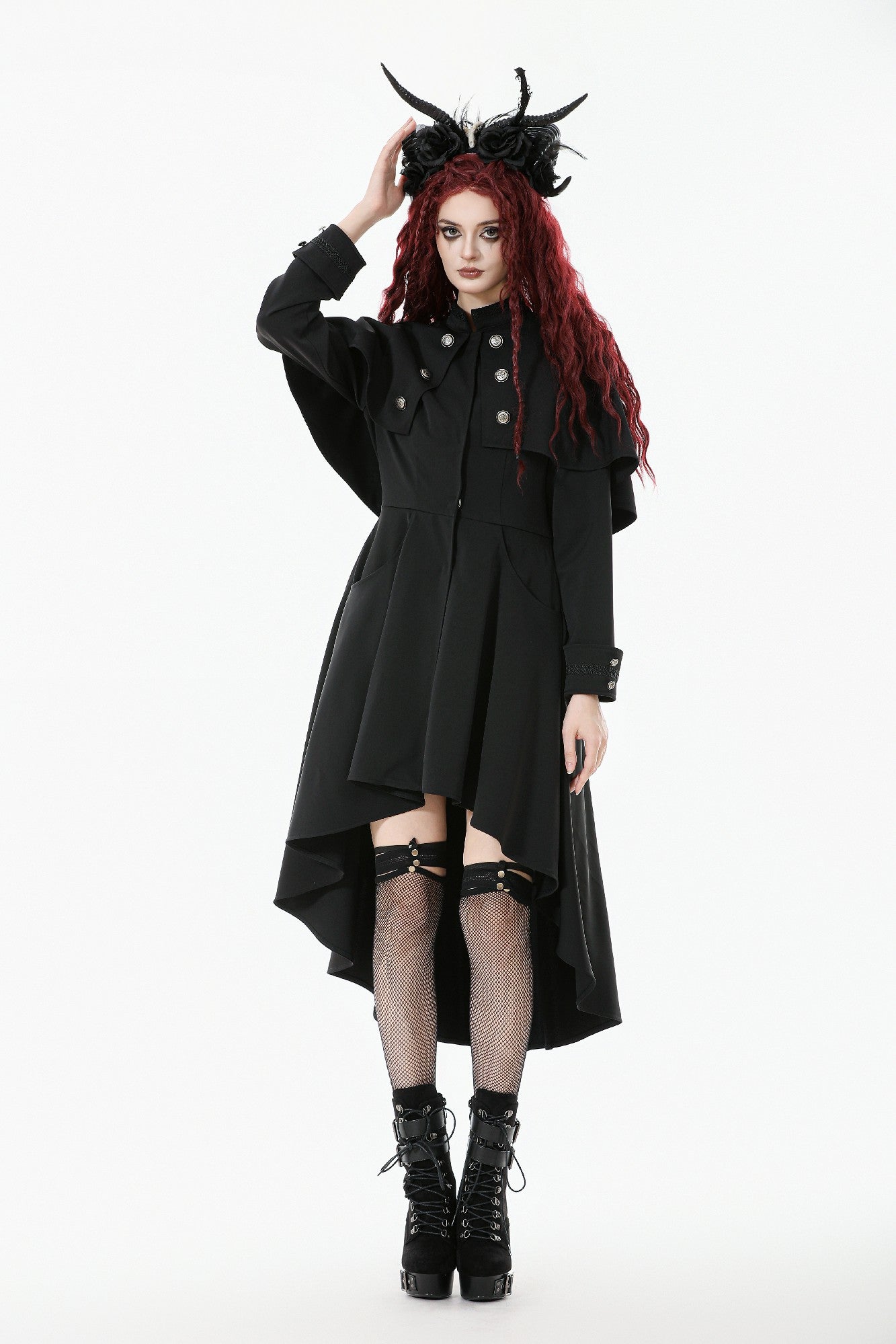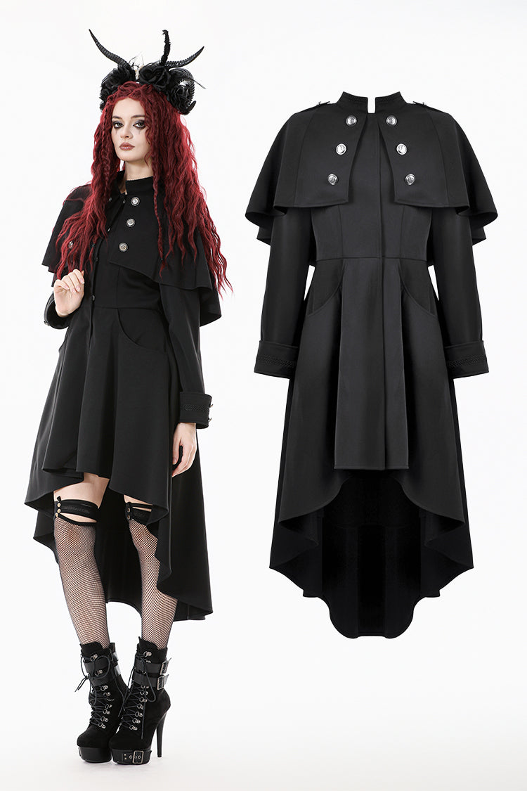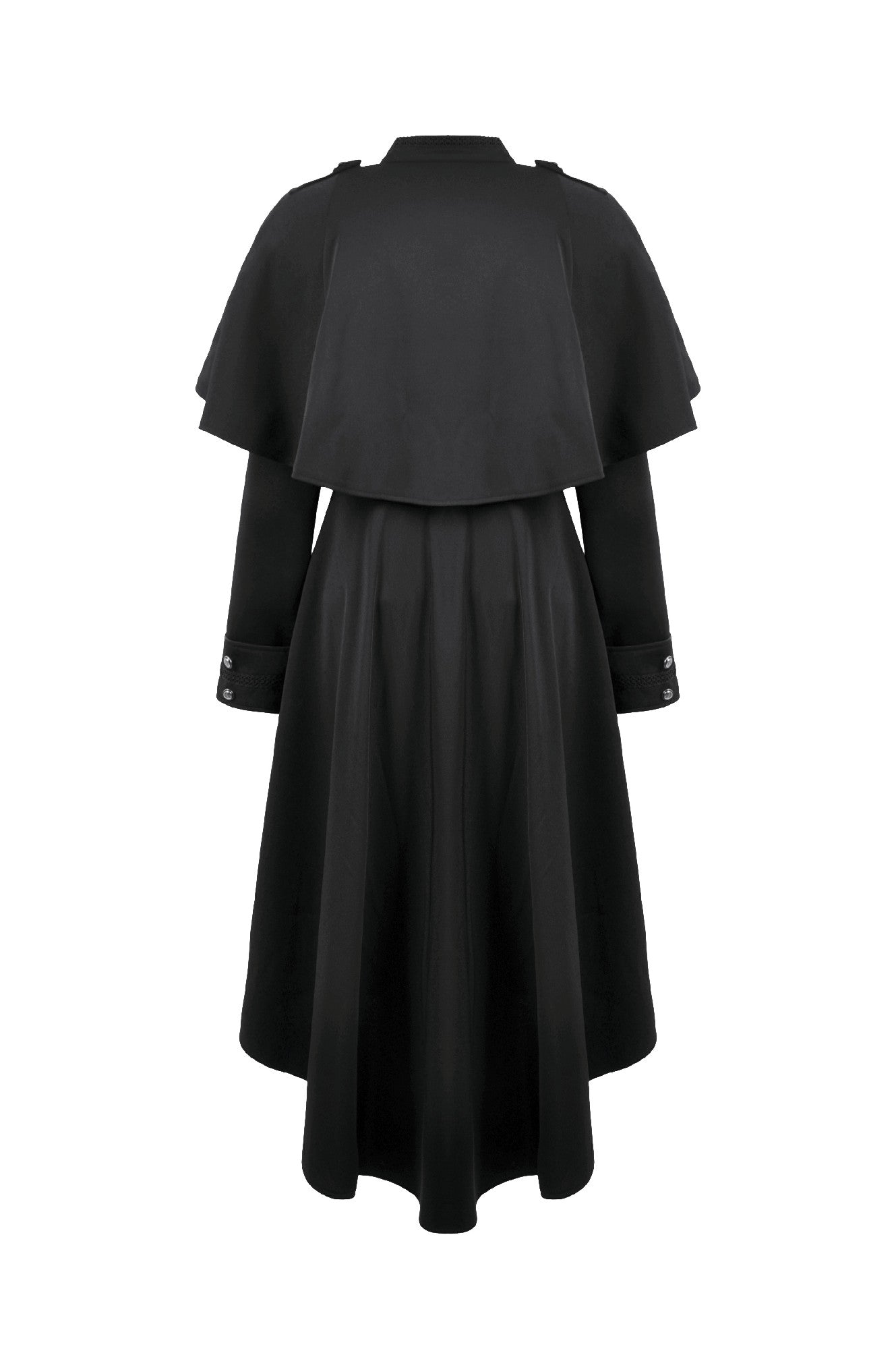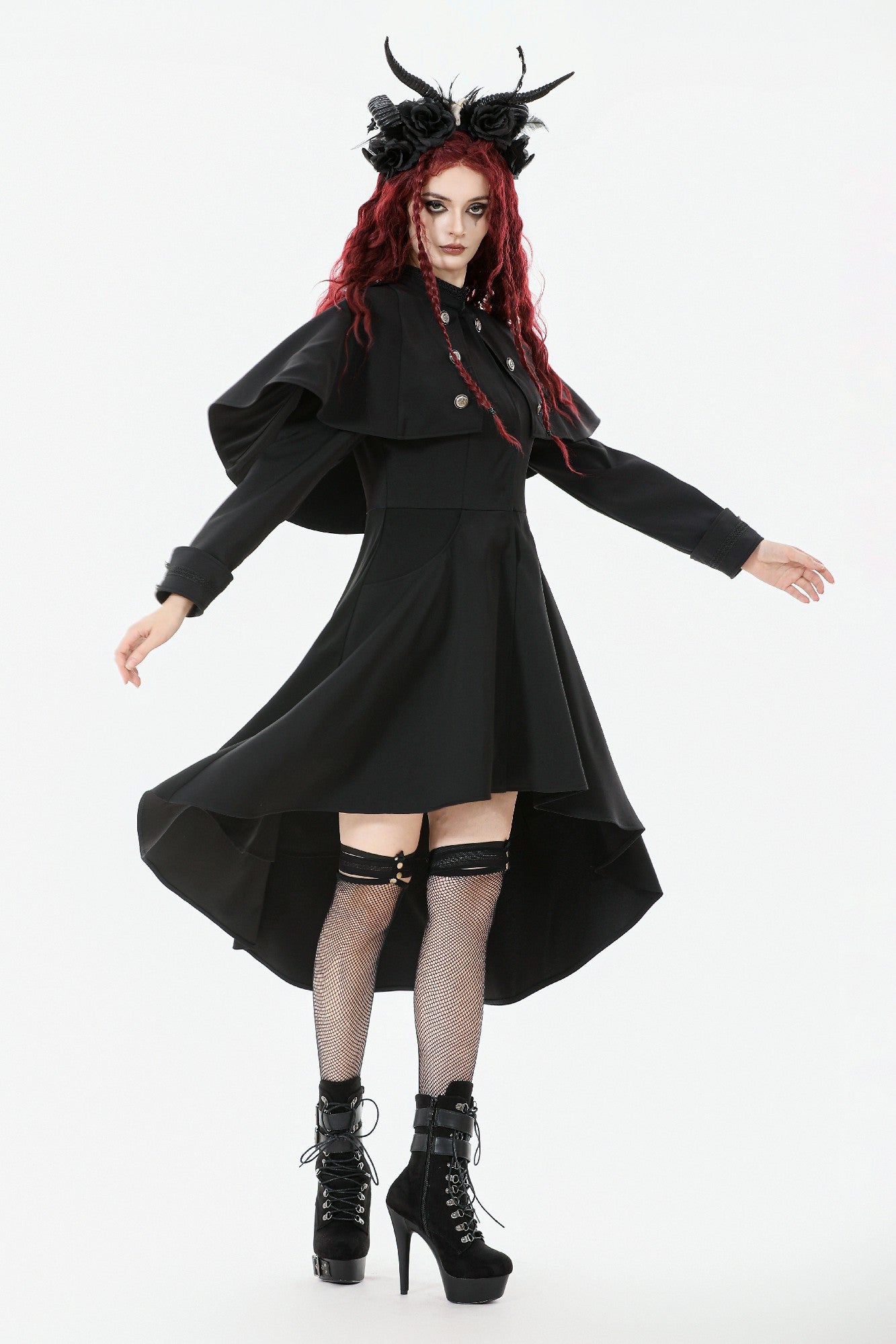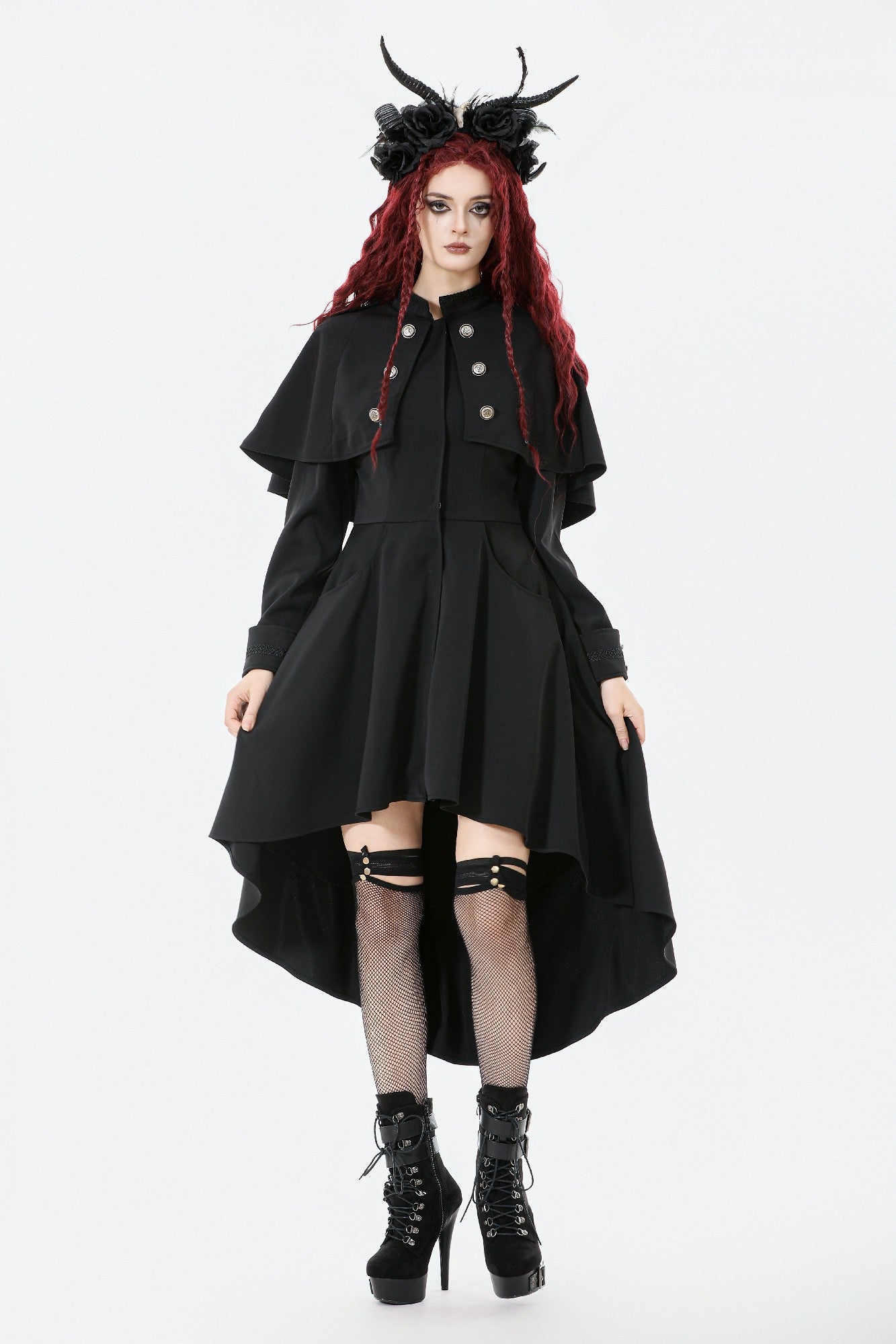 This Mystic Gothic robe features a faux two-piece shoulder cape design that creates a layered, dramatic silhouette. Both the cape and hem are cut shorter in the front and longer in the back, enhancing its mysterious and flowing elegance. The neckline and cuffs are trimmed with delicate synthetic threads, adding refined details, while the front of the cape is adorned with vintage-style buttons for a classic Gothic finish. Perfect for balls, festivals, or theatrical occasions, this robe embodies both mystery and grandeur.