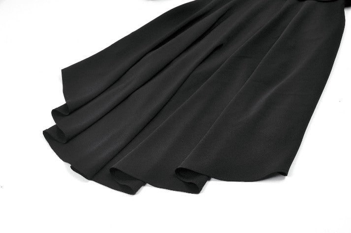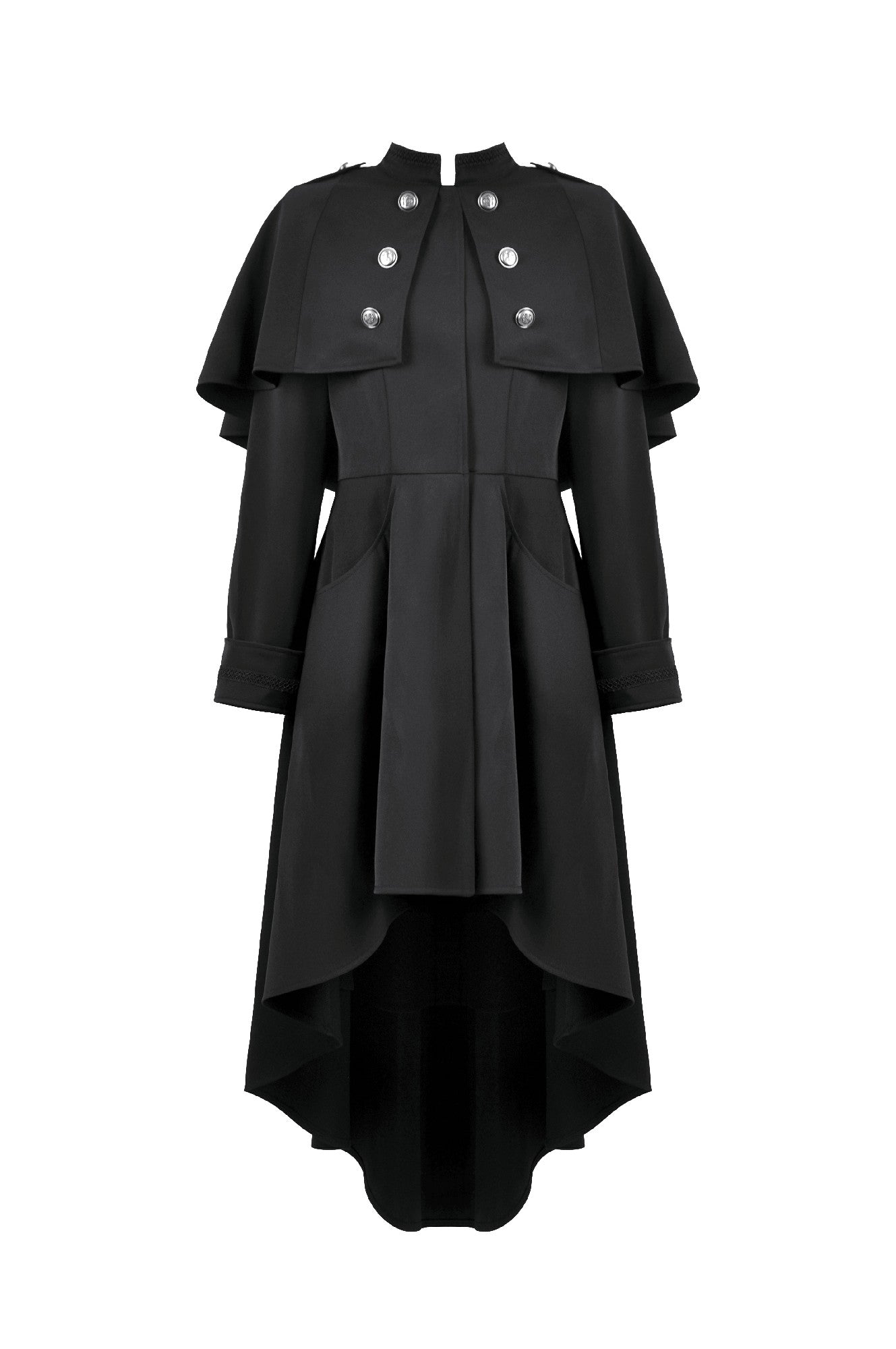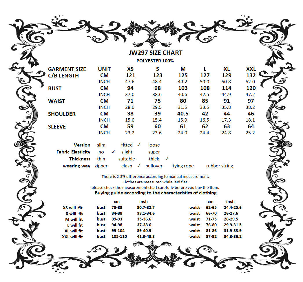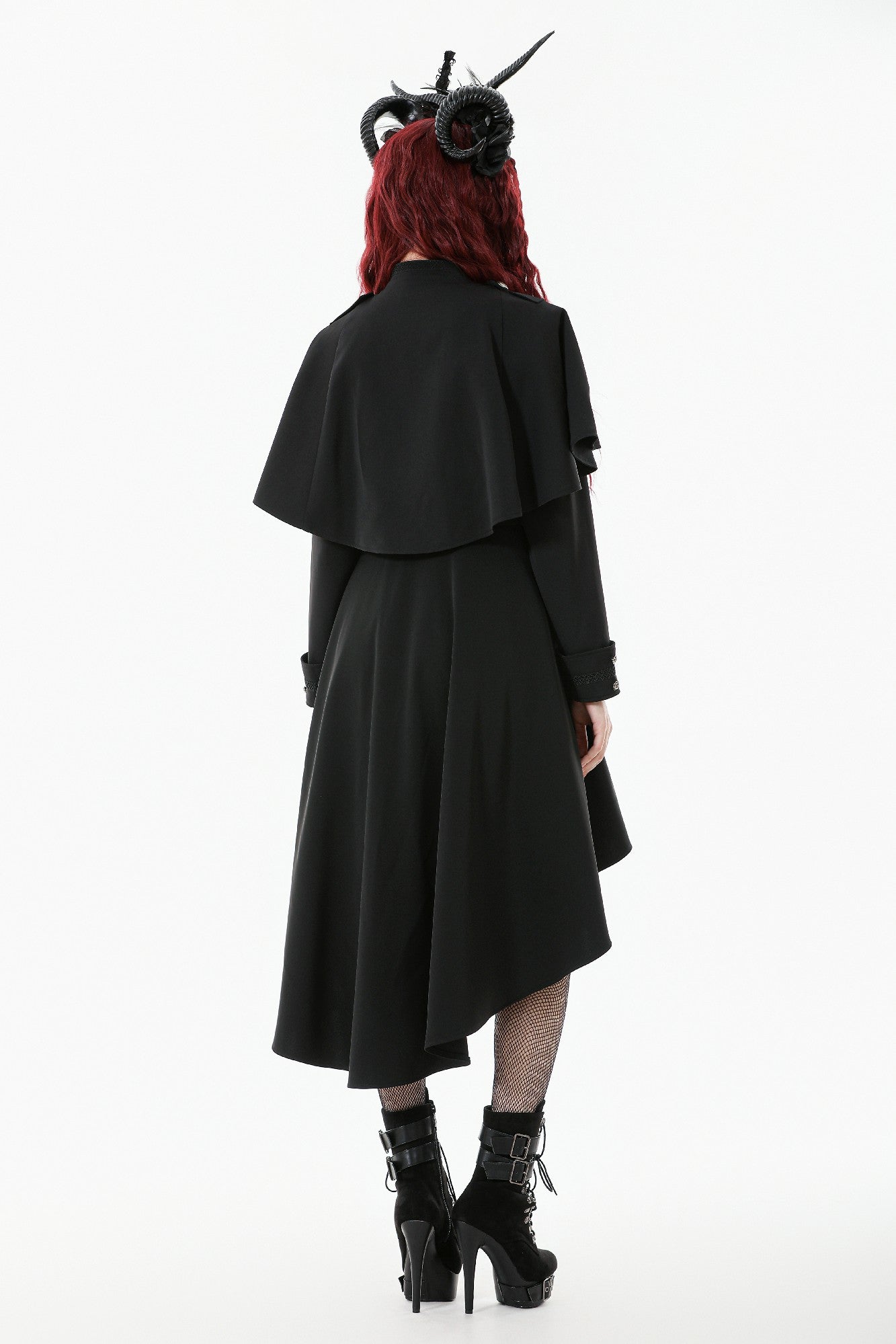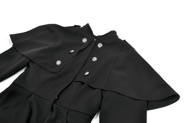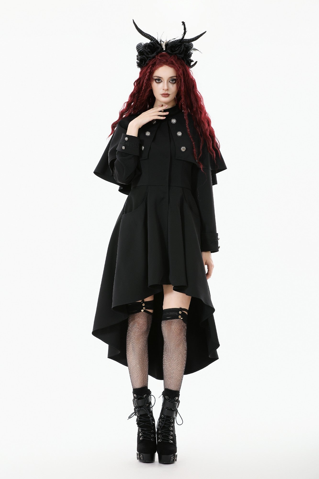 This Mystic Gothic robe features a faux two-piece shoulder cape design that creates a layered, dramatic silhouette. Both the cape and hem are cut shorter in the front and longer in the back, enhancing its mysterious and flowing elegance. The neckline and cuffs are trimmed with delicate synthetic threads, adding refined details, while the front of the cape is adorned with vintage-style buttons for a classic Gothic finish. Perfect for balls, festivals, or theatrical occasions, this robe embodies both mystery and grandeur.