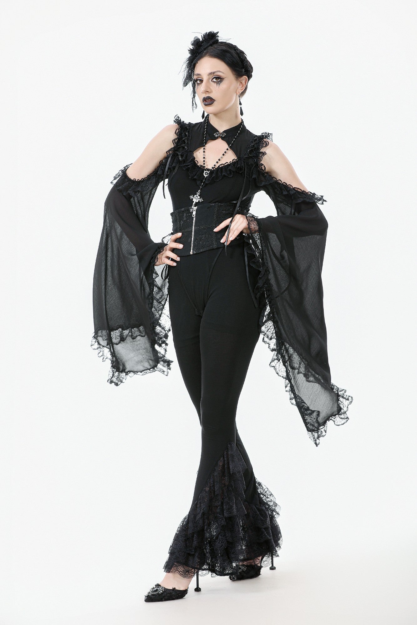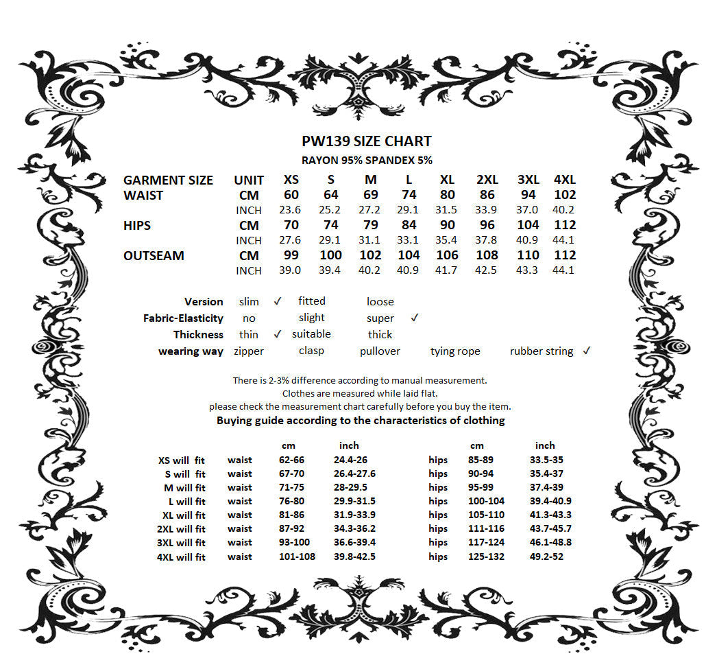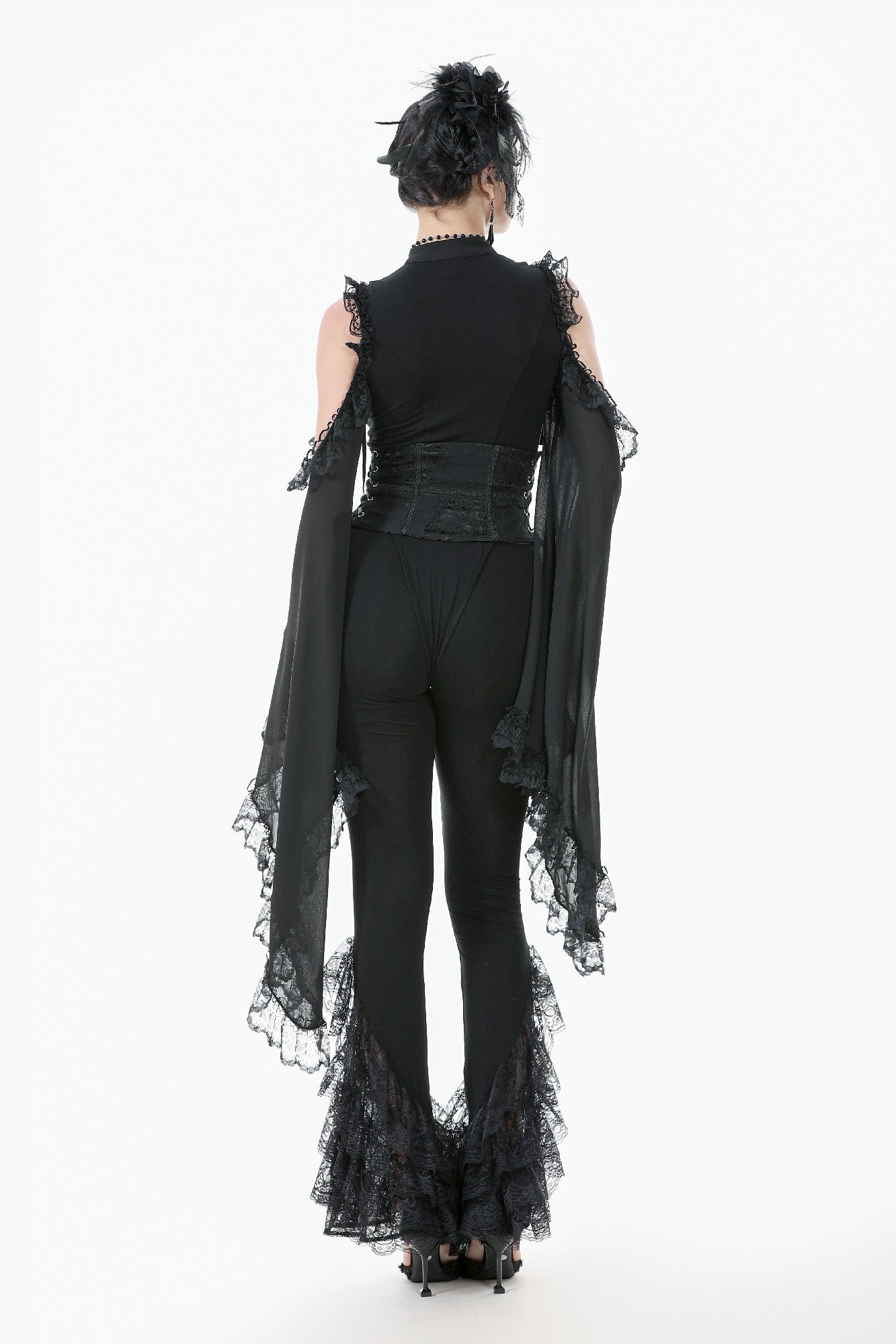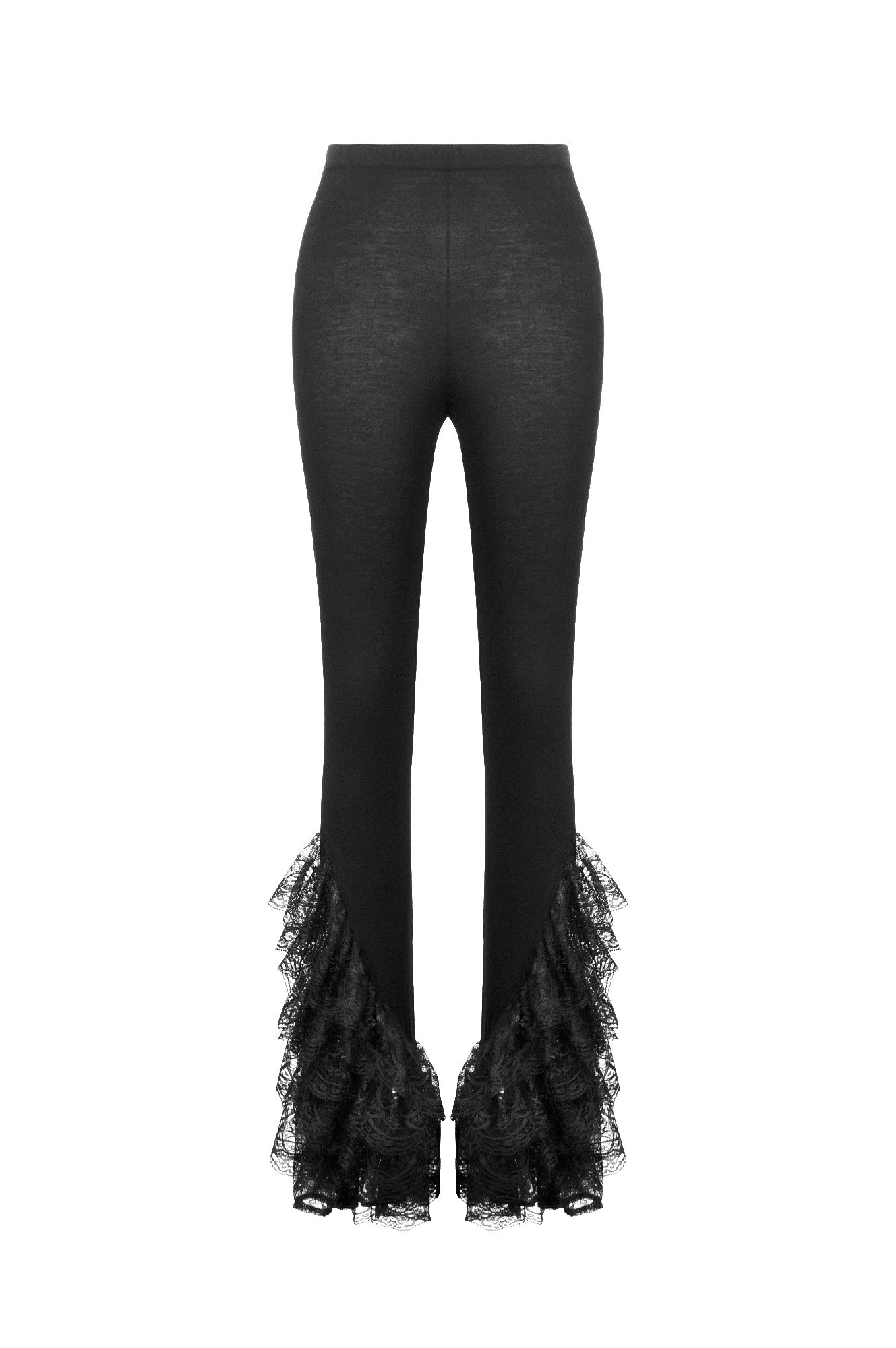 These Gothic-inspired leggings feature a slim, stretchy fabric for a flattering fit, while the flared hems are adorned with five layers of exquisite lace trims. The cascading lace creates a dramatic, elegant silhouette, blending comfort with a bold Gothic charm. Perfect as a statement piece for daily wear or paired with Gothic tops and dresses for parties, balls, or special occasions.