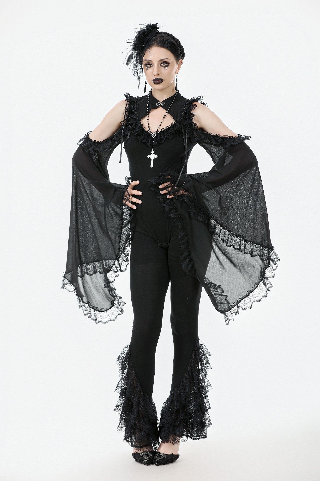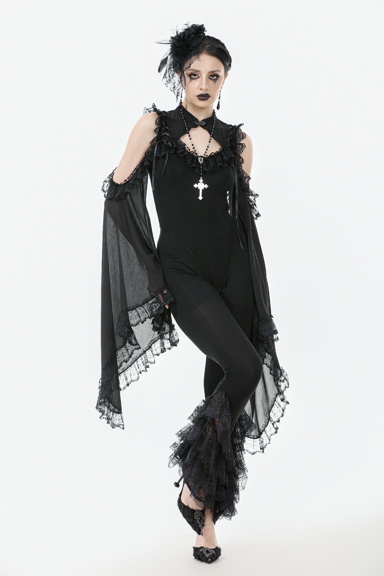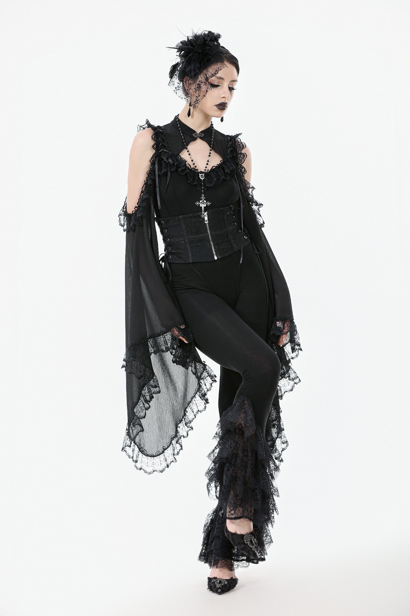 These Gothic-inspired leggings feature a slim, stretchy fabric for a flattering fit, while the flared hems are adorned with five layers of exquisite lace trims. The cascading lace creates a dramatic, elegant silhouette, blending comfort with a bold Gothic charm. Perfect as a statement piece for daily wear or paired with Gothic tops and dresses for parties, balls, or special occasions.