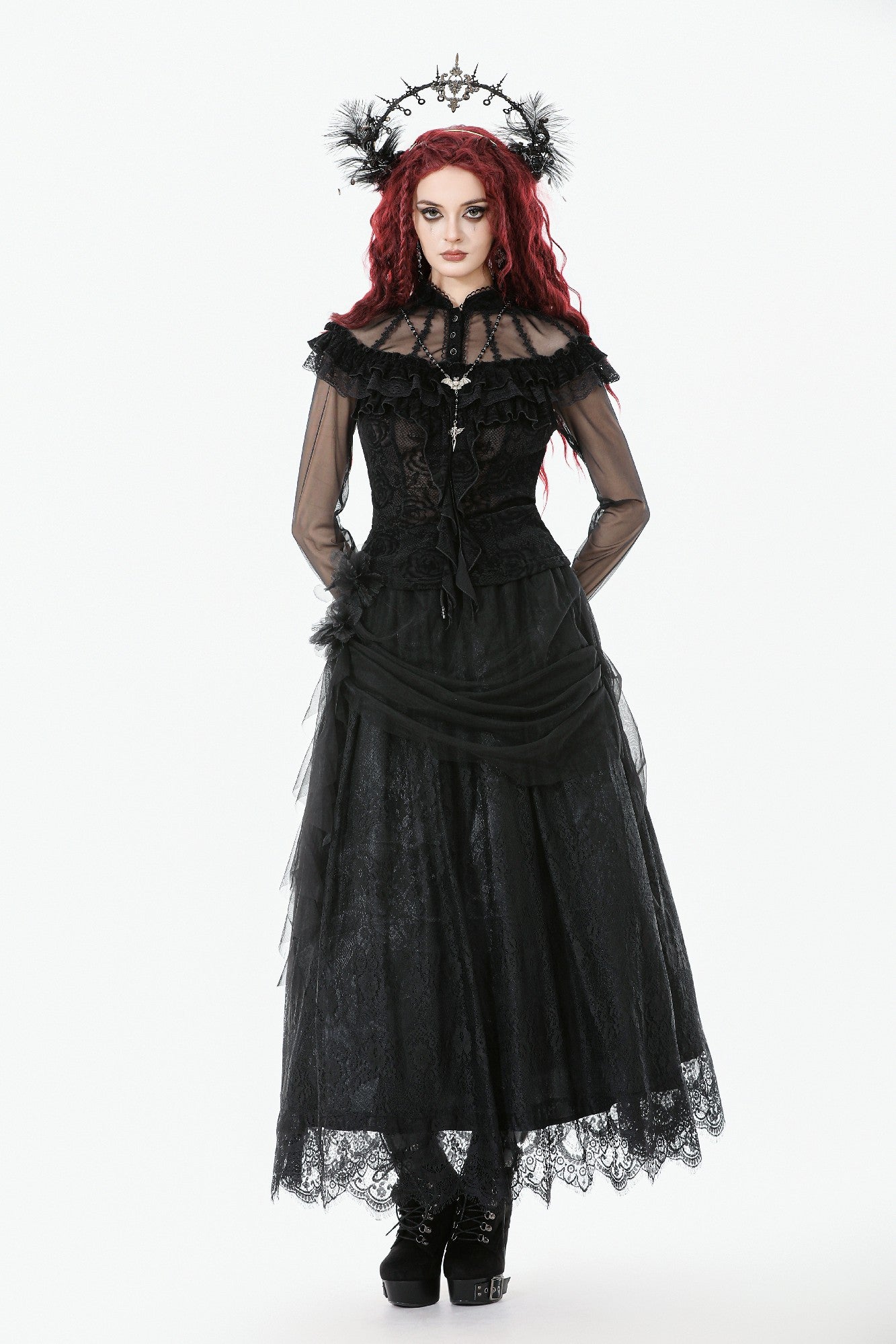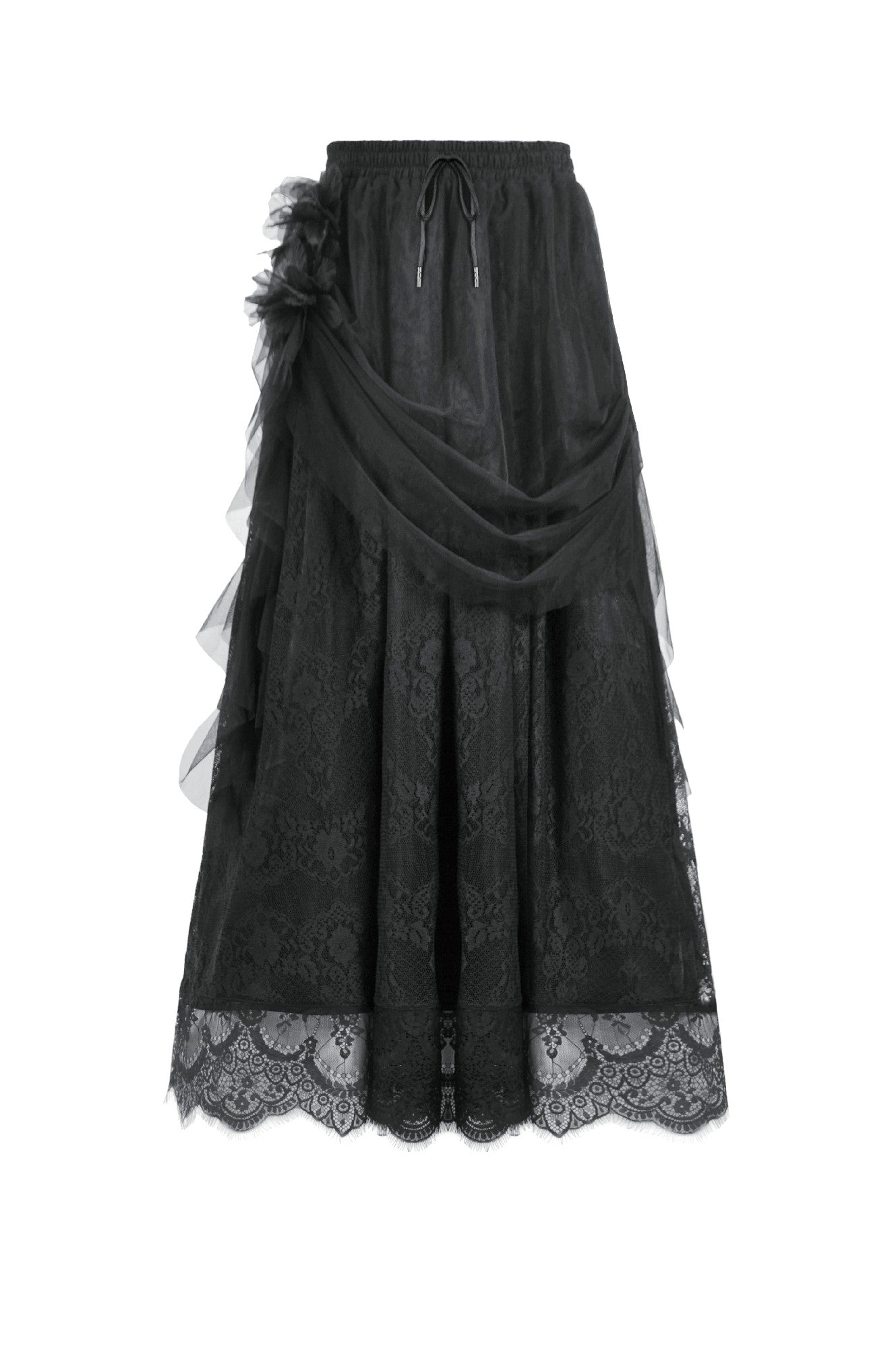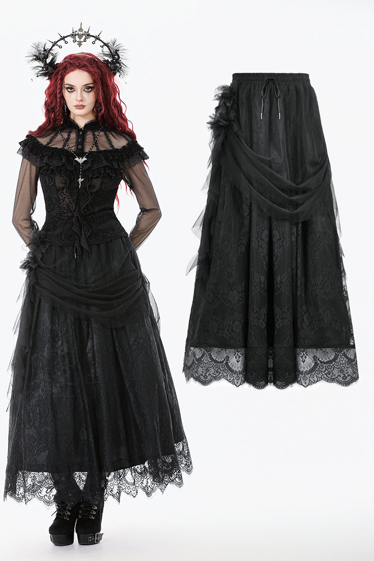 This Gothic court-style maxi skirt is crafted from airy tulle and delicate lace, exuding vintage elegance. The waistband features an elastic band and adjustable drawstring for comfort and a customizable fit. The top layer showcases pleated tulle in a diagonal-left shape, accented on the right side with intricate floral appliqué and flowing tassels for added dimension and romance. The inner layer is made of soft lace and smooth lining, with a full circle of ornate lace trim at the hem. Best paired with Gothic tops and statement accessories, perfect for balls, gatherings, and other formal occasions.