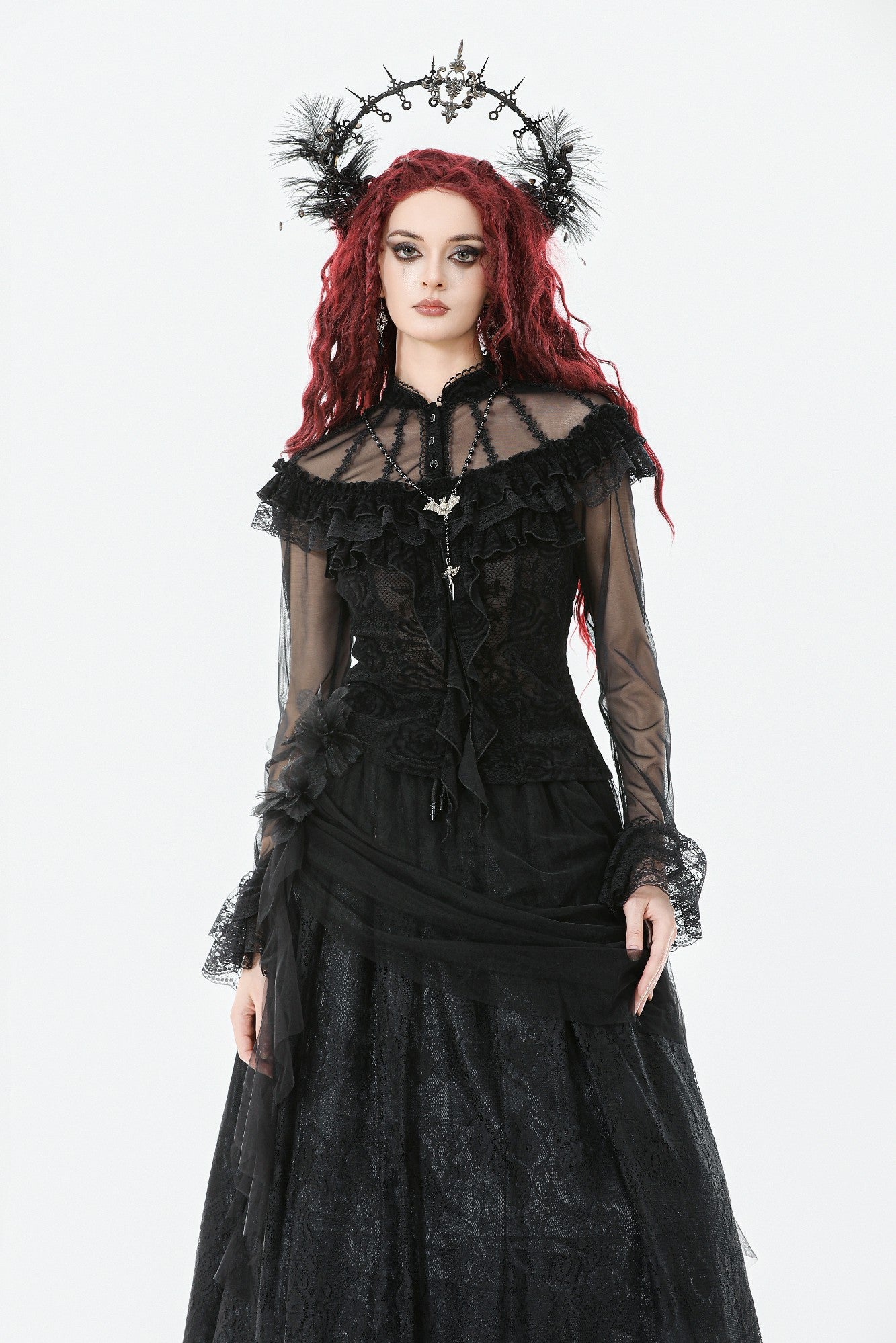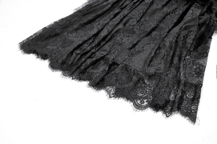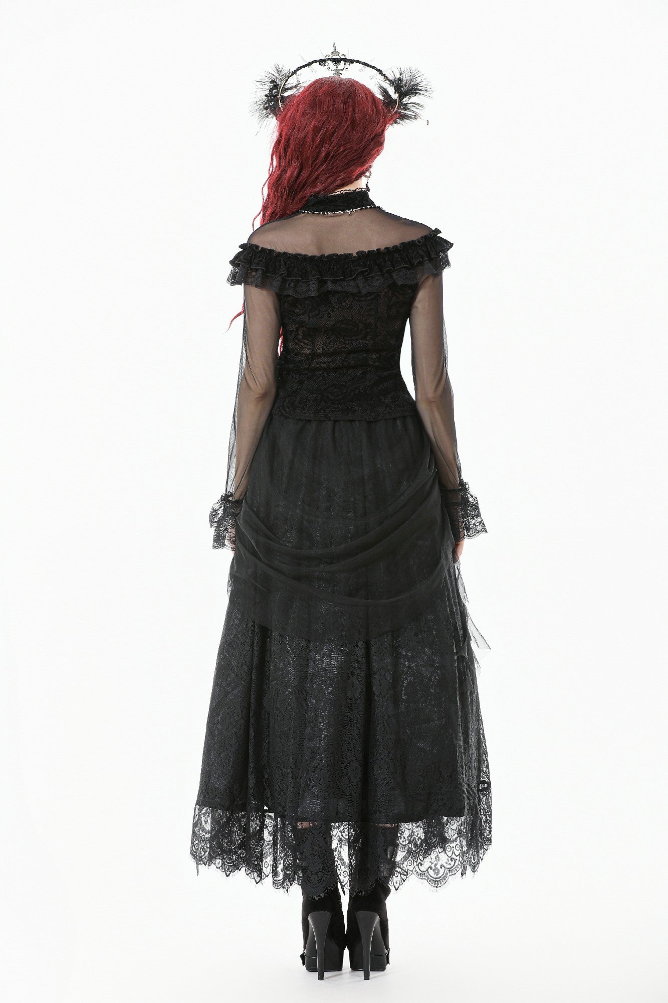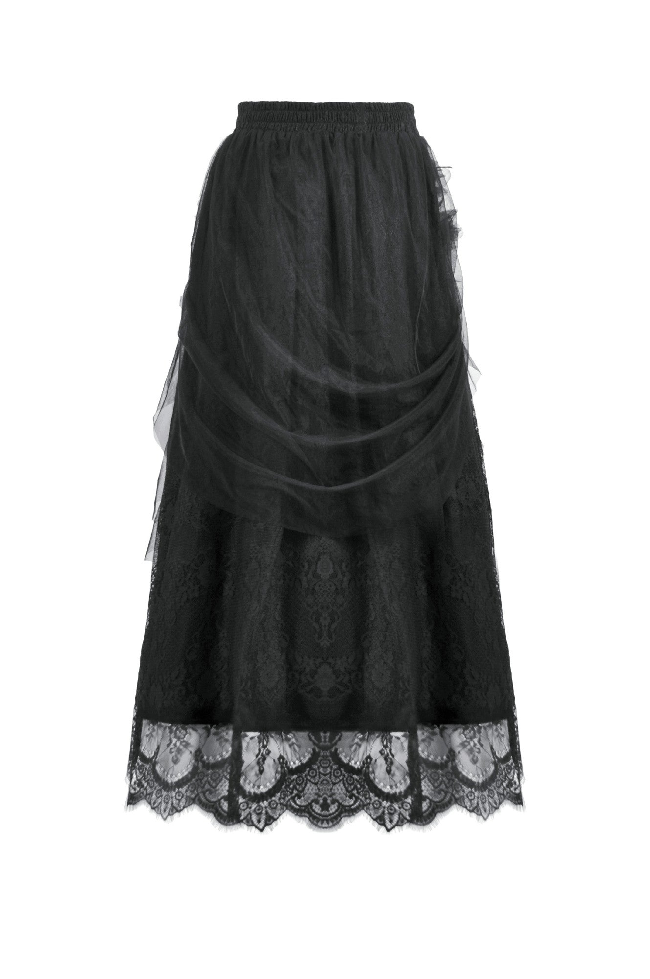 This Gothic court-style maxi skirt is crafted from airy tulle and delicate lace, exuding vintage elegance. The waistband features an elastic band and adjustable drawstring for comfort and a customizable fit. The top layer showcases pleated tulle in a diagonal-left shape, accented on the right side with intricate floral appliqué and flowing tassels for added dimension and romance. The inner layer is made of soft lace and smooth lining, with a full circle of ornate lace trim at the hem. Best paired with Gothic tops and statement accessories, perfect for balls, gatherings, and other formal occasions.