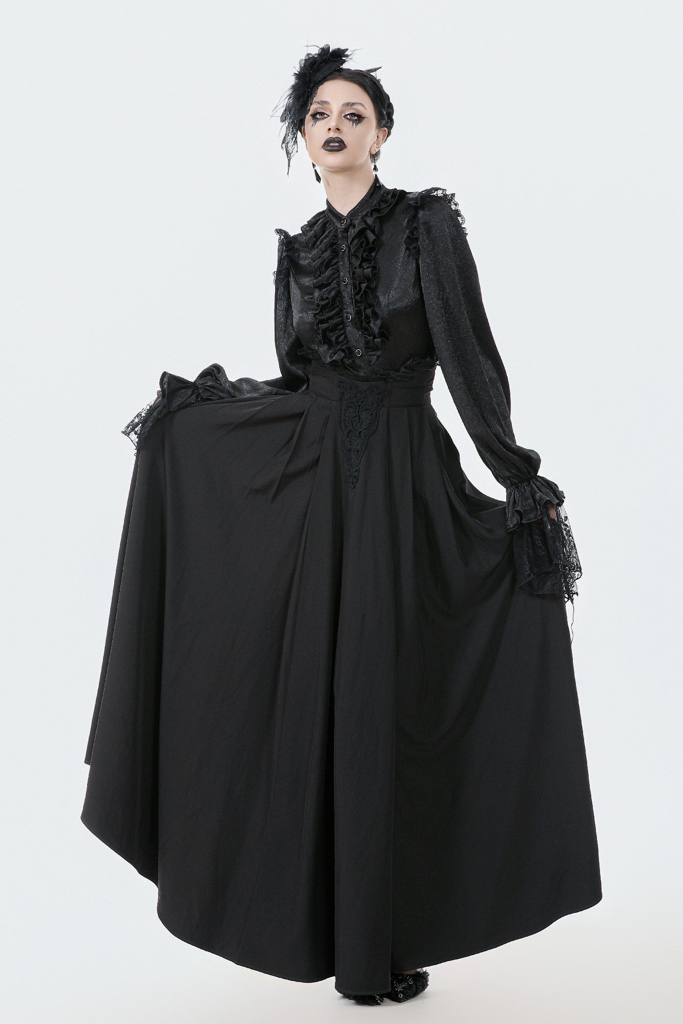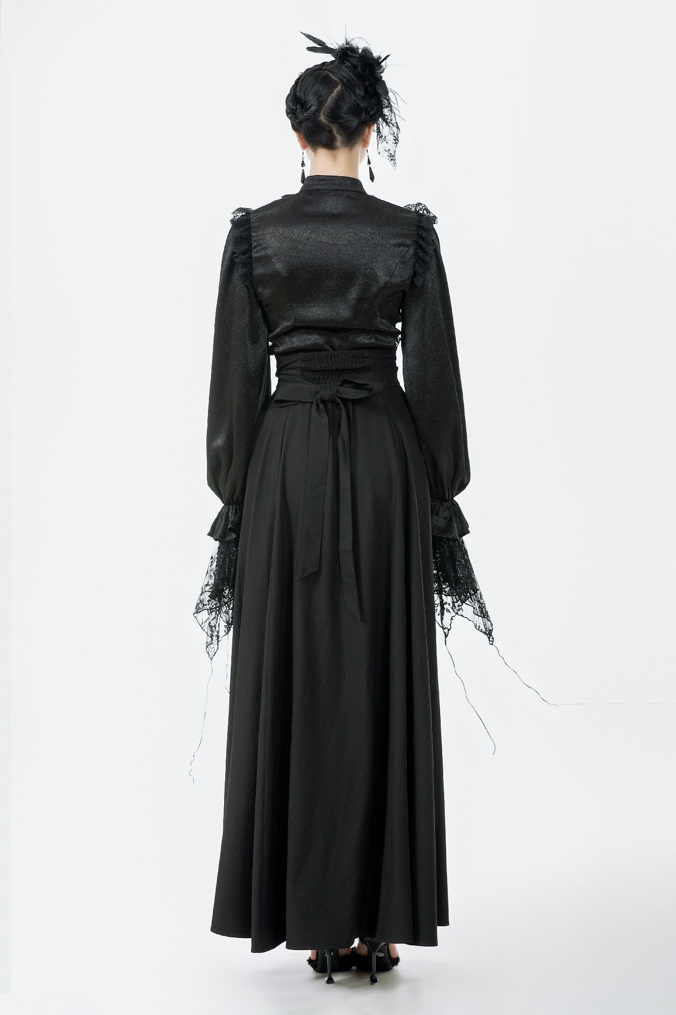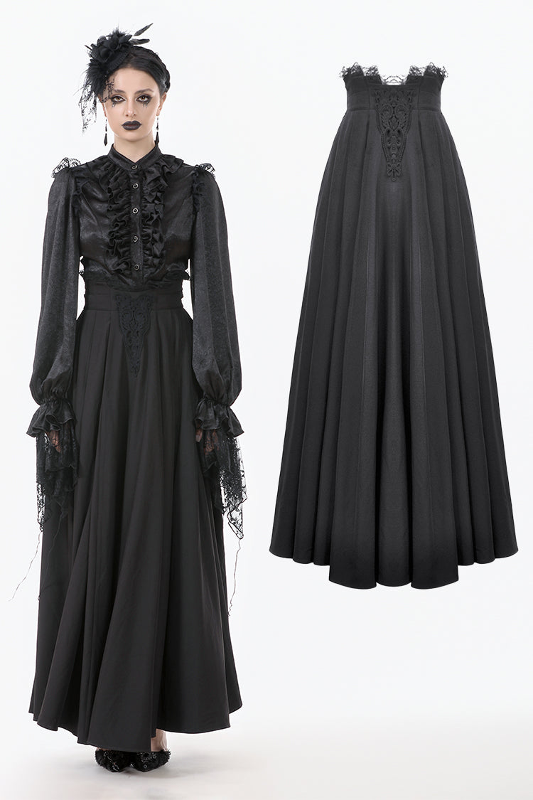 Channel elegance with a dark twist in this Gothic nun-inspired maxi skirt. Structured pleats run neatly down both sides, creating a clean, elongated silhouette. A delicate embroidered motif at the center front adds subtle detail, while adjustable waist ties and a gathered back ensure a perfect fit.