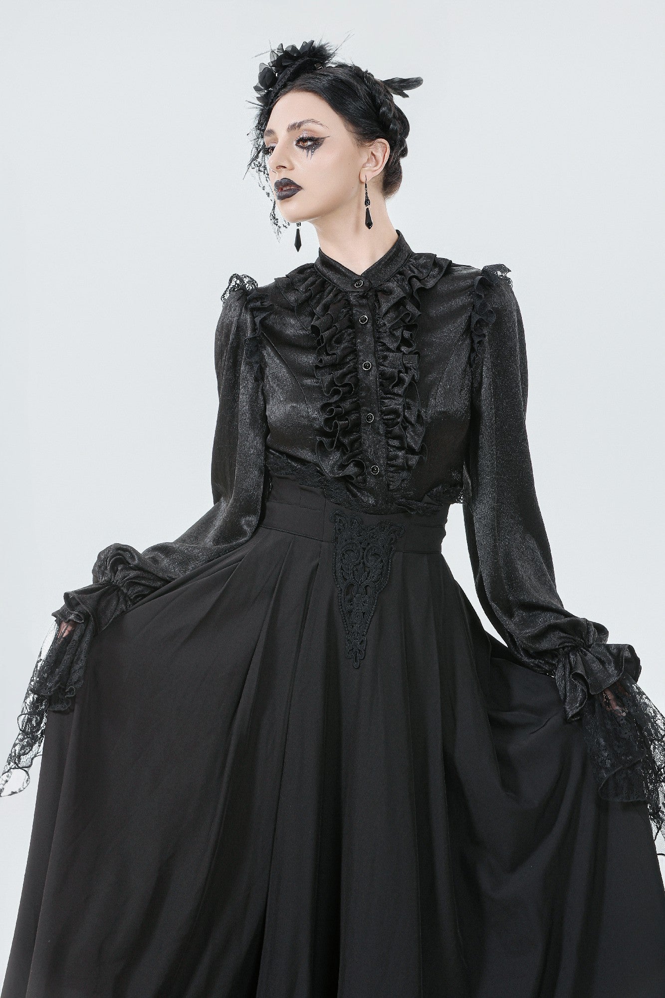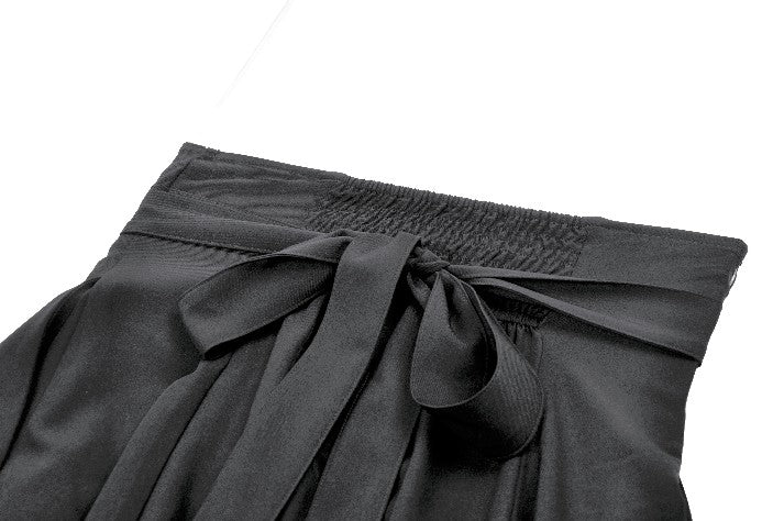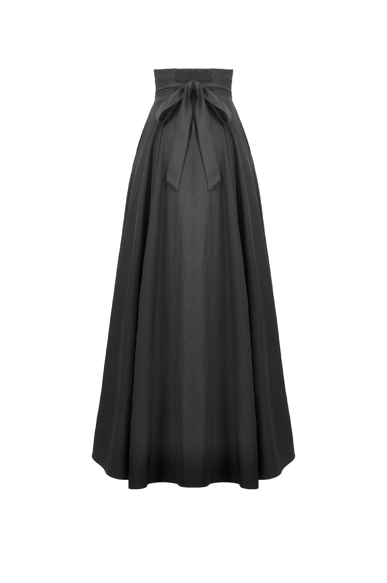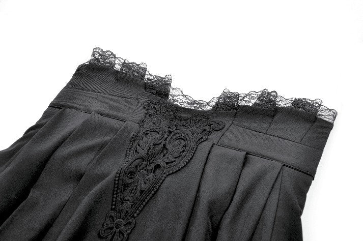 Channel elegance with a dark twist in this Gothic nun-inspired maxi skirt. Structured pleats run neatly down both sides, creating a clean, elongated silhouette. A delicate embroidered motif at the center front adds subtle detail, while adjustable waist ties and a gathered back ensure a perfect fit.