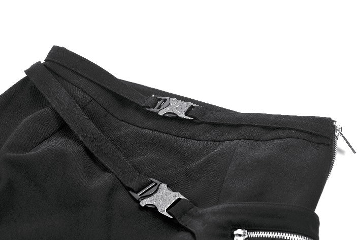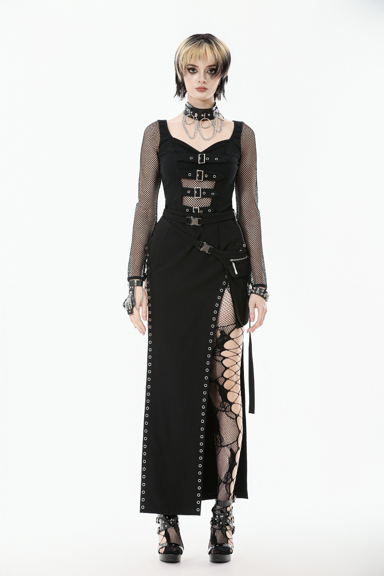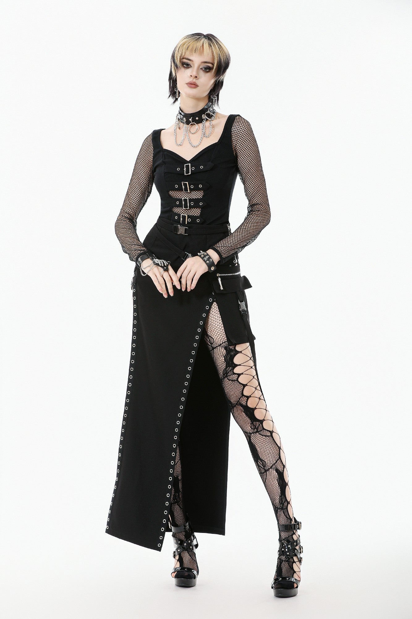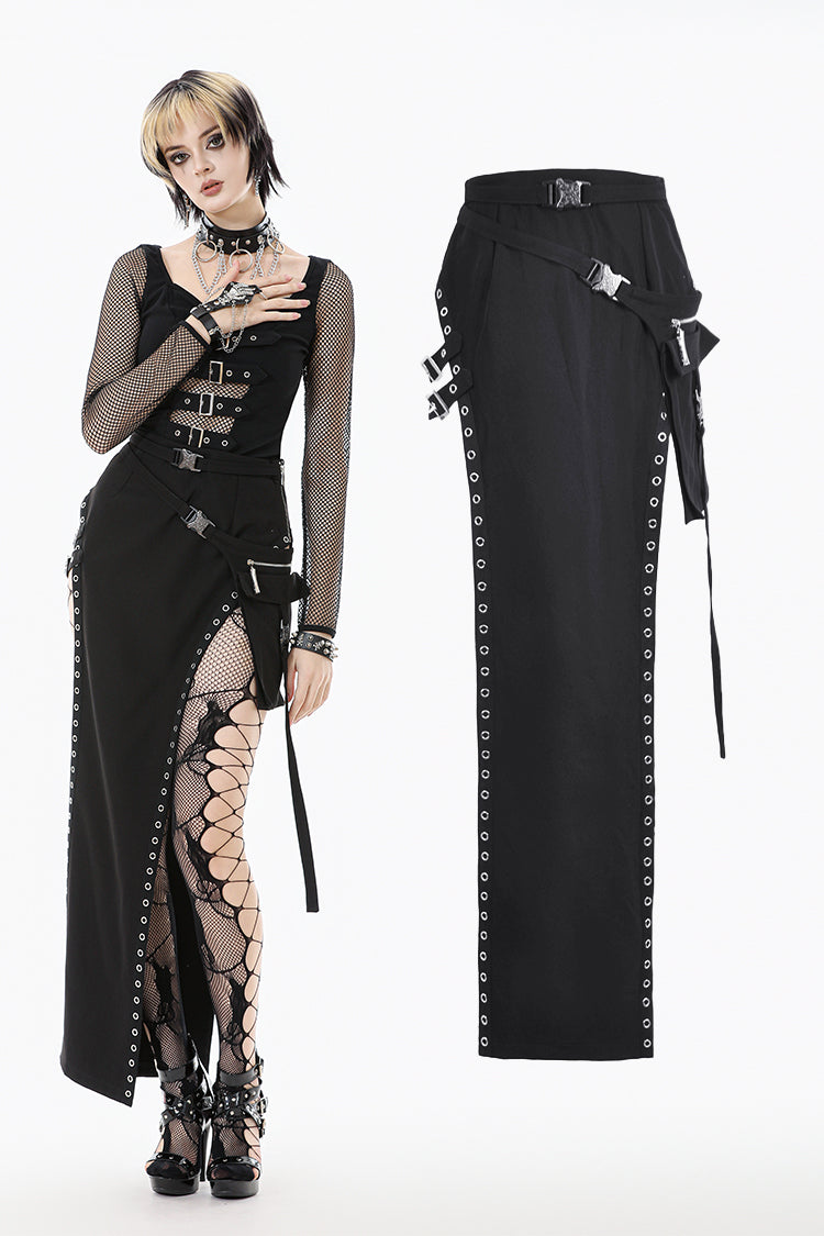 Step into the spotlight with this punk-inspired high-slit midi skirt. Eyelet trim lines the daring slit, creating a bold industrial edge, while strap-and-buckle details add visual intrigue. The waist features an ornate metal clasp for a statement finish, and a side flap pocket offers both style and function.