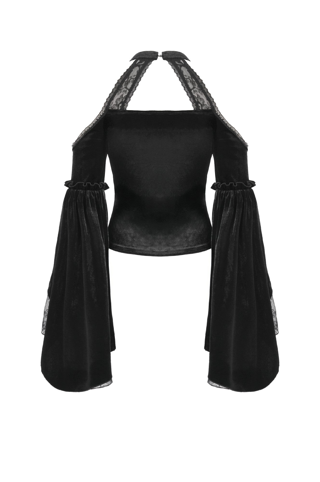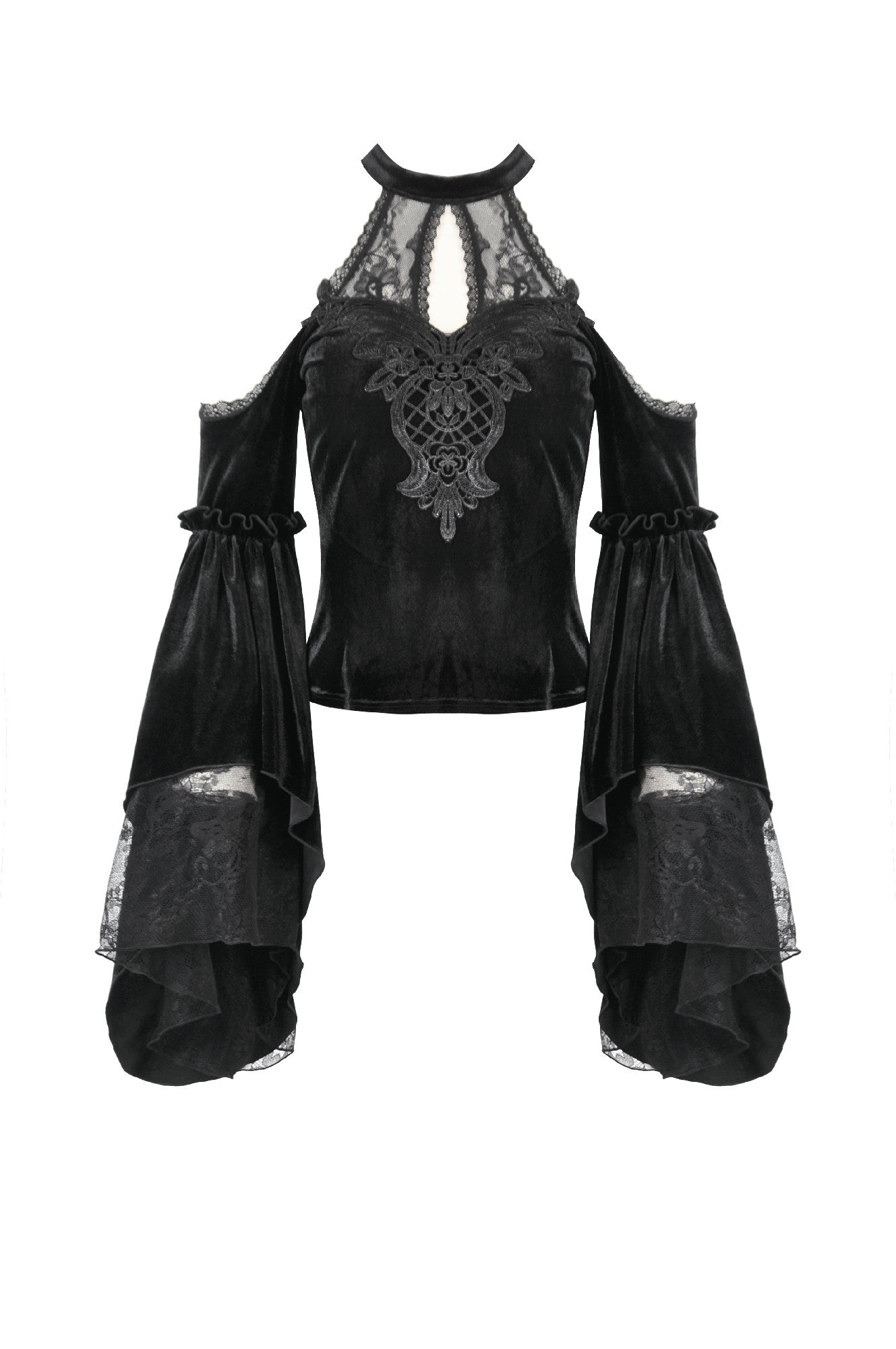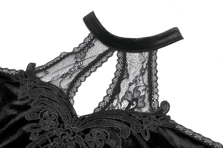 This Gothic court-style blouse features a fitted silhouette crafted from a luxurious blend of lace and velvet. The front showcases a striking teardrop cutout framed with inverted trapezoid lace and adorned with delicate embroidered appliqué, adding a touch of mystery and refinement. At the back, fabric loops and metal mushroom buttons allow for an adjustable open-close design, blending practicality with elegance.