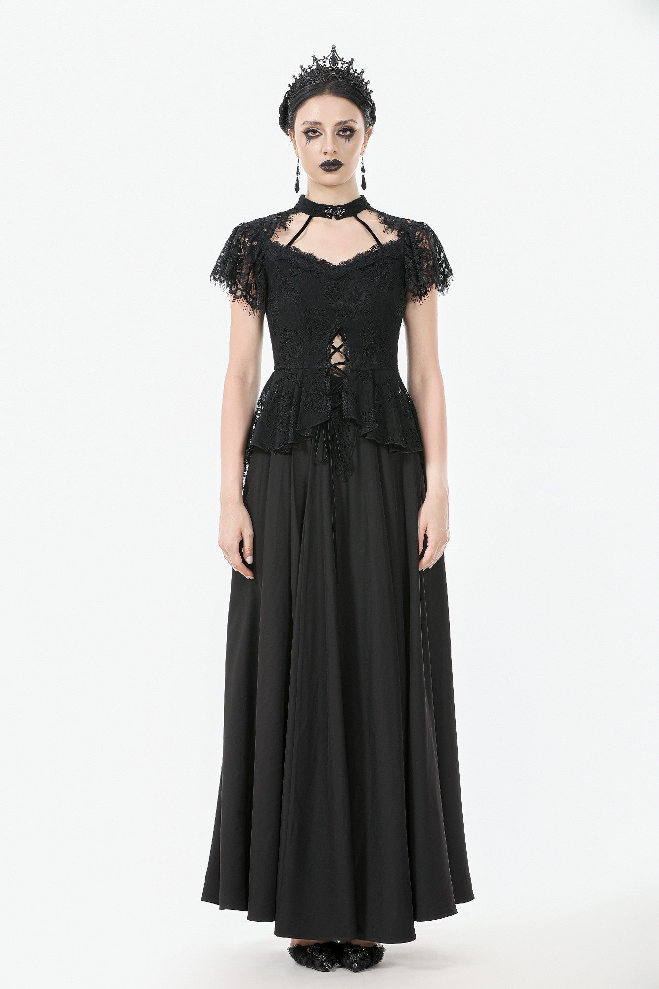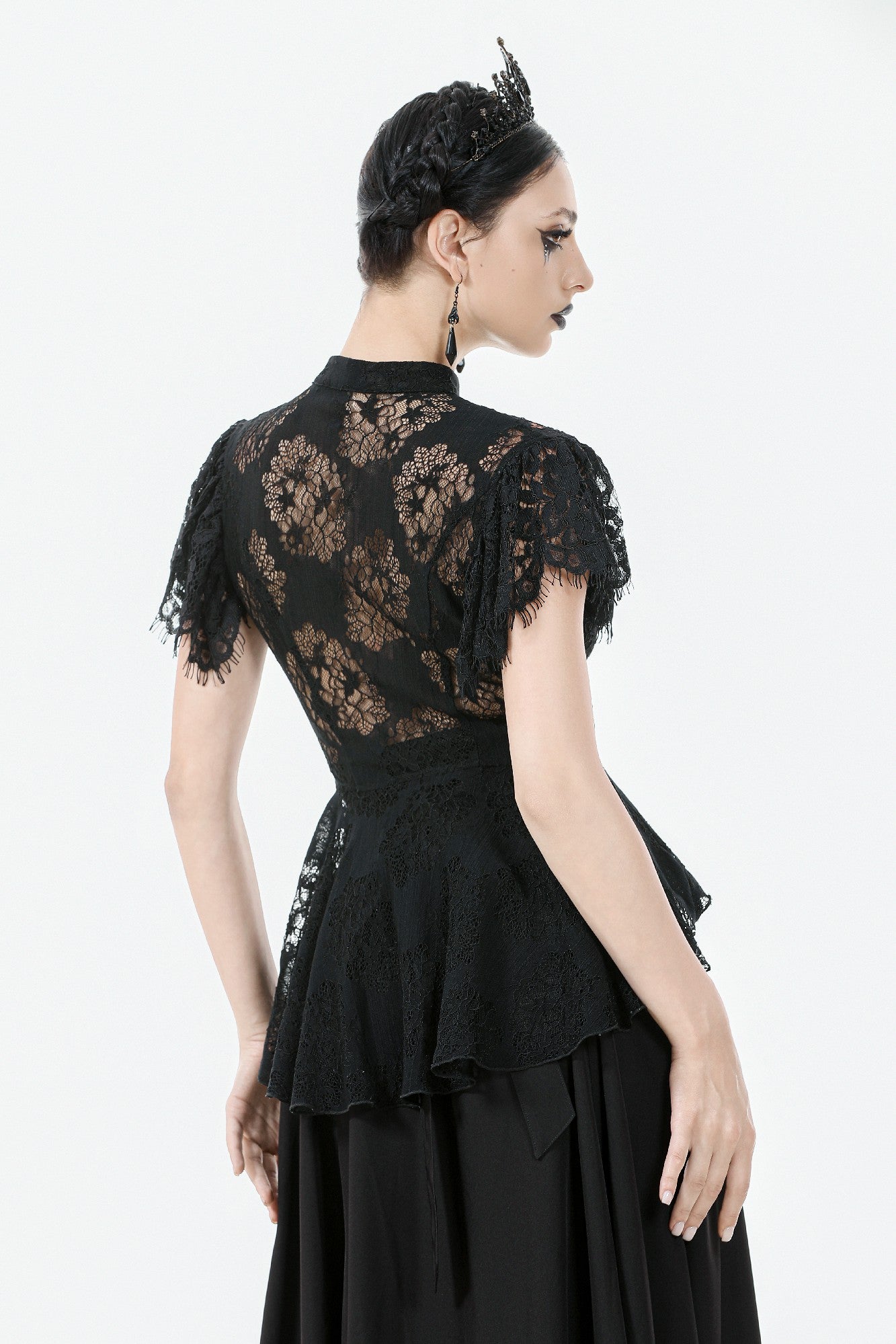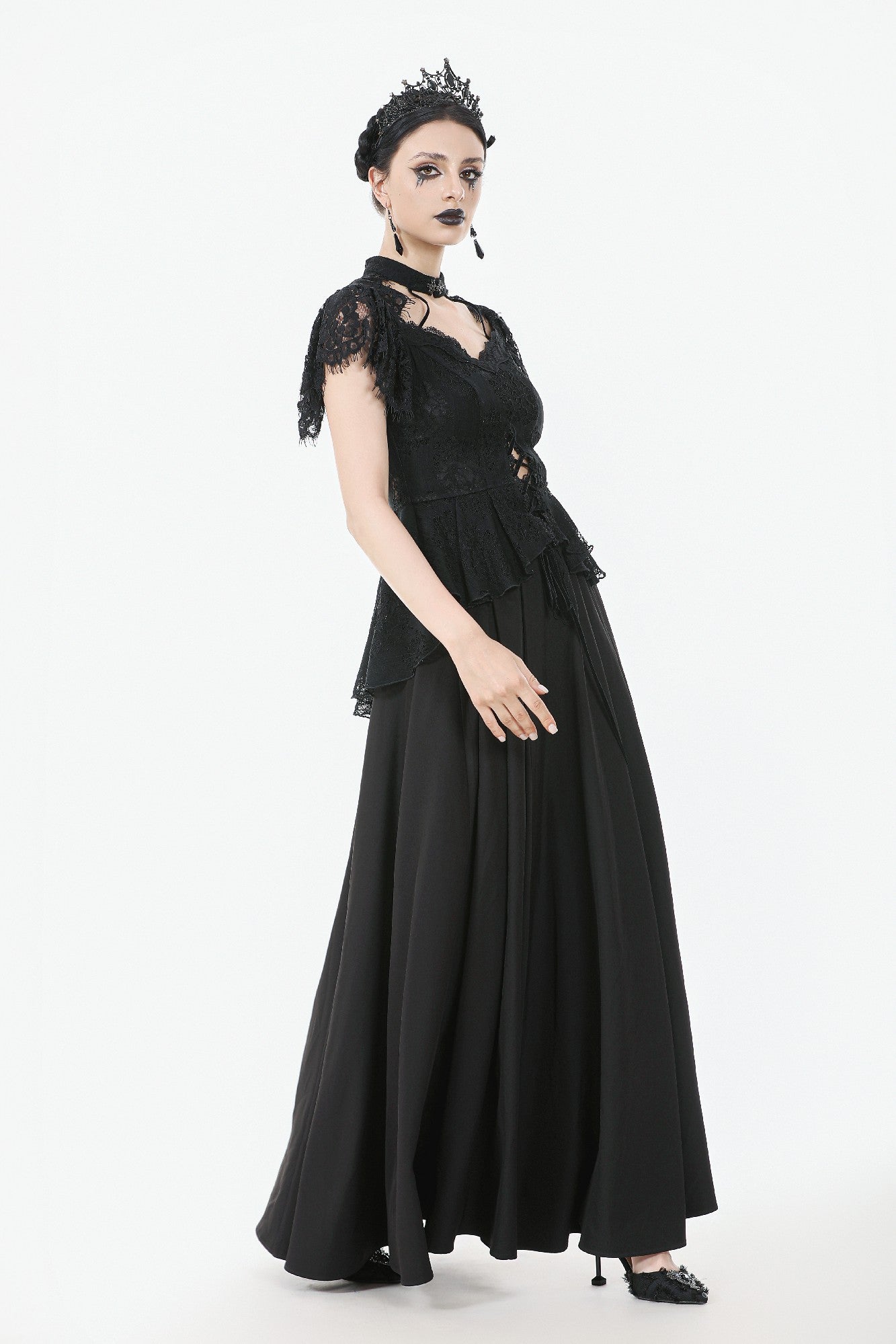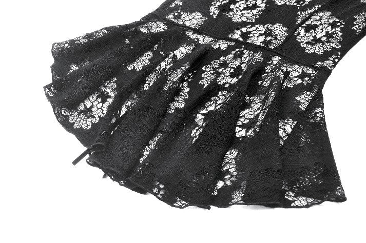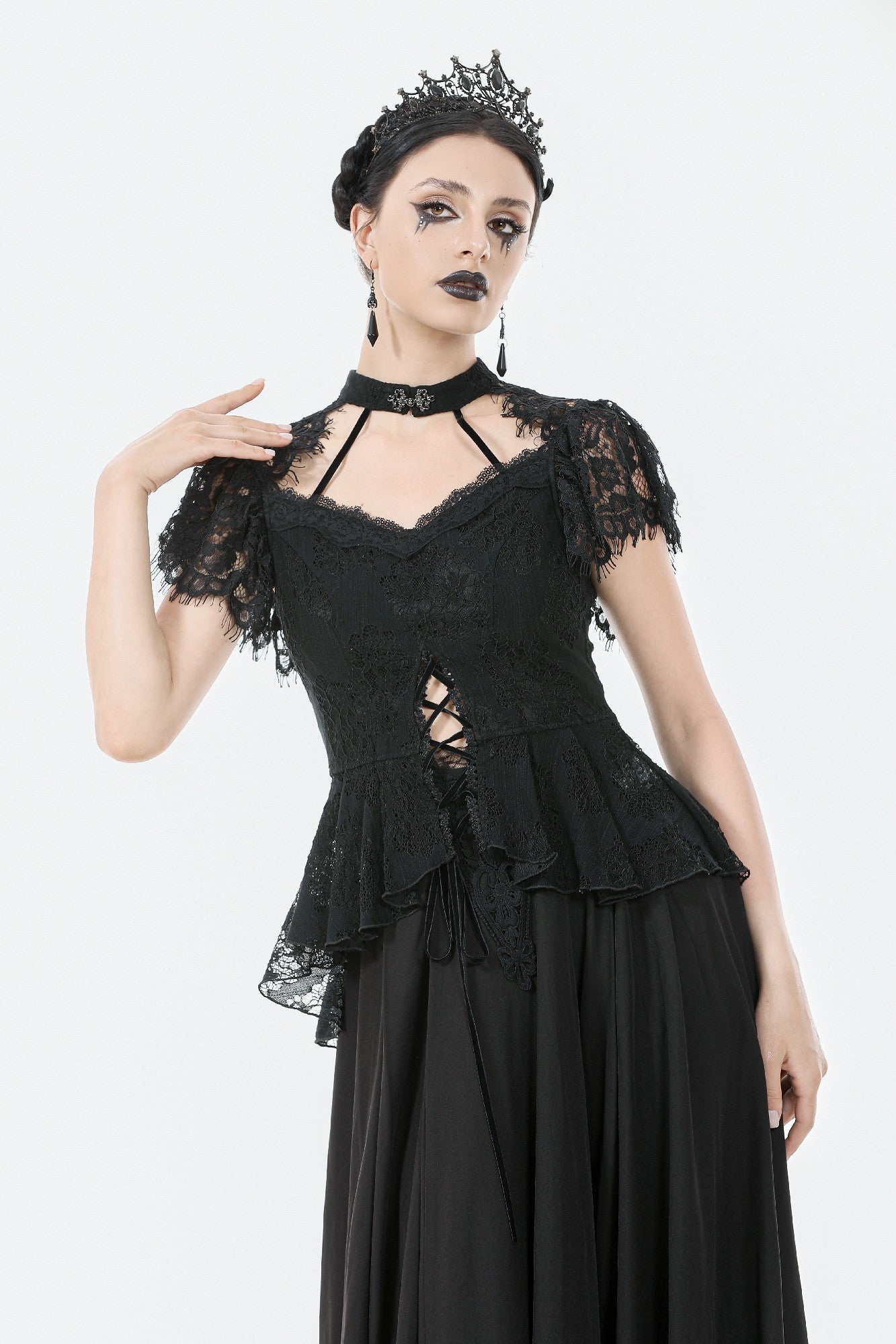 This Gothic lace blouse is crafted with delicate lace fabric in a flattering slim-fit silhouette. The high lace collar adds a touch of elegance, while the gunmetal-toned clasps at the neckline bring a subtle yet distinctive gothic edge. The front slit with lace-up detail enhances both layering and visual appeal. Featuring a side zipper for easy wear, this versatile piece is perfect for both everyday styling and pairing with statement pieces for parties or evening events.