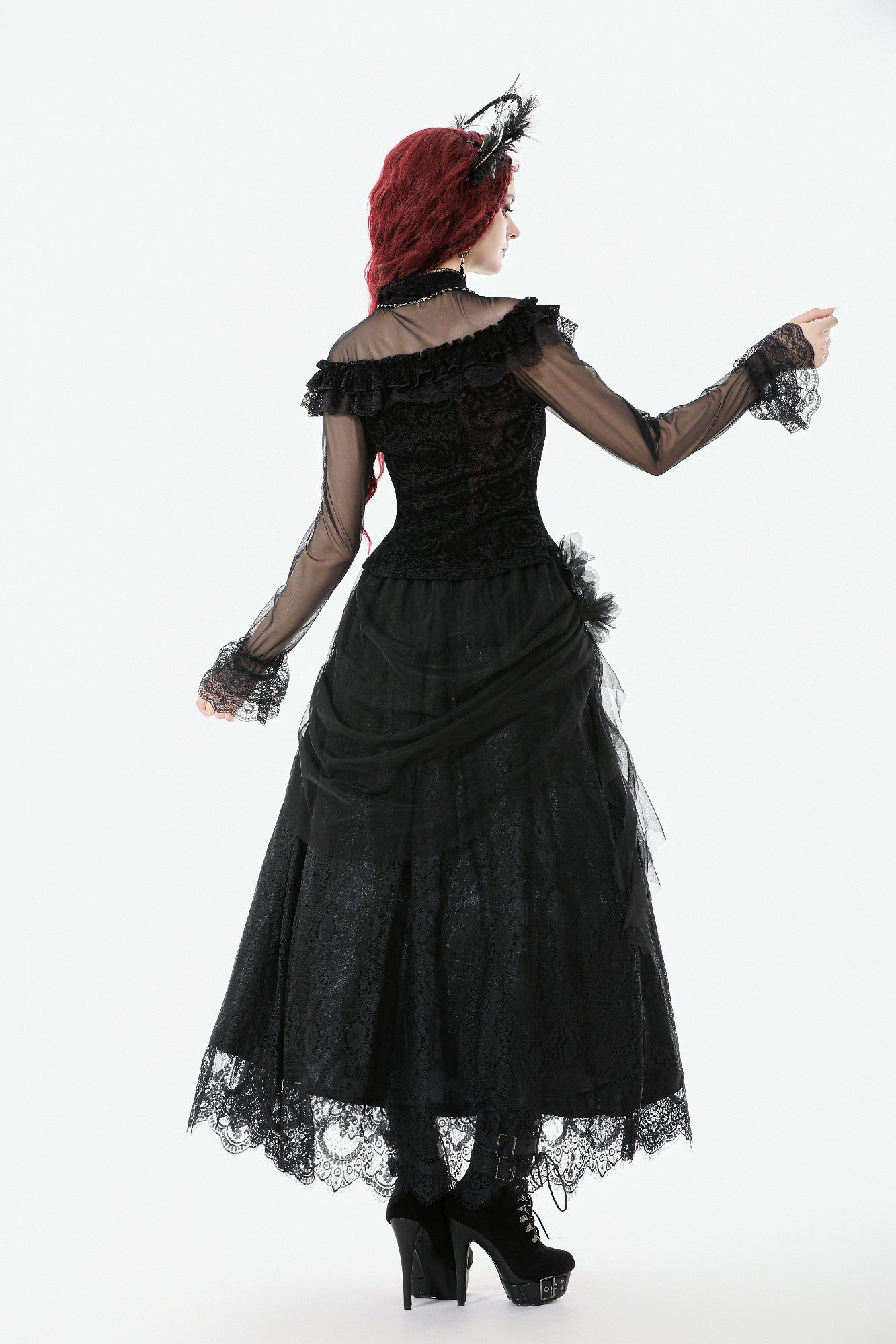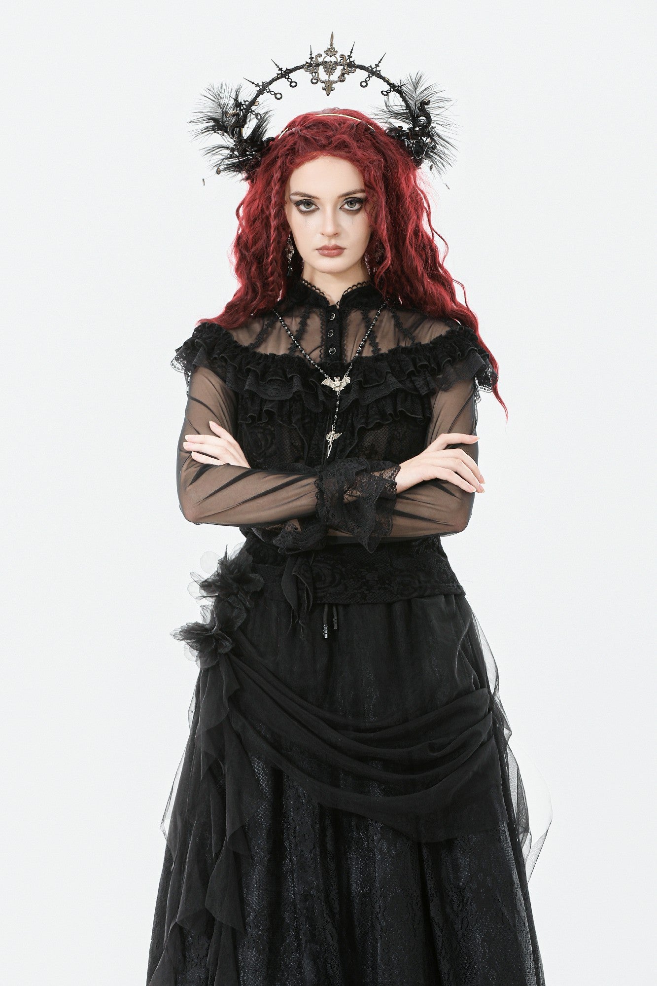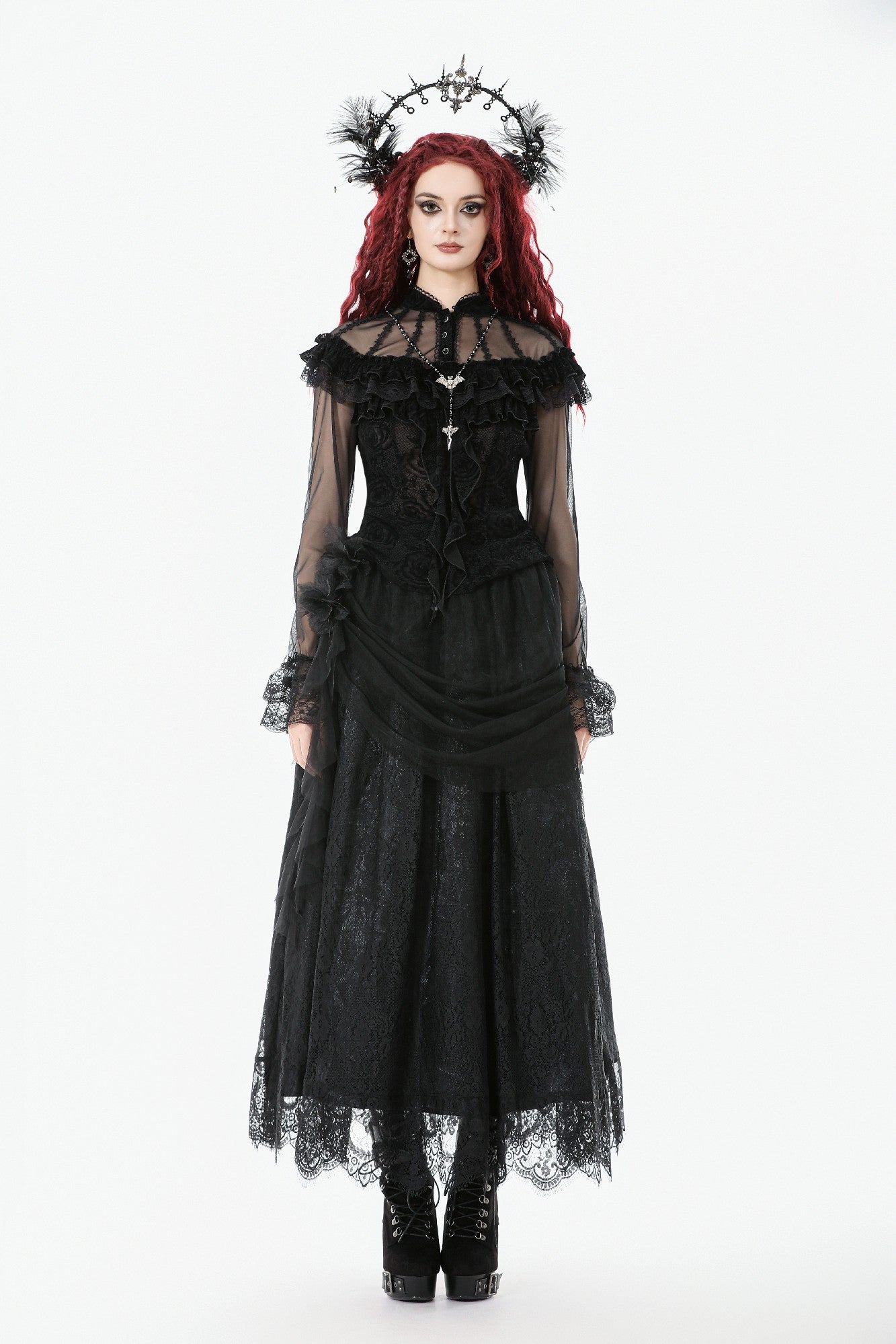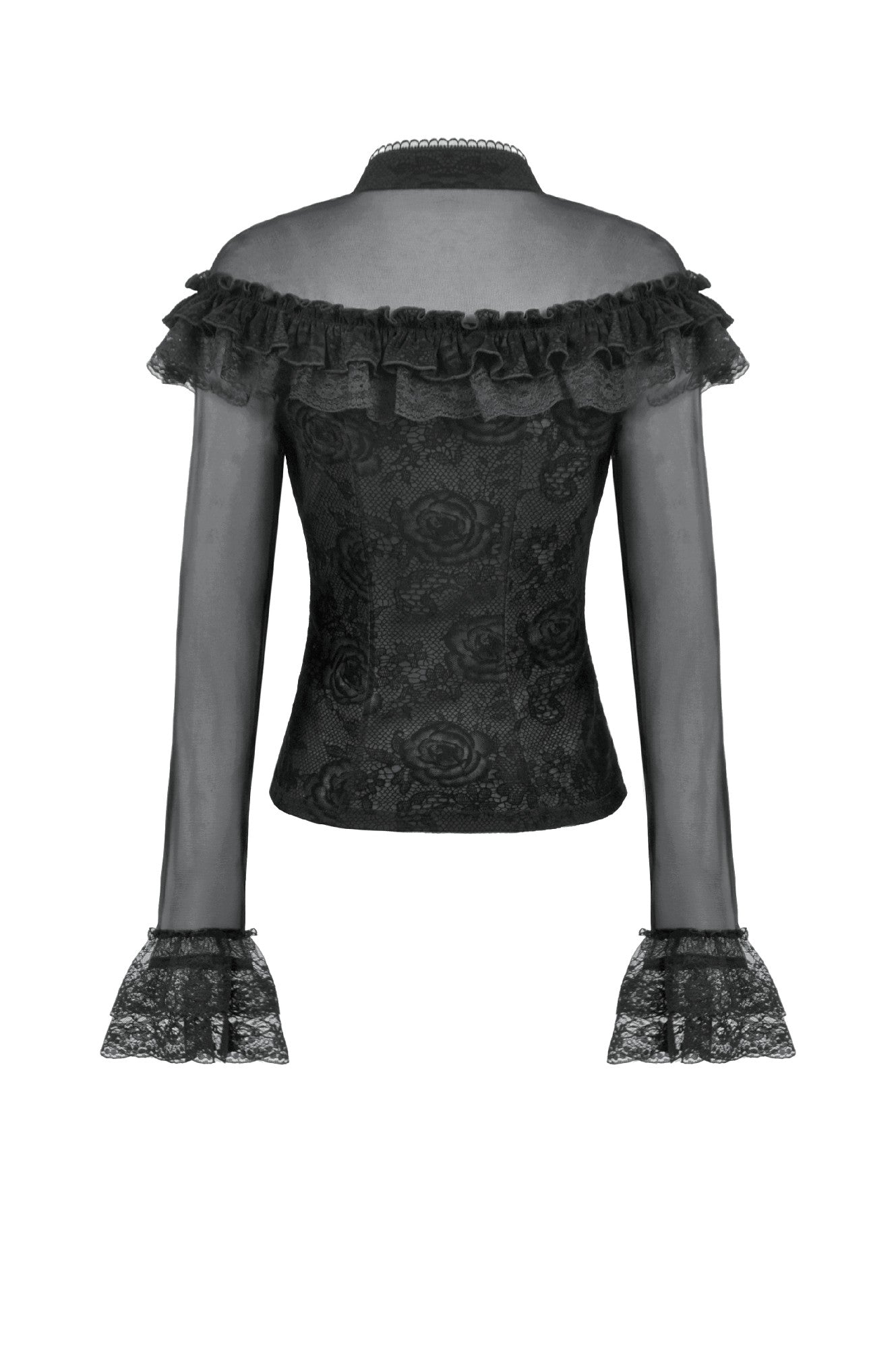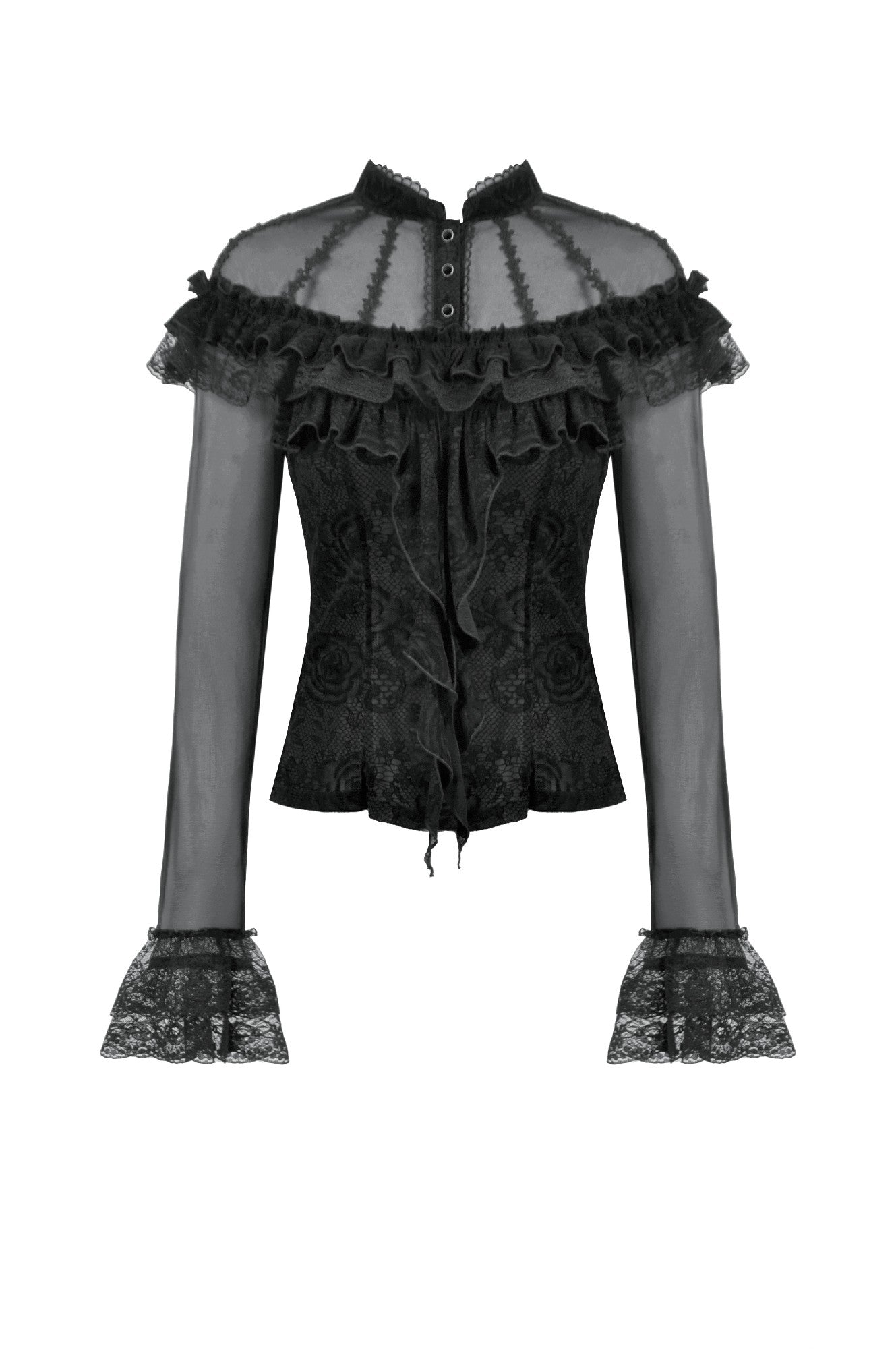 This gothic court-style blouse is crafted from flocked fabric and stretch sheer mesh, embodying both luxury and mystery. The stand collar is trimmed with scalloped lace, while the chest features sheer mesh with delicate floral lace accents. Decorative scalloped lace runs along the placket, fastened with three black gemstone buttons for a refined gothic touch. The front is adorned with triple-layered ruffles—flocked fabric, lace, and cascading lace—adding a dramatic layered effect. Slim-fit mesh sleeves with double-layer lace cuffs complete the design. Perfect for daily wear or standing out at gatherings with an elegant gothic statement.
