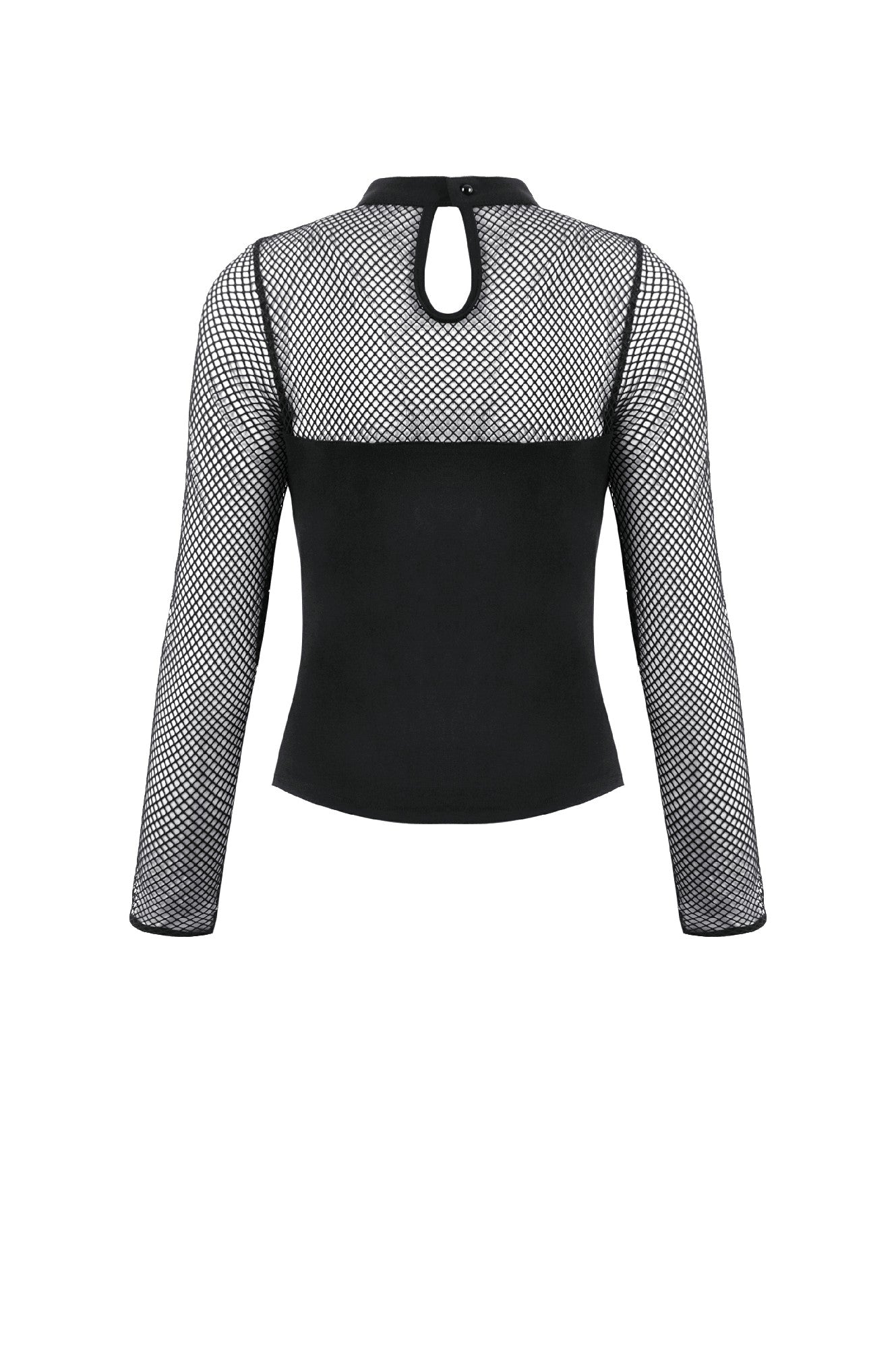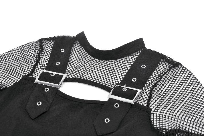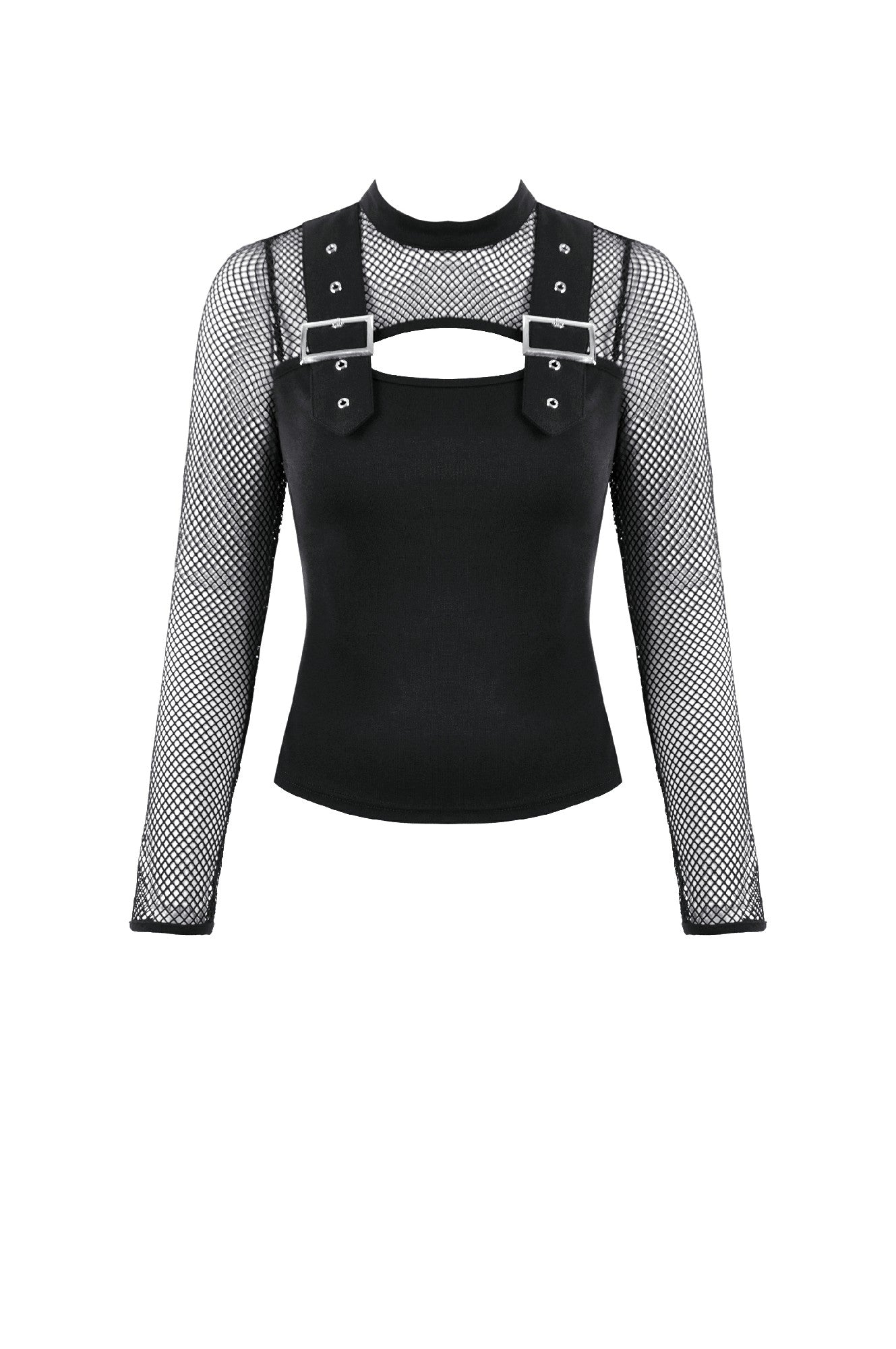 Punk Knitted Top with Mesh Overlay and Shoulder Buckle Details TW665