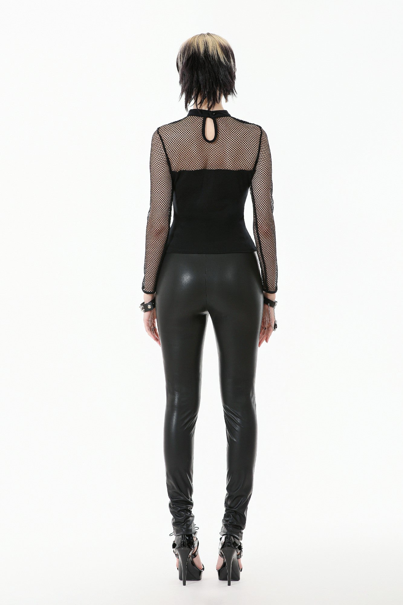 This punk-style knitted top features a striking mix of materials. The upper part is made of mesh fabric, creating a sheer overlay effect, while the lower part is crafted from stretch knit fabric for a body-hugging silhouette. Two decorative straps with metal grommets and buckles adorn the shoulders, adding a bold punk edge. Minimal yet edgy, this top is ideal for everyday styling, parties, or stage outfits.