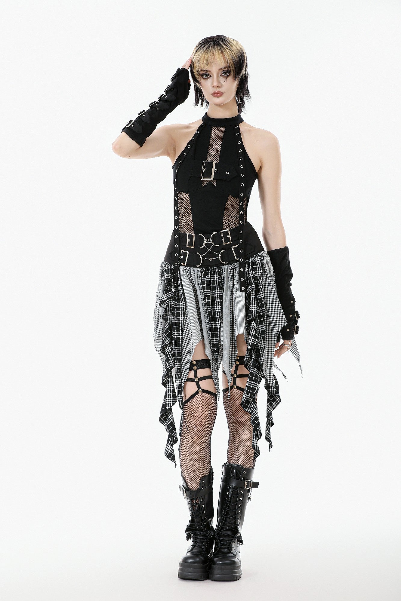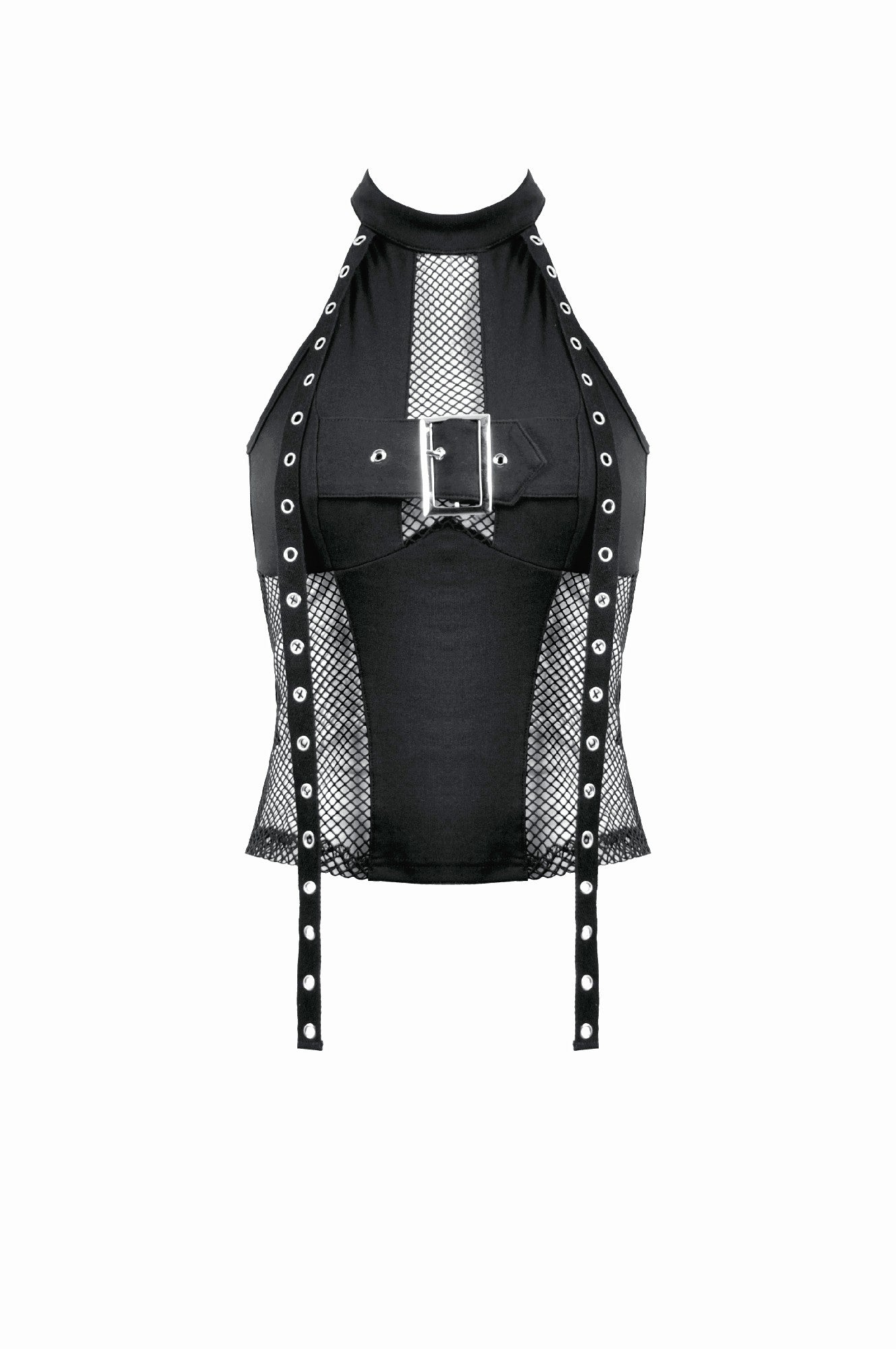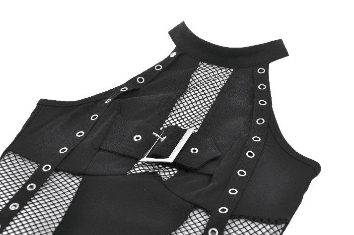 This punk knit top combines mesh and knit fabrics in a striking patchwork design. The center front features a mesh cutout framed with grommet webbing, while additional mesh panels at the waist sides enhance the edgy, see-through effect. The back fastens with metallic mushroom buttons, blending function with detail. Slim-fitting and versatile, this piece is perfect for punk street style or bold performance looks.