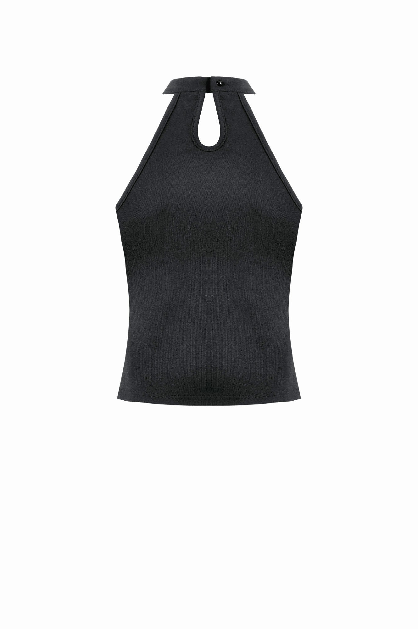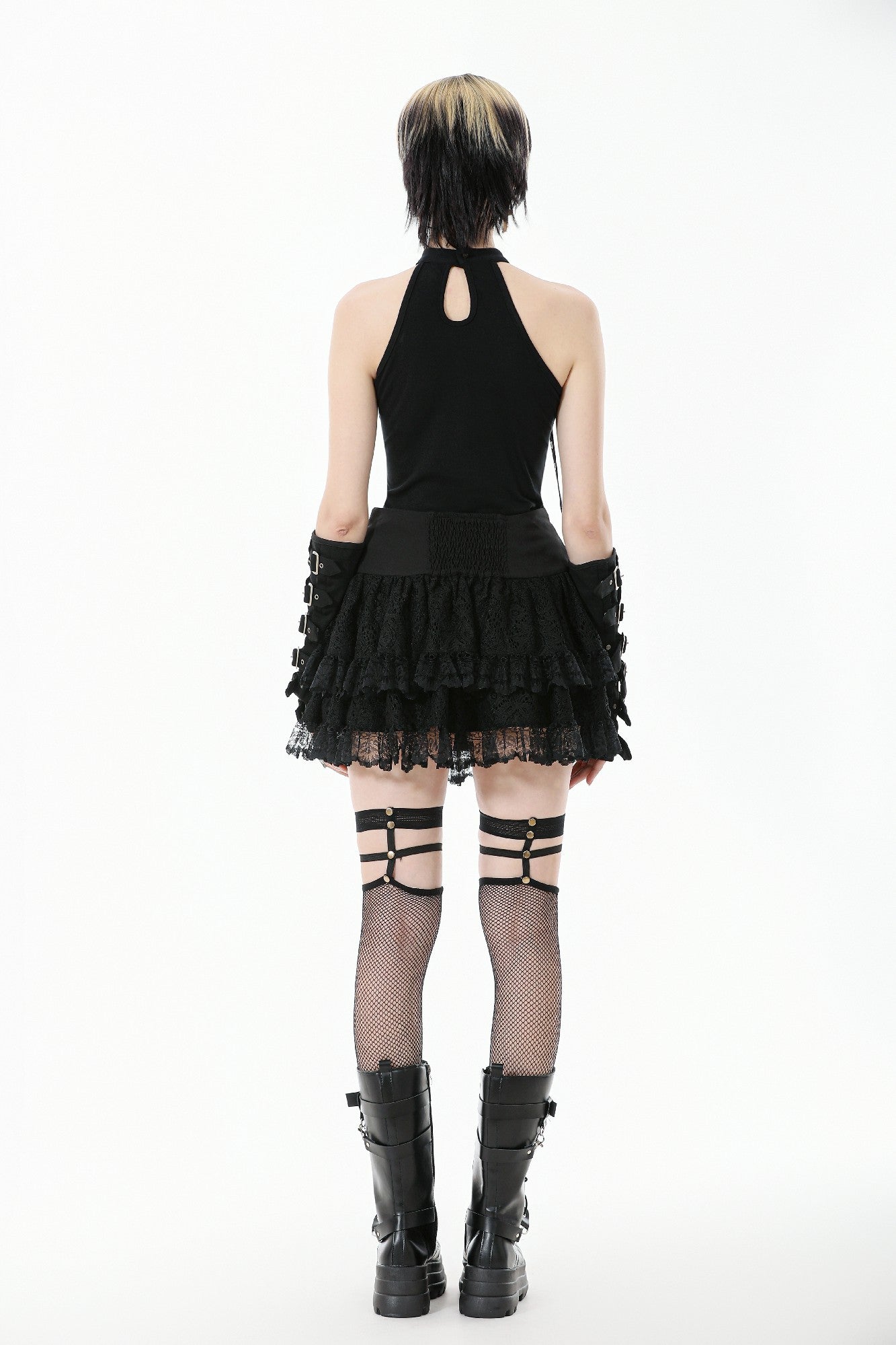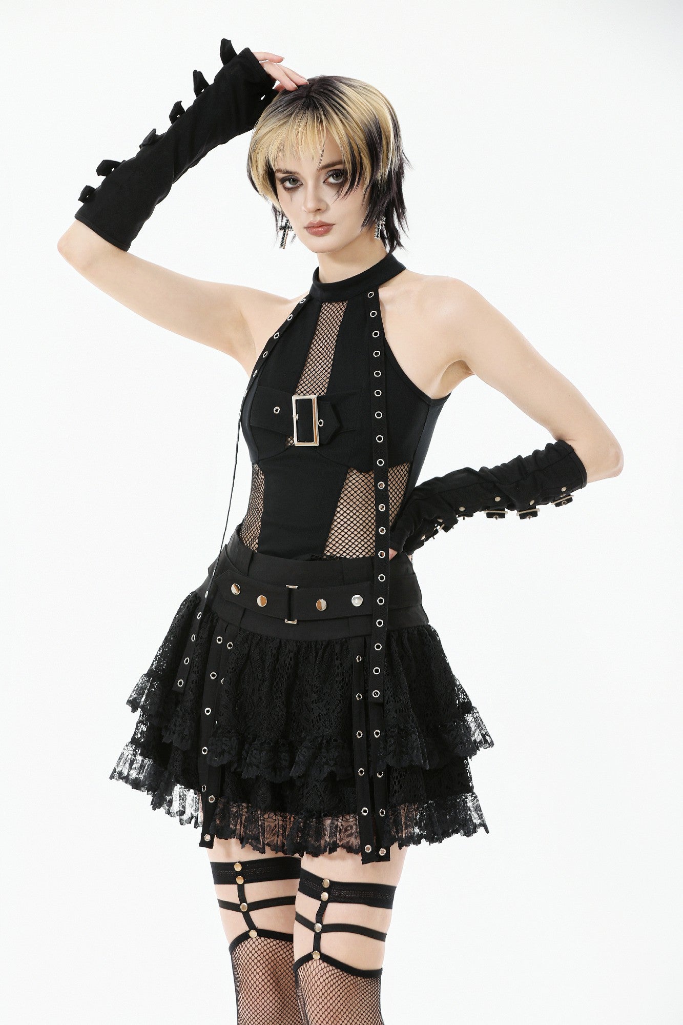 This punk knit top combines mesh and knit fabrics in a striking patchwork design. The center front features a mesh cutout framed with grommet webbing, while additional mesh panels at the waist sides enhance the edgy, see-through effect. The back fastens with metallic mushroom buttons, blending function with detail. Slim-fitting and versatile, this piece is perfect for punk street style or bold performance looks.