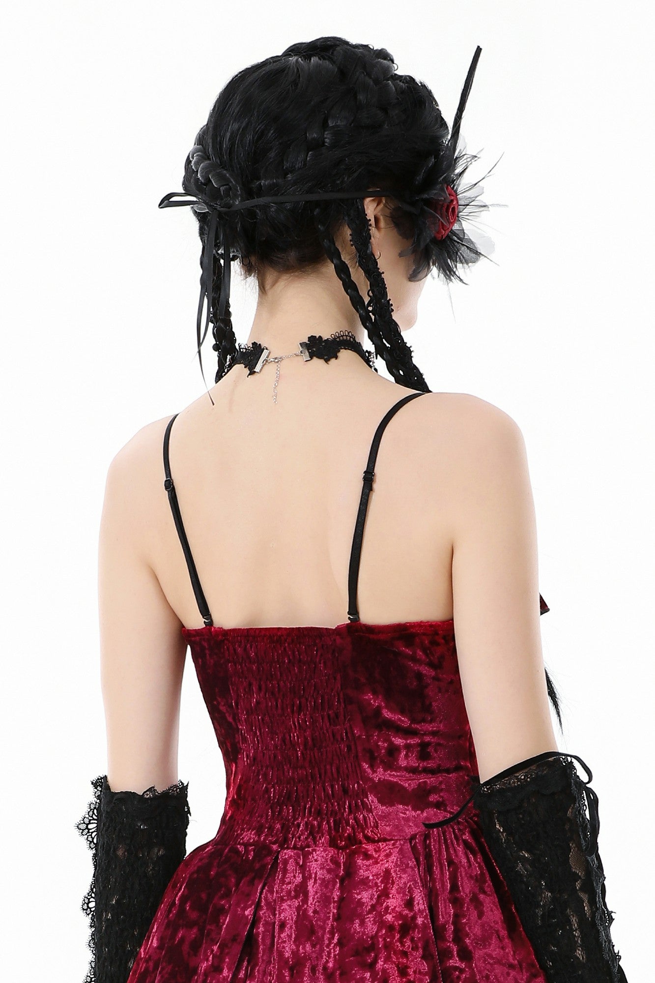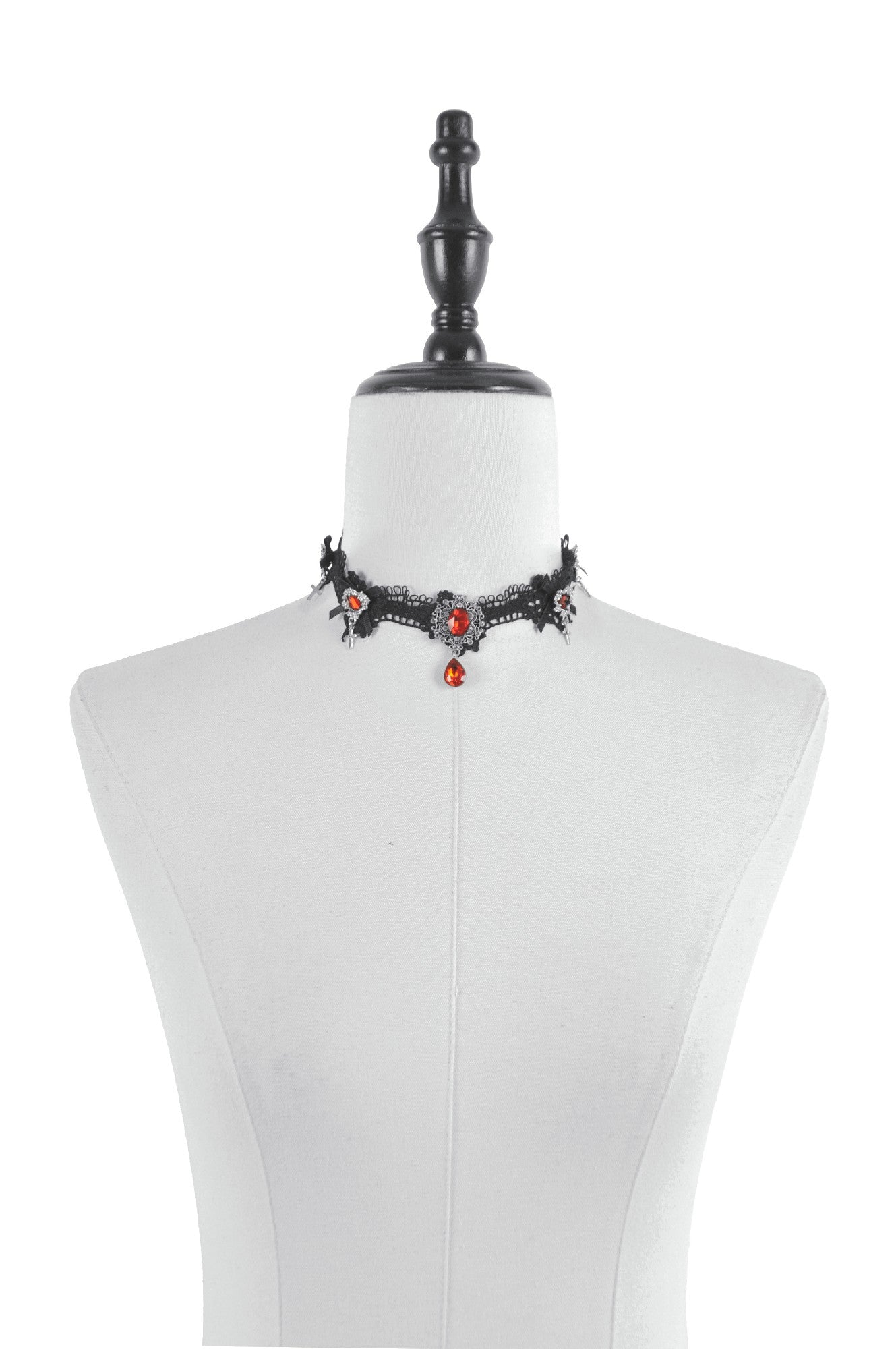 A gothic relic of beauty and sorrow—this black lace choker wraps the neck in delicate darkness. Embellished with blood-red faux gemstones and antique silver accents, it curves in a soft wave that flatters the neckline and commands attention.
