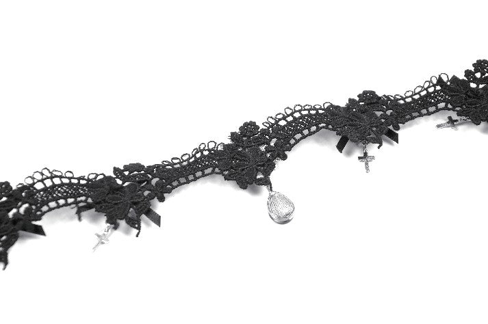 Dangling from the center is a teardrop gem, like a sacred wound. Miniature crosses blend into the design, echoing a silent prayer whispered through time. Whether worn with corsets, low-cut dresses, or layered gothic ensembles, this piece adds both gravitas and glamour.
