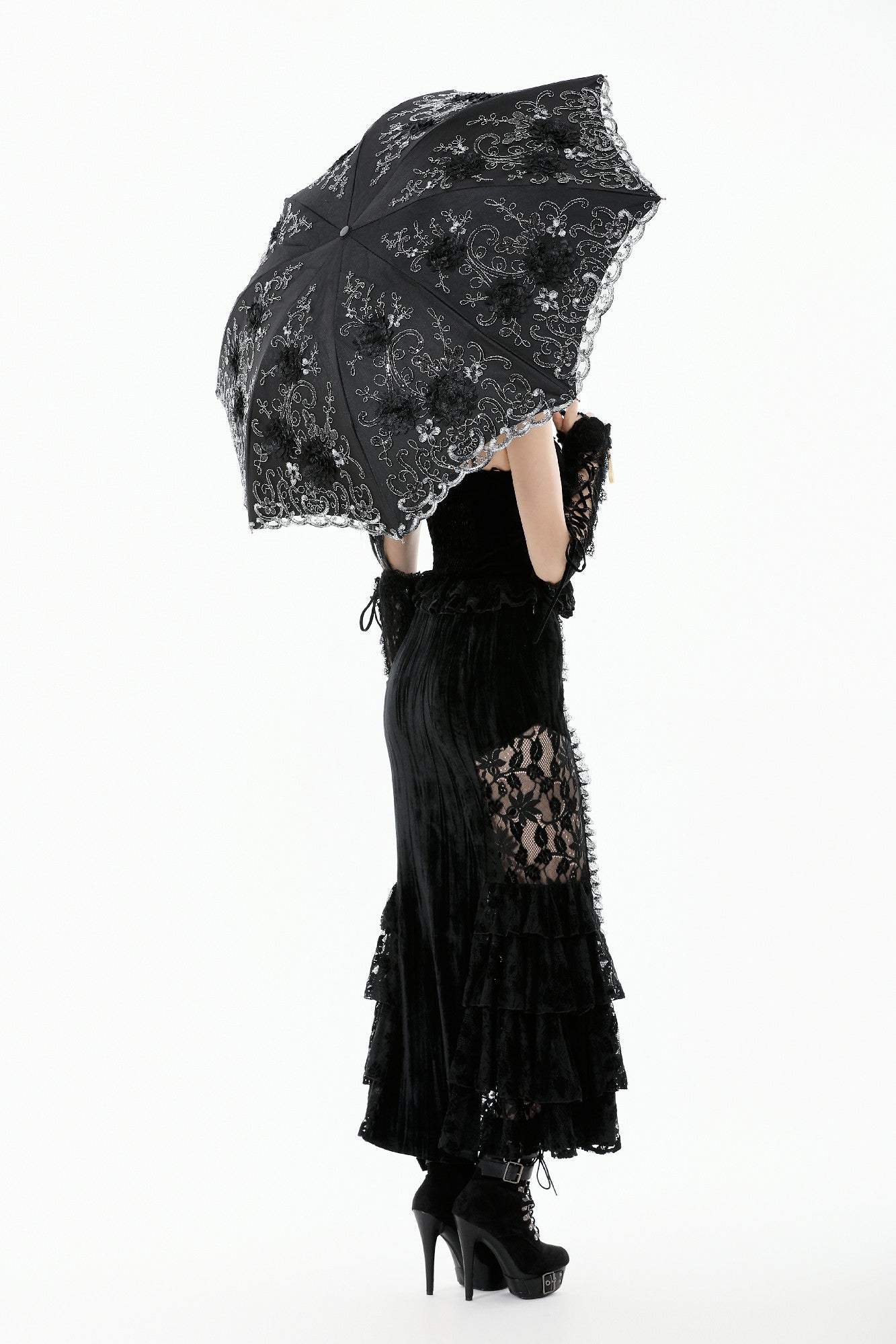This Lolita-style luxurious parasol features a double-layer design: the outer layer is delicate embroidered mesh for a dreamy, elegant touch, while the inner layer is a practical sunshade fabric with UV protection. The umbrella folds into three sections, making it easy to carry while combining practicality with a decorative appeal. Perfect for daily outings, photoshoots, or special gatherings, it highlights a sweet and romantic Lolita aesthetic.