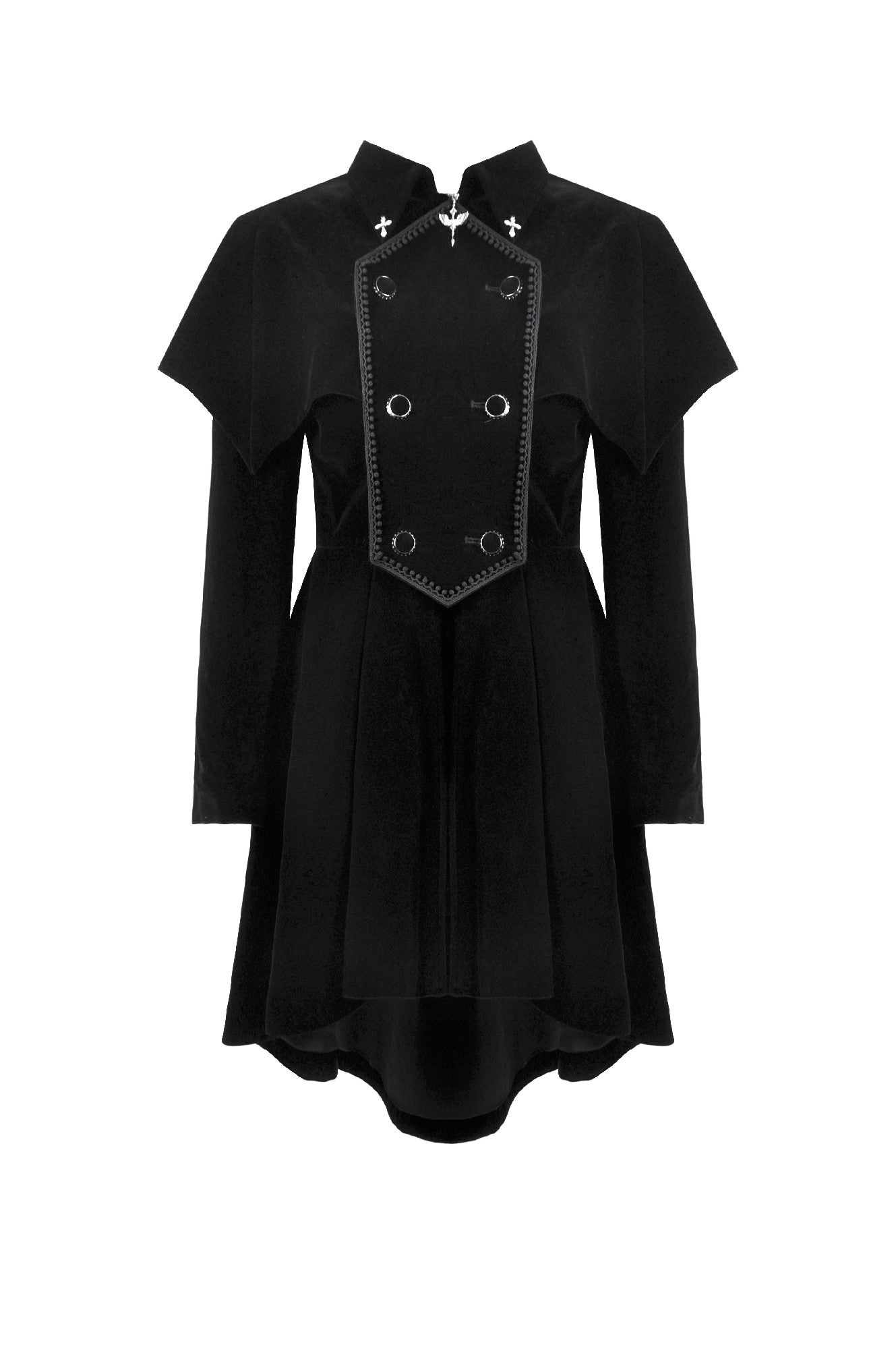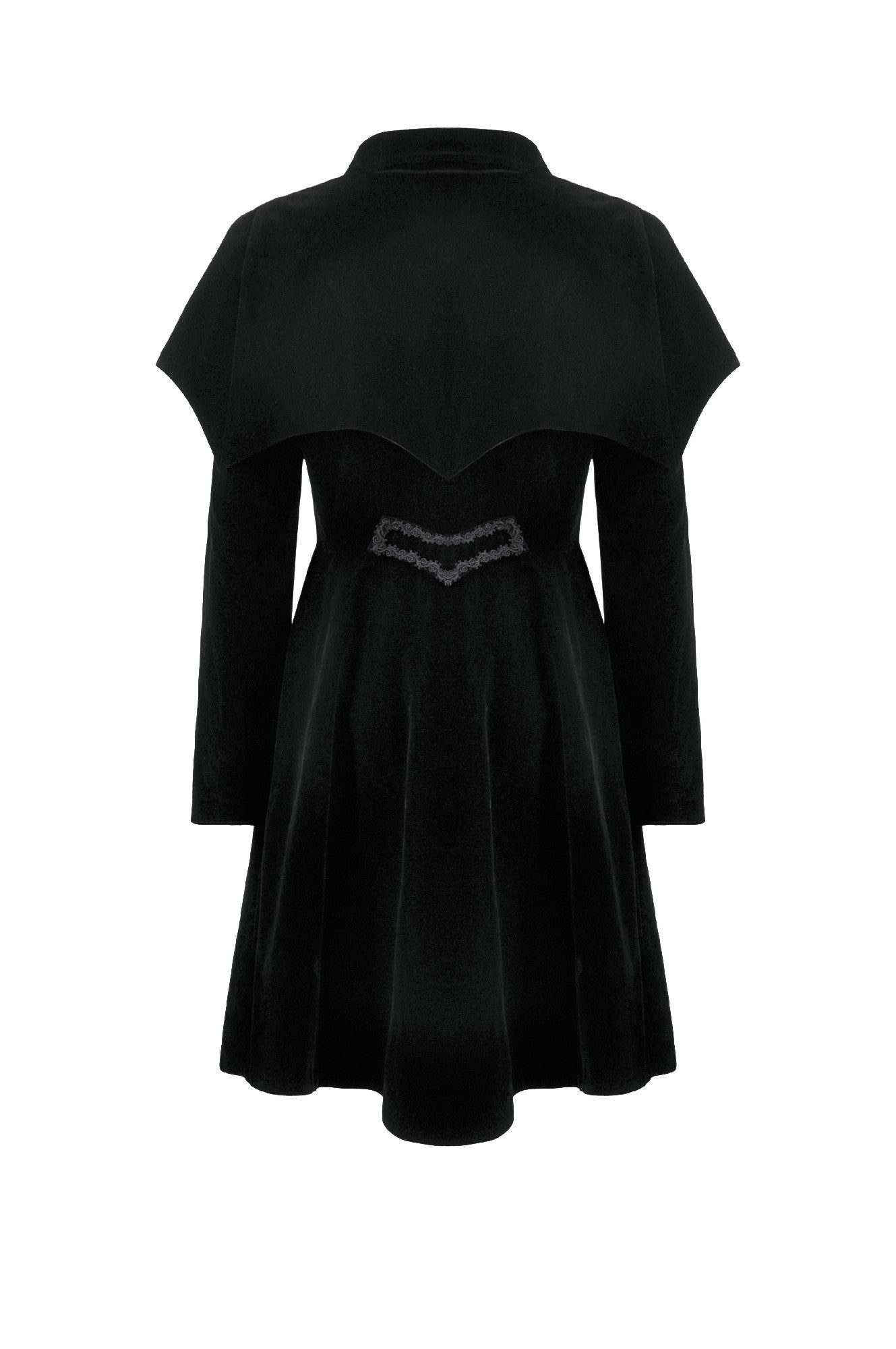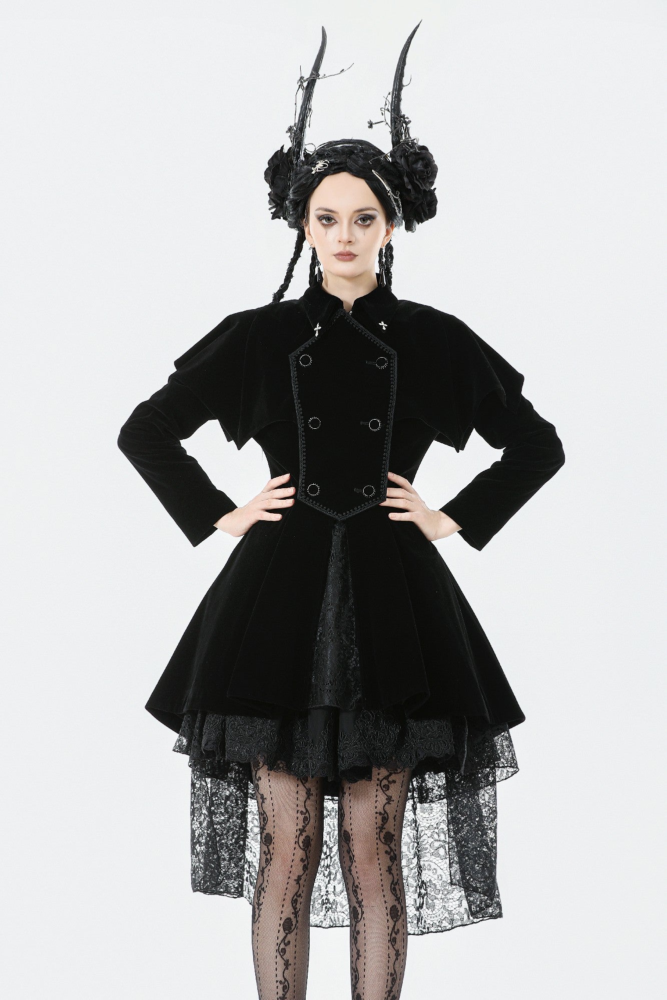 Inspired by witchy Gothic aesthetics, this coat is crafted from luxurious velvet. The bat-wing-shaped cape creates a dramatic faux two-piece design, enhancing its dark elegance. A double-breasted front is adorned with lace-trimmed lapels, while additional lace details decorate the cuffs, buttons, and pleated hem for a richly layered look. Perfect for Gothic daily wear or special occasions, this coat embodies both mystery and sophistication.